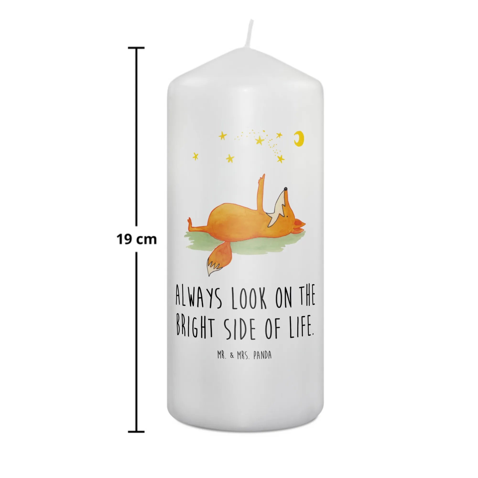 Die Kerze hat die Maße 290 mm x 80 mm und besteht aus hochwertigem Paraffinwachs, das nicht nur gut riecht, sondern auch eine ultralange Brenndauer bietet. Das liebevoll gestaltete Motiv zeigt einen süßen Fuchs, der auf dem Rücken liegt und fasziniert in den Sternenhimmel schaut. Dieses Motiv spricht vor allem Menschen an, die das Träumen lieben und gerne Zeit in der Natur verbringen. Neben schönen Designs bietet die Kerze auch eine kleine Botschaft: "Always look on the bright side of life." Diese positiven Worte können jedem helfen, die kleinen Freuden des Lebens zu erkennen und zu schätzen.