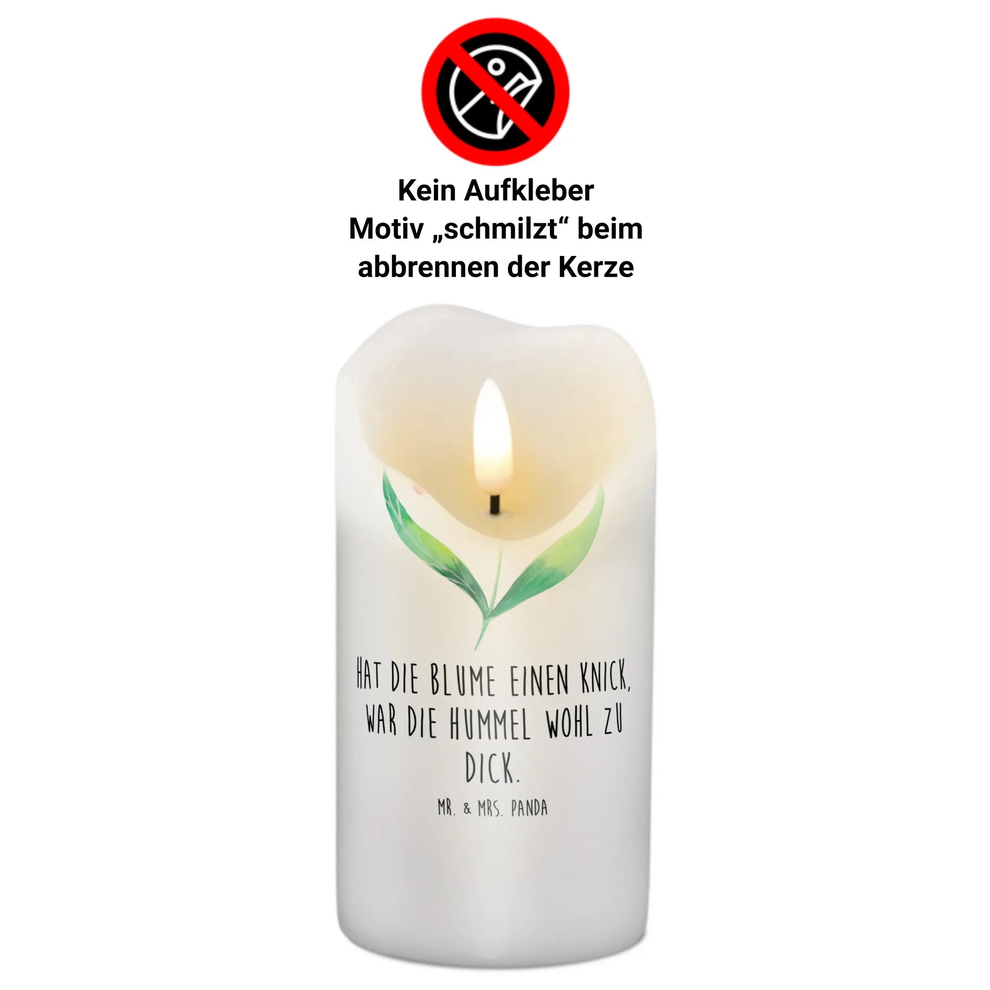 Durch ihre ultralange Brenndauer ist sie nicht nur ein echter Hingucker, sondern sorgt auch für stimmungsvolle Stunden. Und das Beste? Ihr einzigartiges Design schmilzt beim Abbrennen der Kerze, sodass du noch lange Freude daran hast. Der Spruch "Hat die Blume einen Knick, war die Hummel wohl zu dick." fügt der Kerze einen humorvollen Touch hinzu und macht sie zu einem originellen Geschenk.