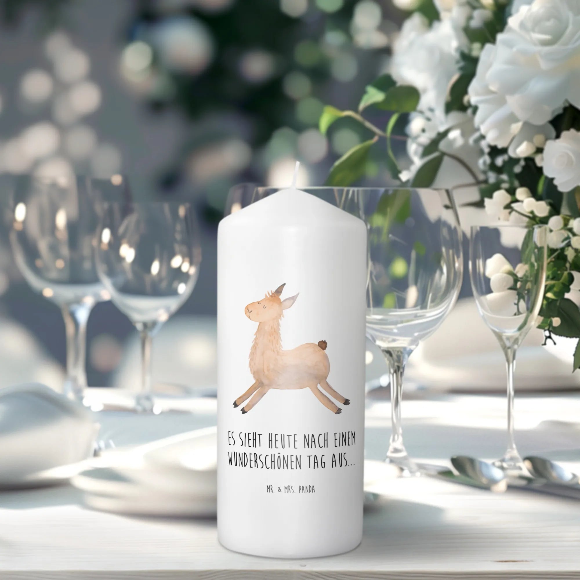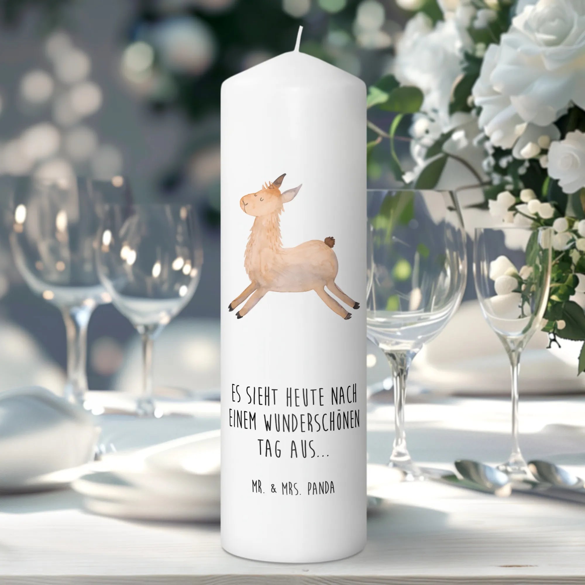 Entdecke die zauberhafte Taufkerze Lama springend von Mr. & Mrs. Panda! Diese edle und wunderschöne Kerze ist nicht nur ein toller Blickfang, sondern auch ein perfektes Geschenk für unvergessliche Anlässe.