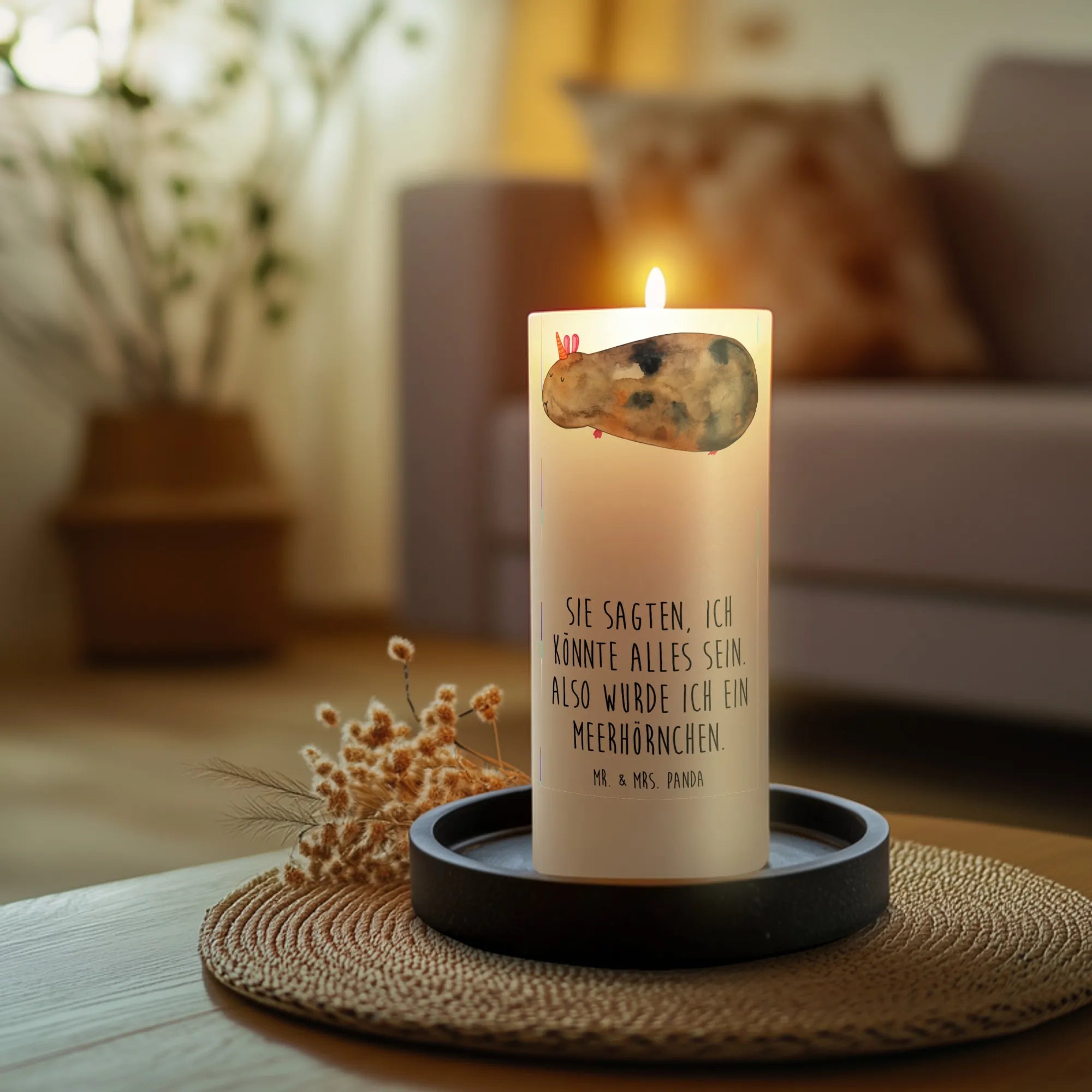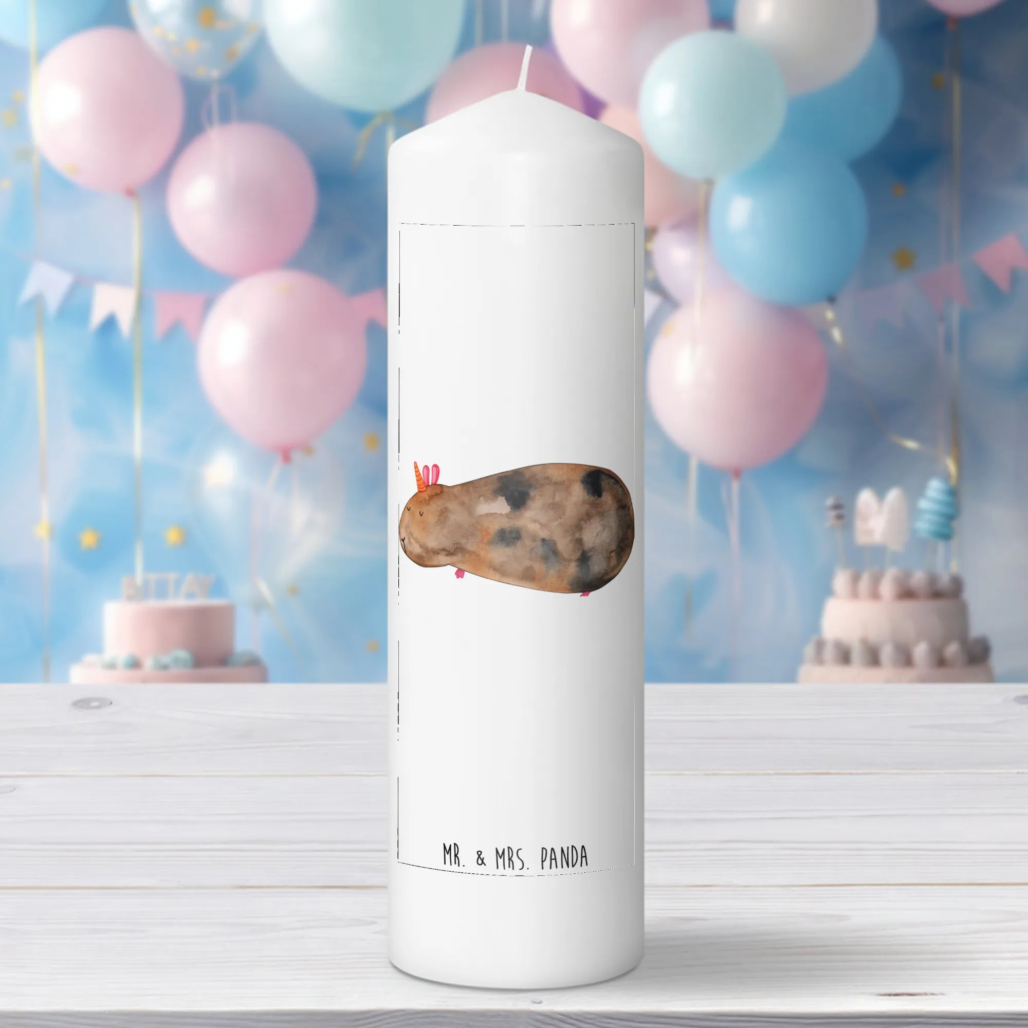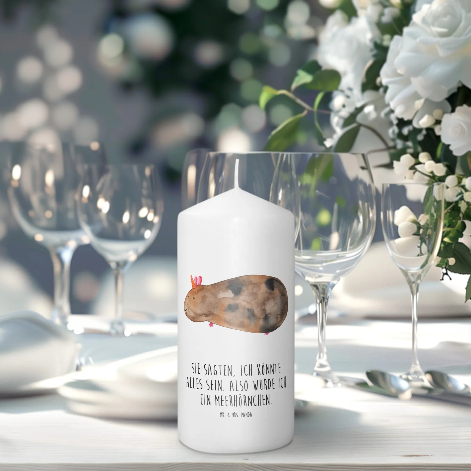 Mit den Maßen von 190 mm x 80 mm passt sie perfekt in jedes Zuhause und bringt fröhliche Stimmung in jeden Raum. Du kannst diese besondere Kerze zu vielen Anlässen verschenken, sei es zur Taufe, zur Kommunion, zum Geburtstag oder einfach als kleine Aufmerksamkeit für einen lieben Menschen. Das niedliche Meerhörnchen, das von Mrs. Panda handgezeichnet wurde, zaubert jedem ein Lächeln ins Gesicht.