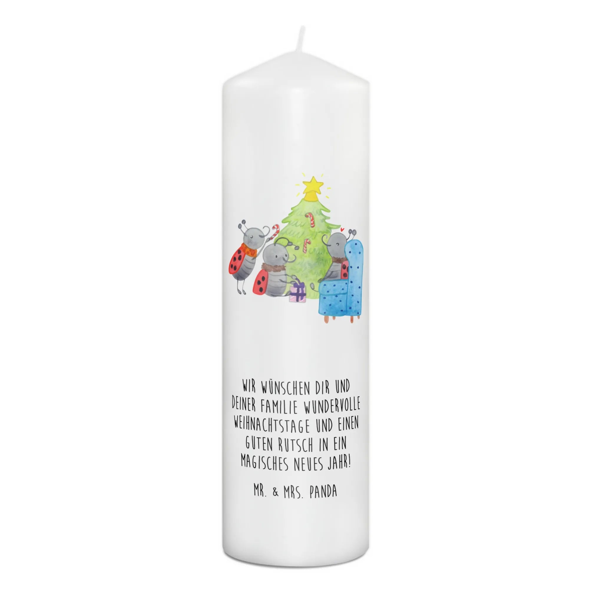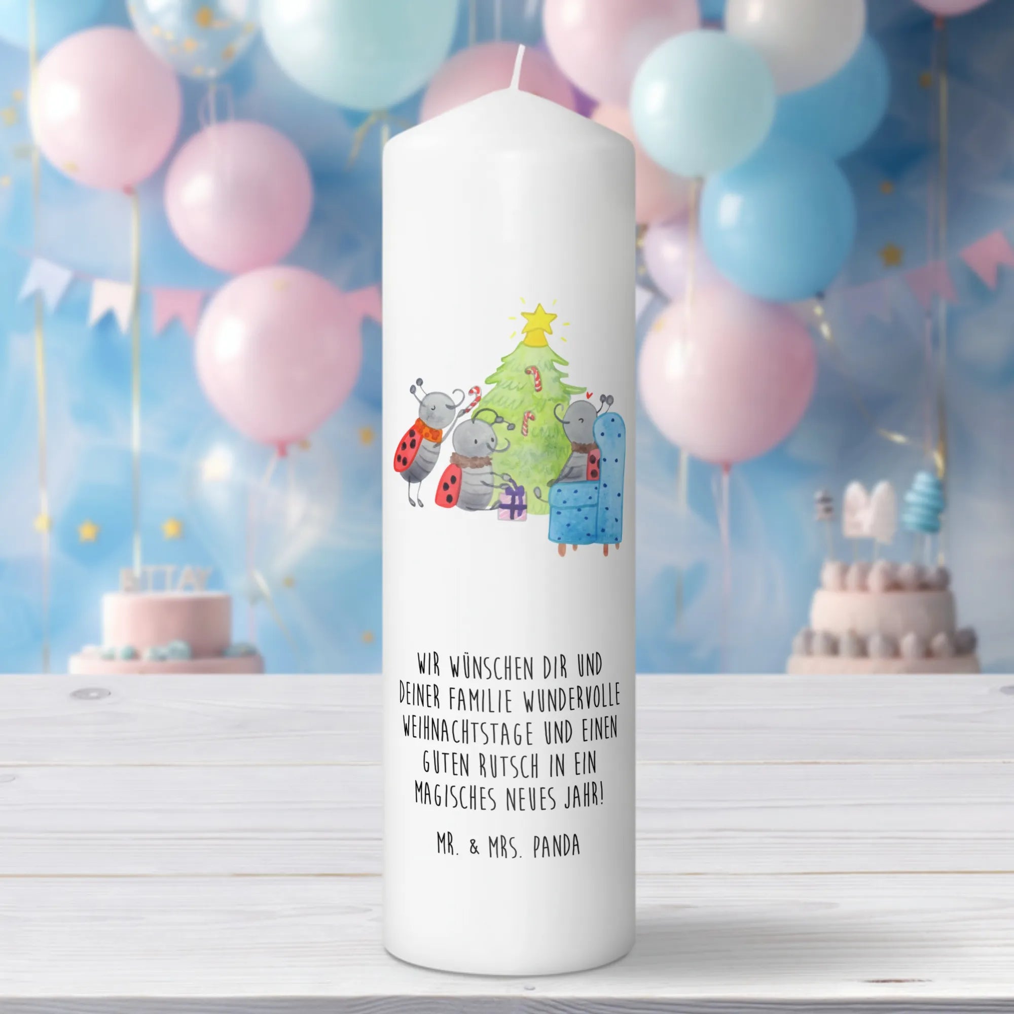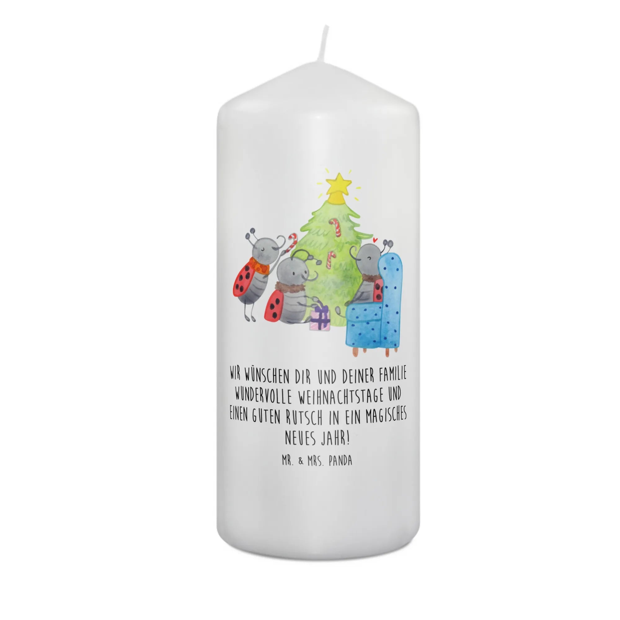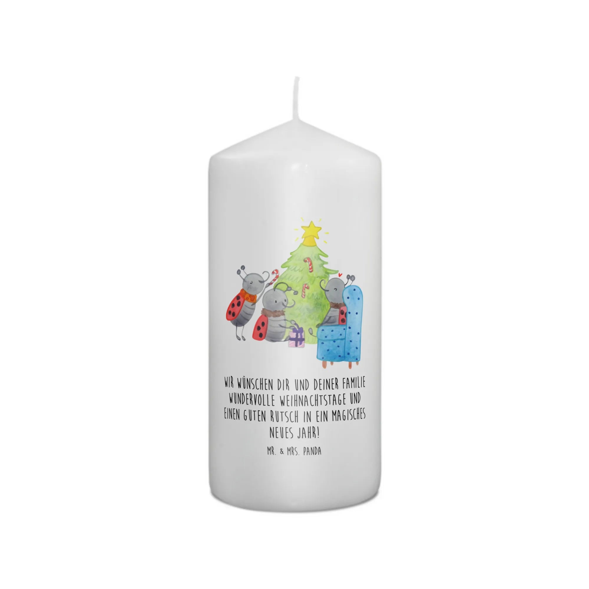 Du schaust auf eine märchenhafte Szene, liebevoll gezeichnet von Mr. & Mrs. Panda. Es ist weihnachtlich, es ist gemütlich und es weckt Kindheitserinnerungen. Du siehst drei Marienkäfer um einen Tannenbaum herum - sie sind eifrig, sie sind glücklich. Mit Pfefferminzstangen schmücken sie ihren Baum, legen Geschenke darunter und schaffen ein echtes Weihnachtswunderland. Man kann fast den Duft von Tannennadeln und Pfefferminz in der Luft riechen.