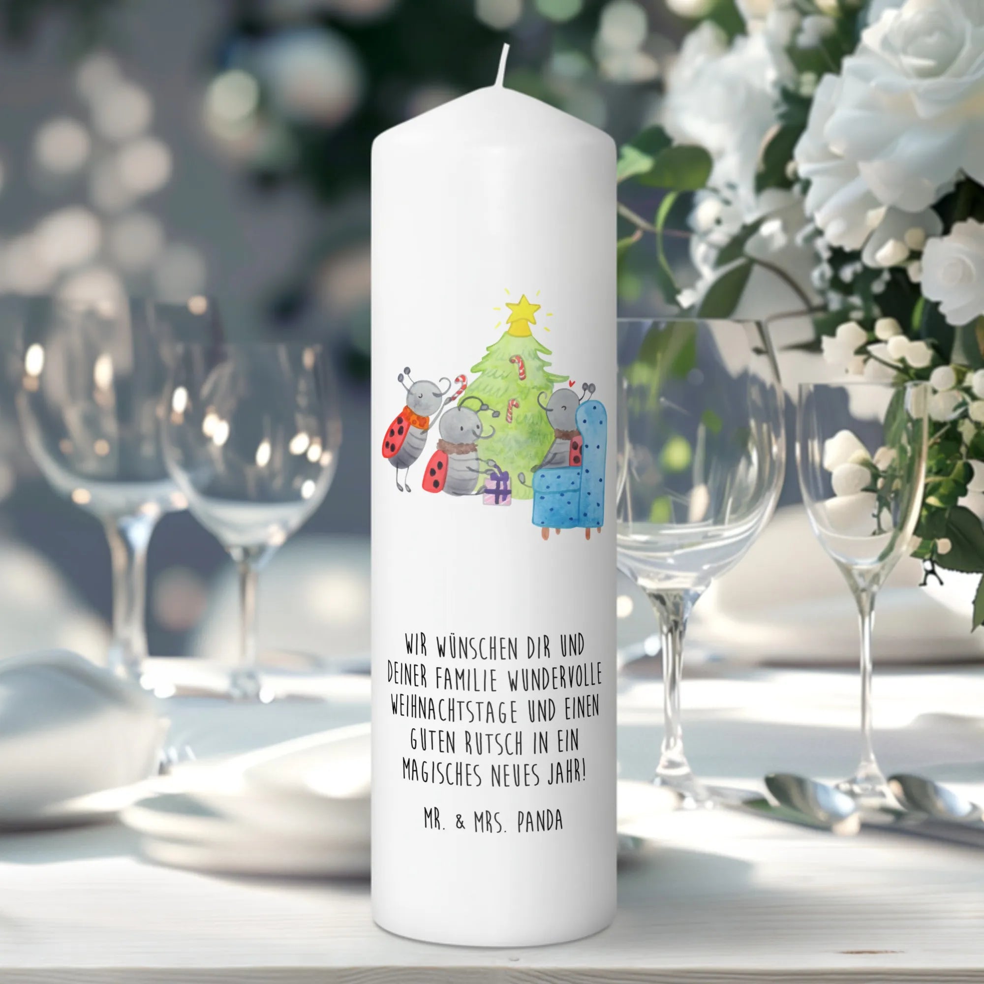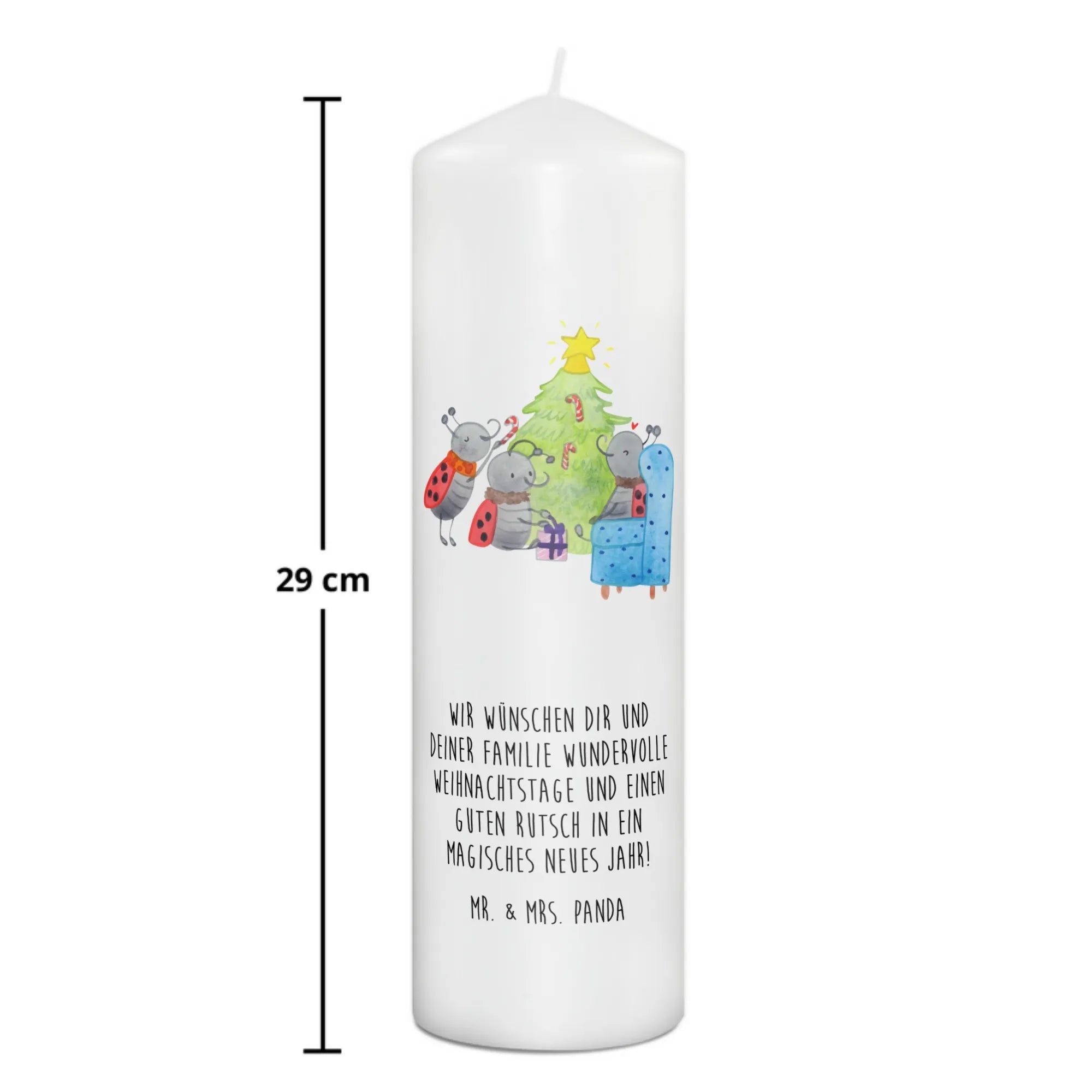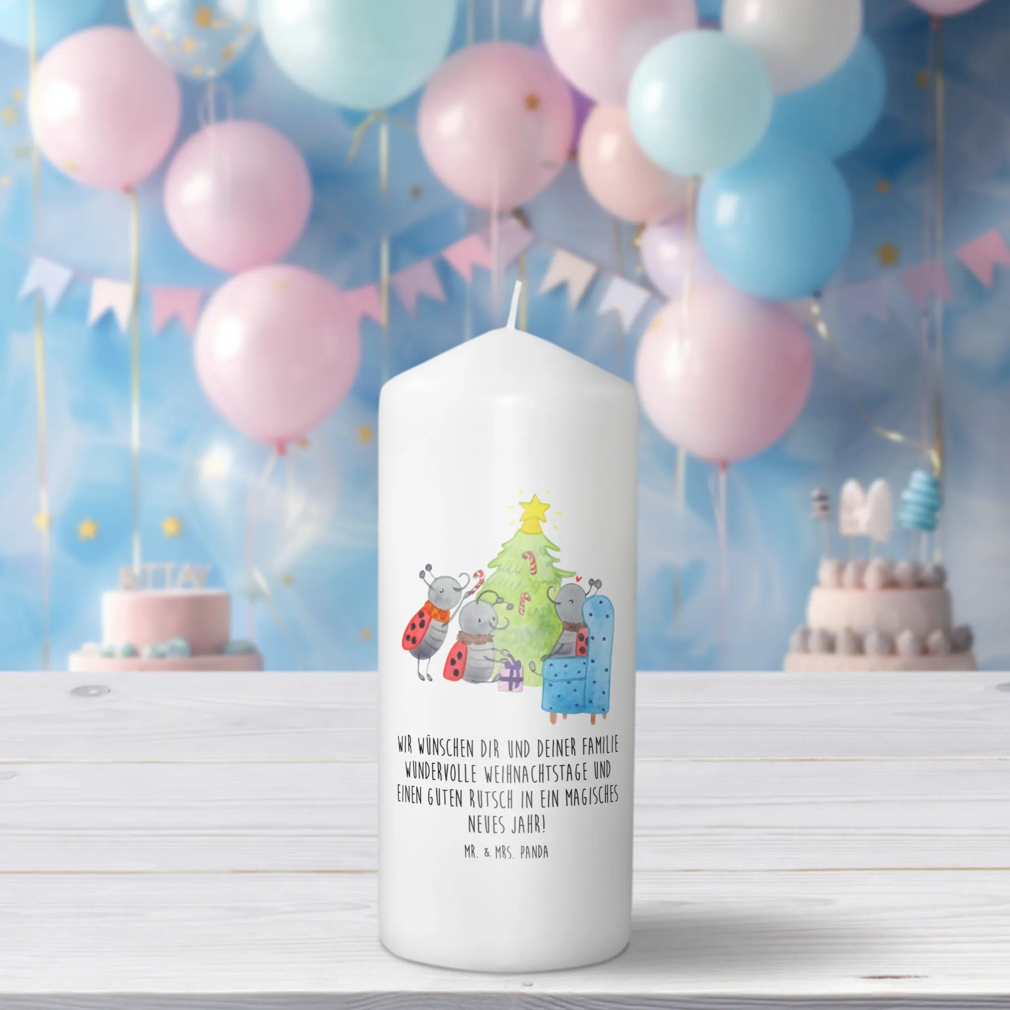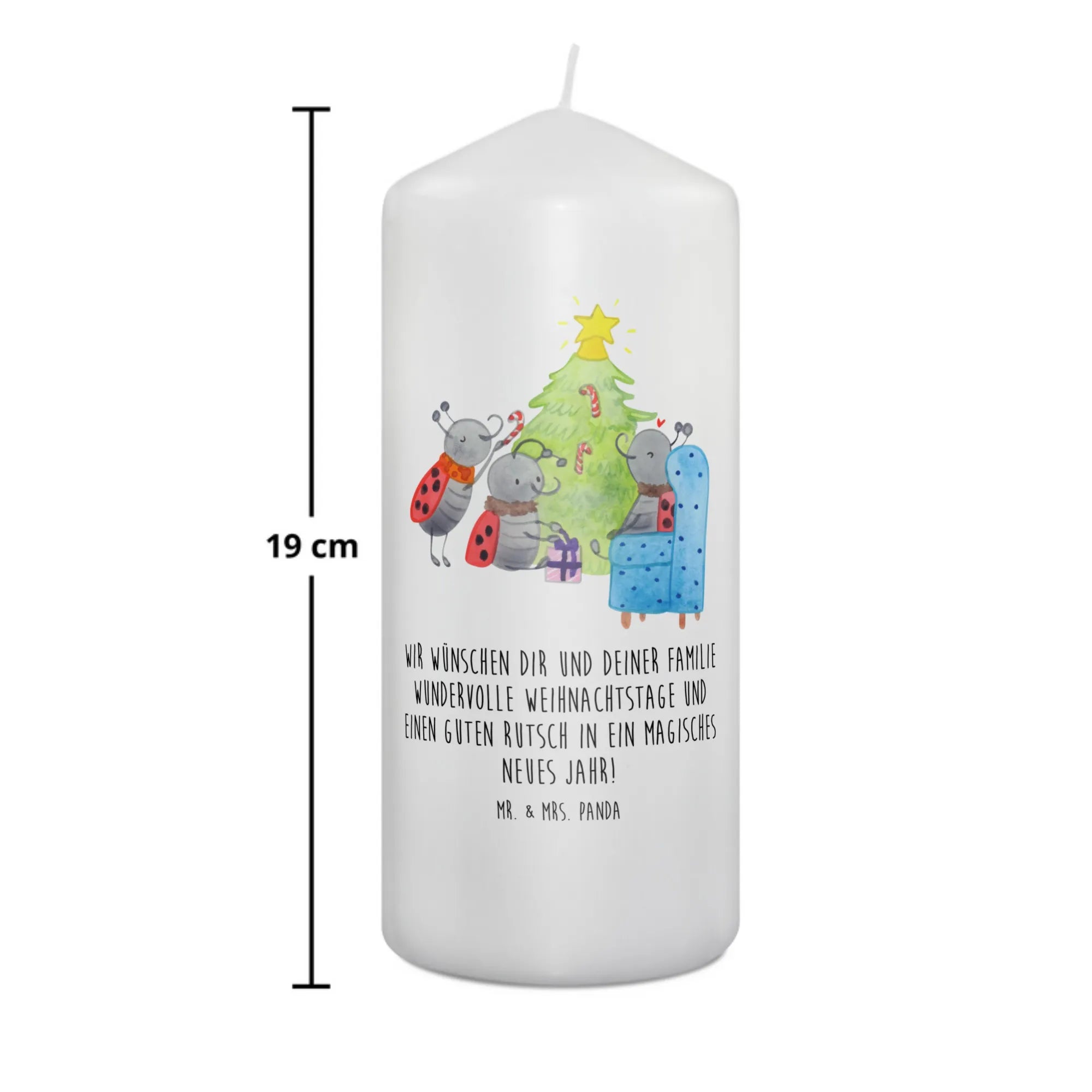 Du schaust auf eine märchenhafte Szene, liebevoll gezeichnet von Mr. & Mrs. Panda. Es ist weihnachtlich, es ist gemütlich und es weckt Kindheitserinnerungen. Du siehst drei Marienkäfer um einen Tannenbaum herum - sie sind eifrig, sie sind glücklich. Mit Pfefferminzstangen schmücken sie ihren Baum, legen Geschenke darunter und schaffen ein echtes Weihnachtswunderland. Man kann fast den Duft von Tannennadeln und Pfefferminz in der Luft riechen.