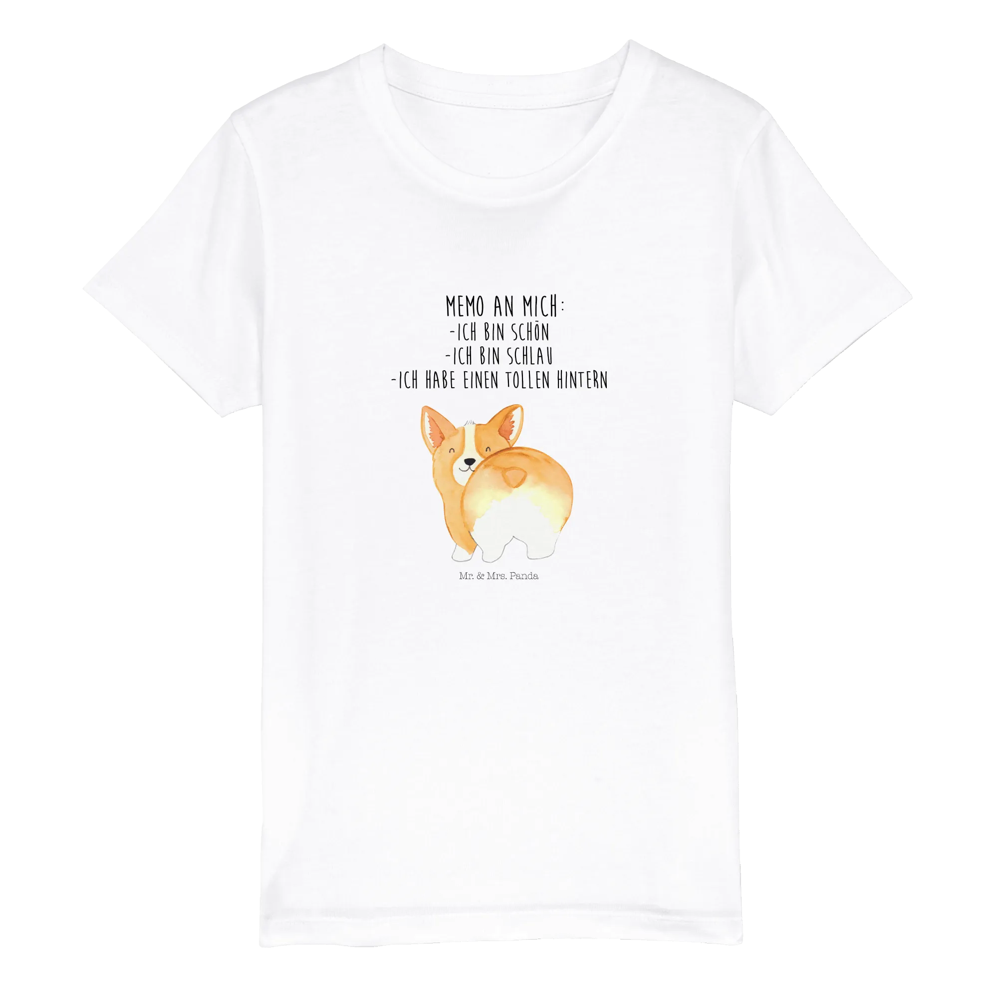 Das Organic Kinder T-Shirt "Corgie Po" aus der wundervollen Hunde Kollektion von Mr. & Mrs. Panda ist das perfekte Geschenk für kleine Tierliebhaber! Mit seinem süßen Corgi-Motiv und dem fröhlichen Slogan "Memo an mich: - ich bin schön, - ich bin schlau, - ich habe einen tollen Hintern" bringt dieses T-Shirt nicht nur Freude, sondern auch eine Portion Selbstliebe in den Alltag Deiner Kleinen.