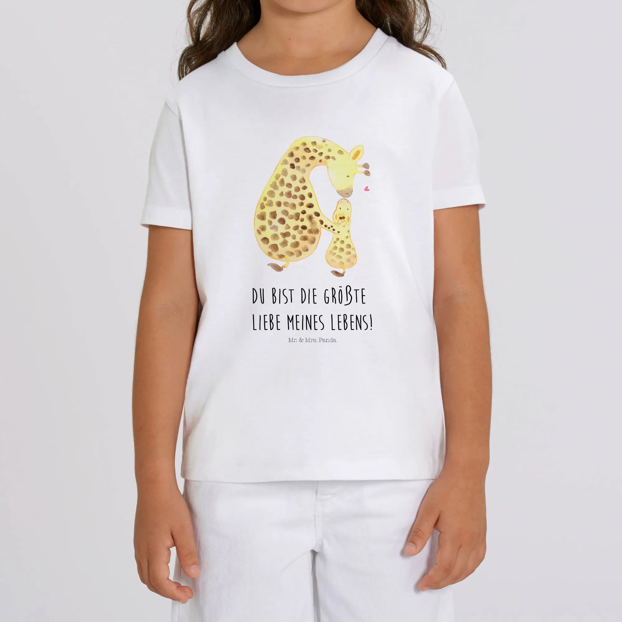 Mit einem süßen Motiv einer Mama Giraffe, die ihr kleines Giraffenbaby zärtlich küsst, zaubert jedes Mal ein Lächeln auf das Gesicht deiner Kleinen. Dieser liebevolle Moment zwischen Mutter und Kind unterstreicht die Botschaft "Du bist die größte Liebe meines Lebens!" und macht dieses Shirt zu einem besonderen Teil der Kindheit.