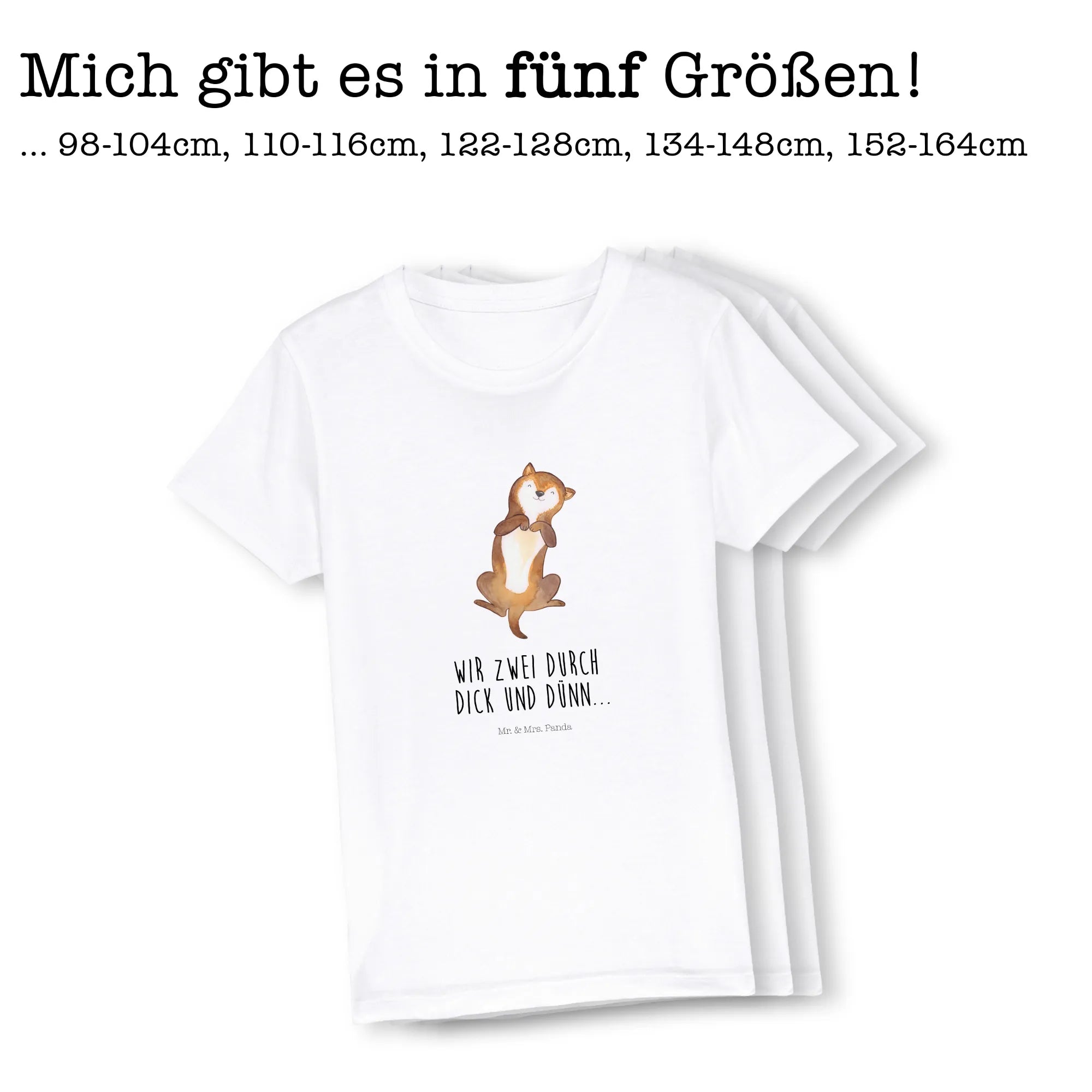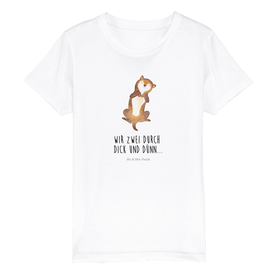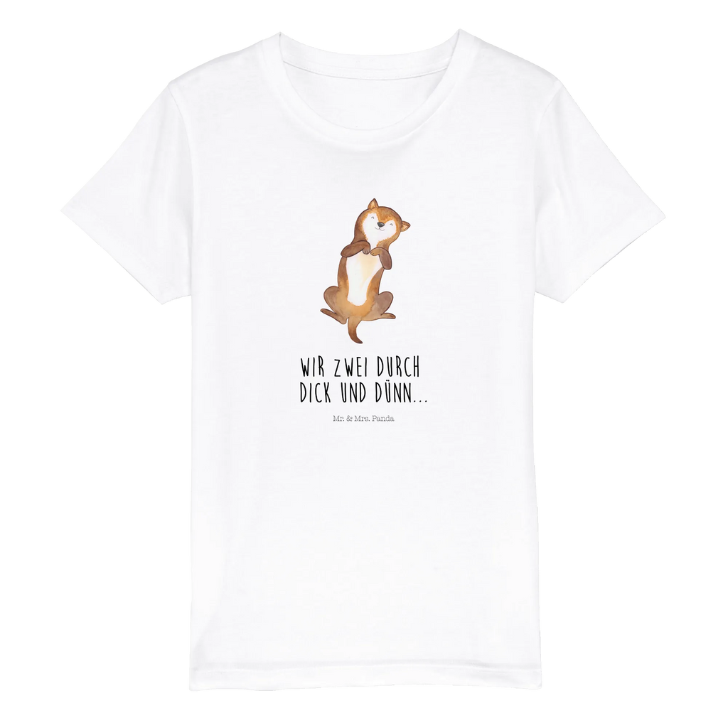 Der niedliche Aufdruck zeigt einen Hund, der freudig auf dem Rücken liegt und seine Bauch-Kraul-Momente genießt. Das Design ist nicht nur niedlich, sondern auch praktisch: Mit einem freundlichen Slogan, der die Verbundenheit zwischen Kind und Hund feiert – "Wir zwei durch dick und dünn..." – ist dieses T-Shirt ein echtes Liebhaberstück. Das ideale Geschenk für kleine Hundefreunde, die es lieben, Zeit mit ihrem vierbeinigen Freund zu verbringen.