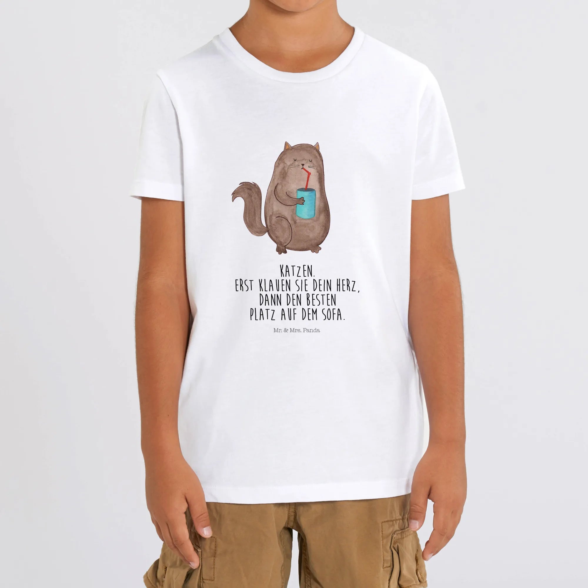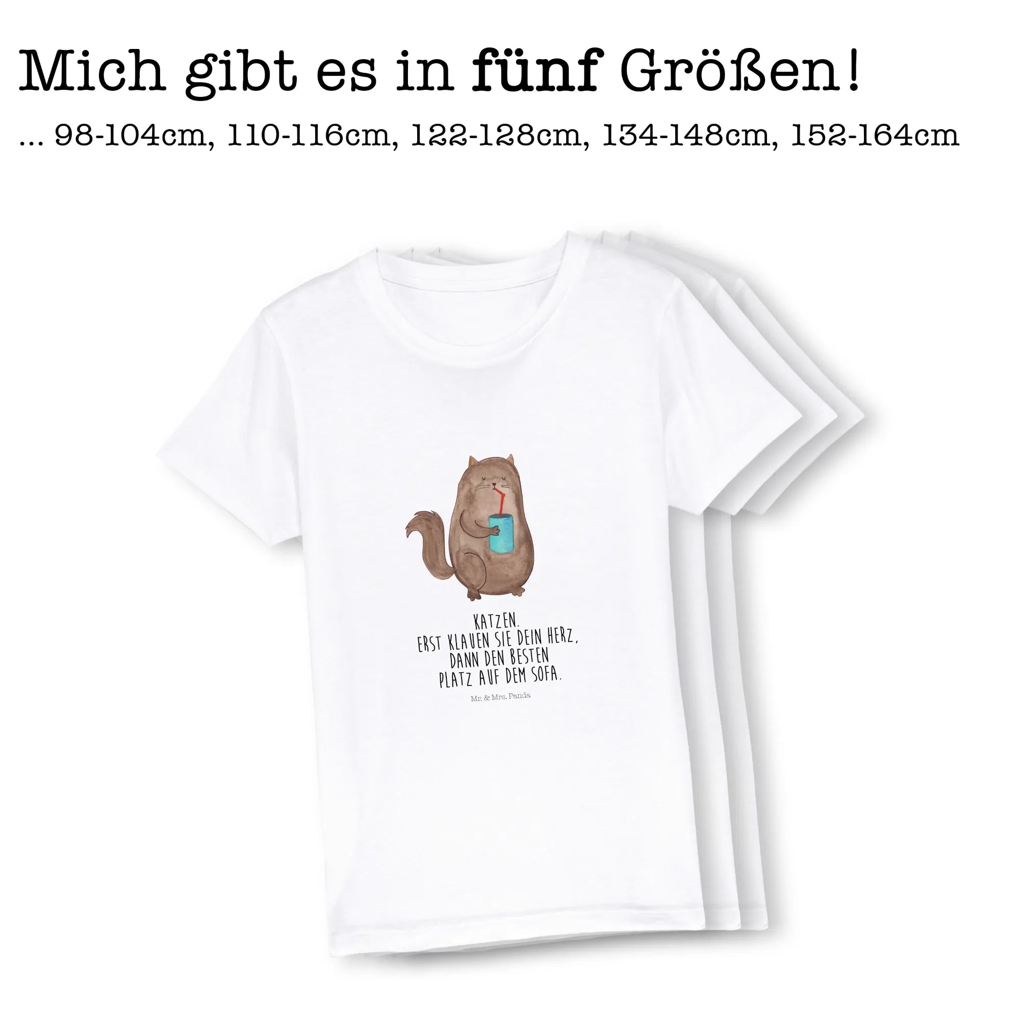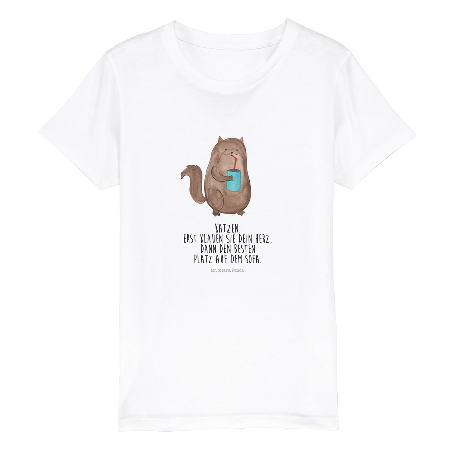 Unser süßes Kinder T-Shirt aus der Katzen - Kollektion von Mr. & Mrs. Panda zeigt eine fröhliche Katze, die genüsslich aus einer Dose trinkt. Das liebevoll handgezeichnete Motiv kombiniert Niedlichkeit und frechen Charme, dazu der Spruch: Katzen. Erst klauen sie dein herz, dann den besten Platz auf dem Sofa. Ein Design, das Kinderaugen leuchten lässt und Erwachsene zum Schmunzeln bringt.