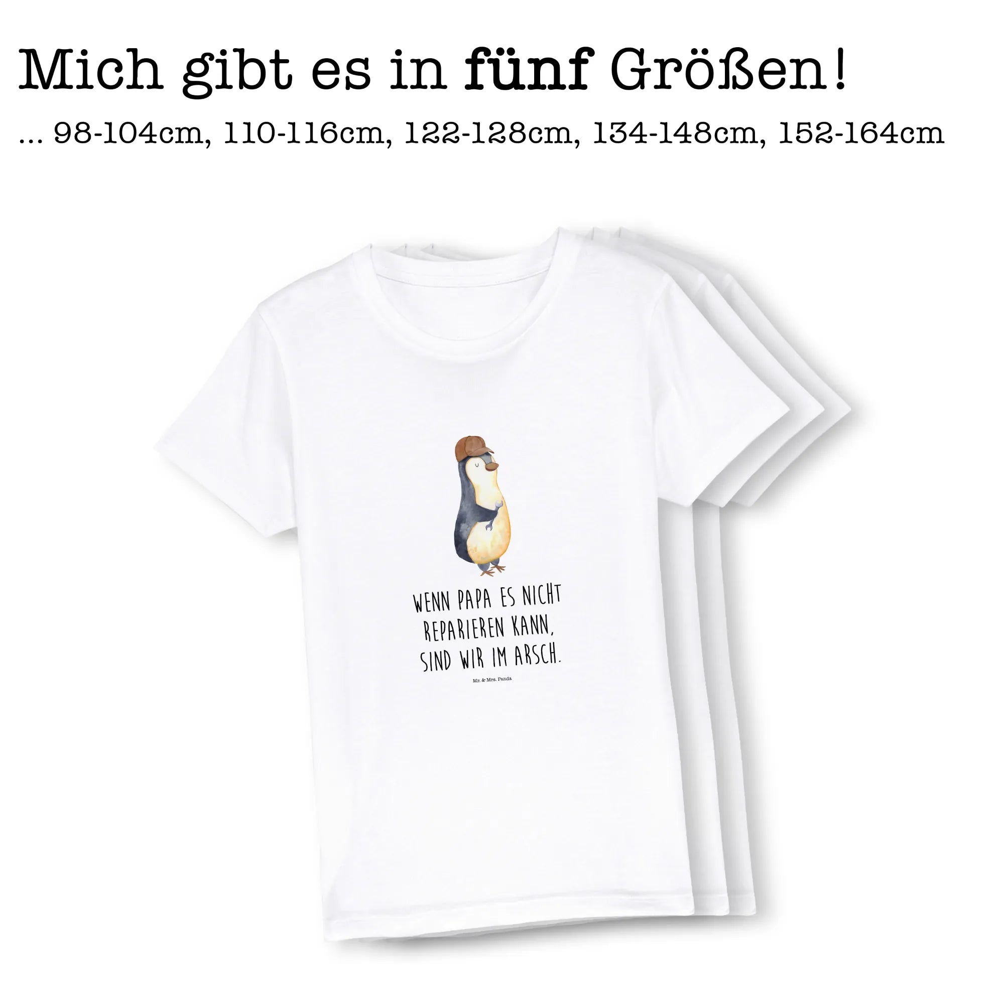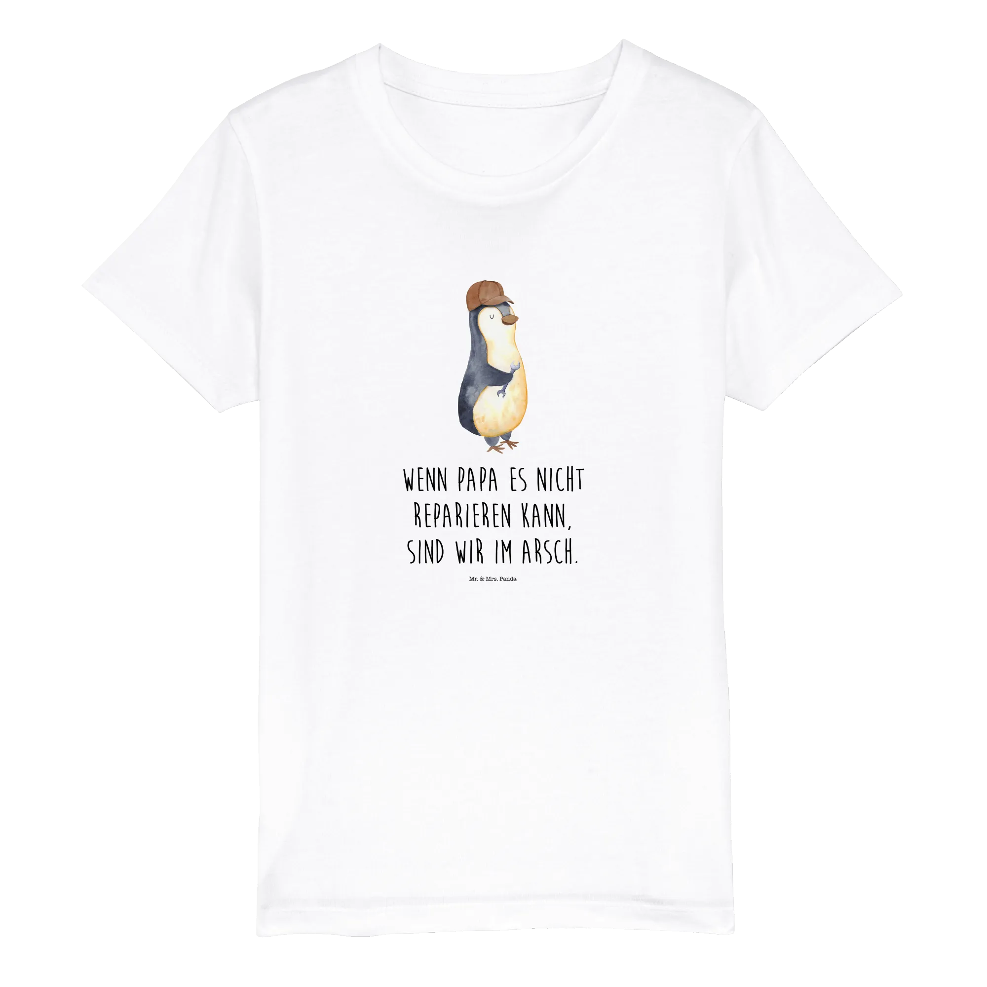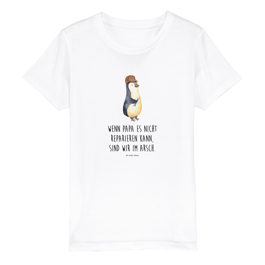 Wunderschönes Organic Kinder T-Shirt von Mr. & Mrs. Panda mit dem frechen Spruch "Wenn Papa es nicht reparieren kann, sind wir am Arsch." – ein herzlicher Mix aus Humor, Liebe und Familiengefühl. Auf dem Shirt ist ein sympathischer Pinguin mit brauner Kappe zu sehen, der einen stilisierten Schraubenschlüssel hält. Das Motiv ist handgezeichnet und versprüht verspielte Leichtigkeit.