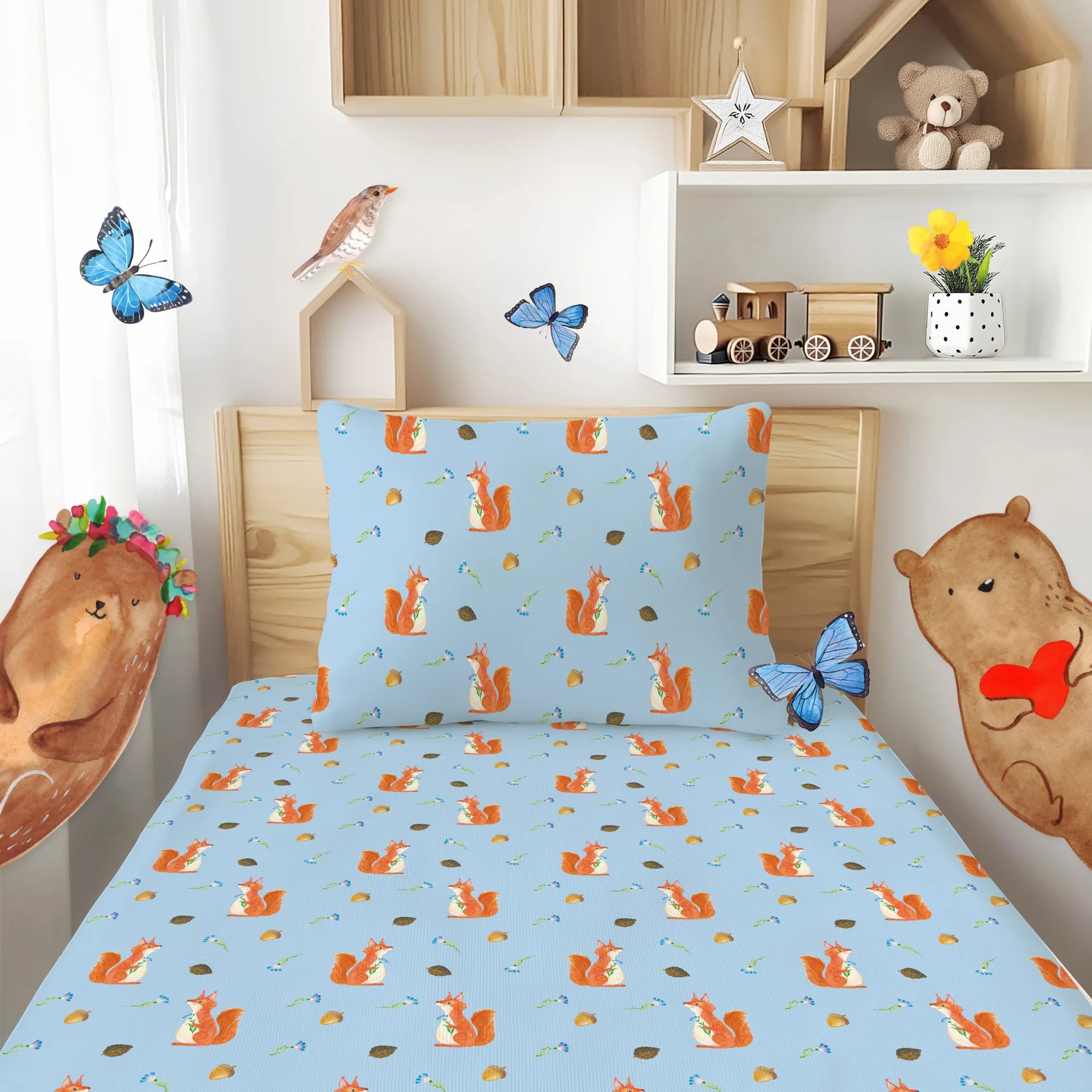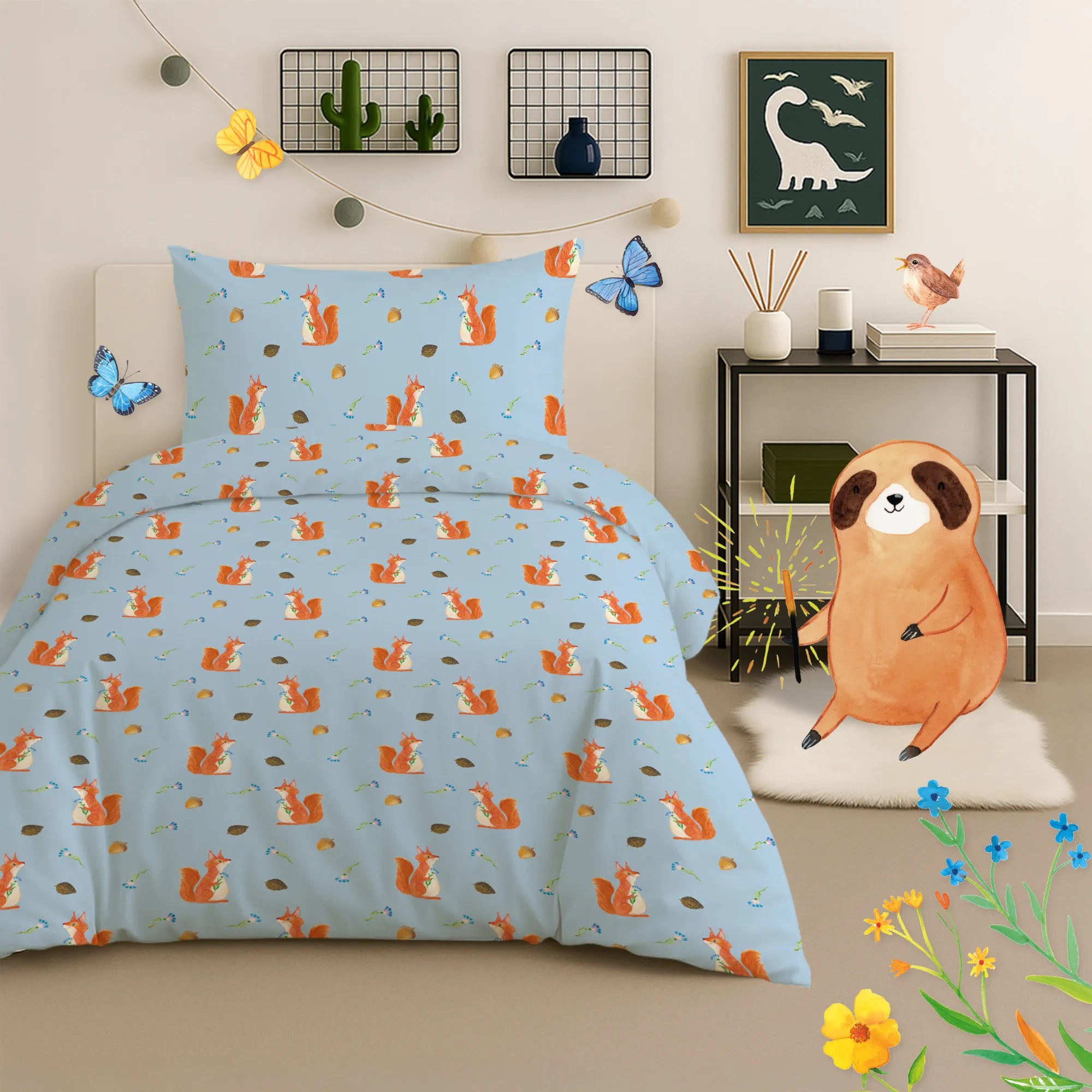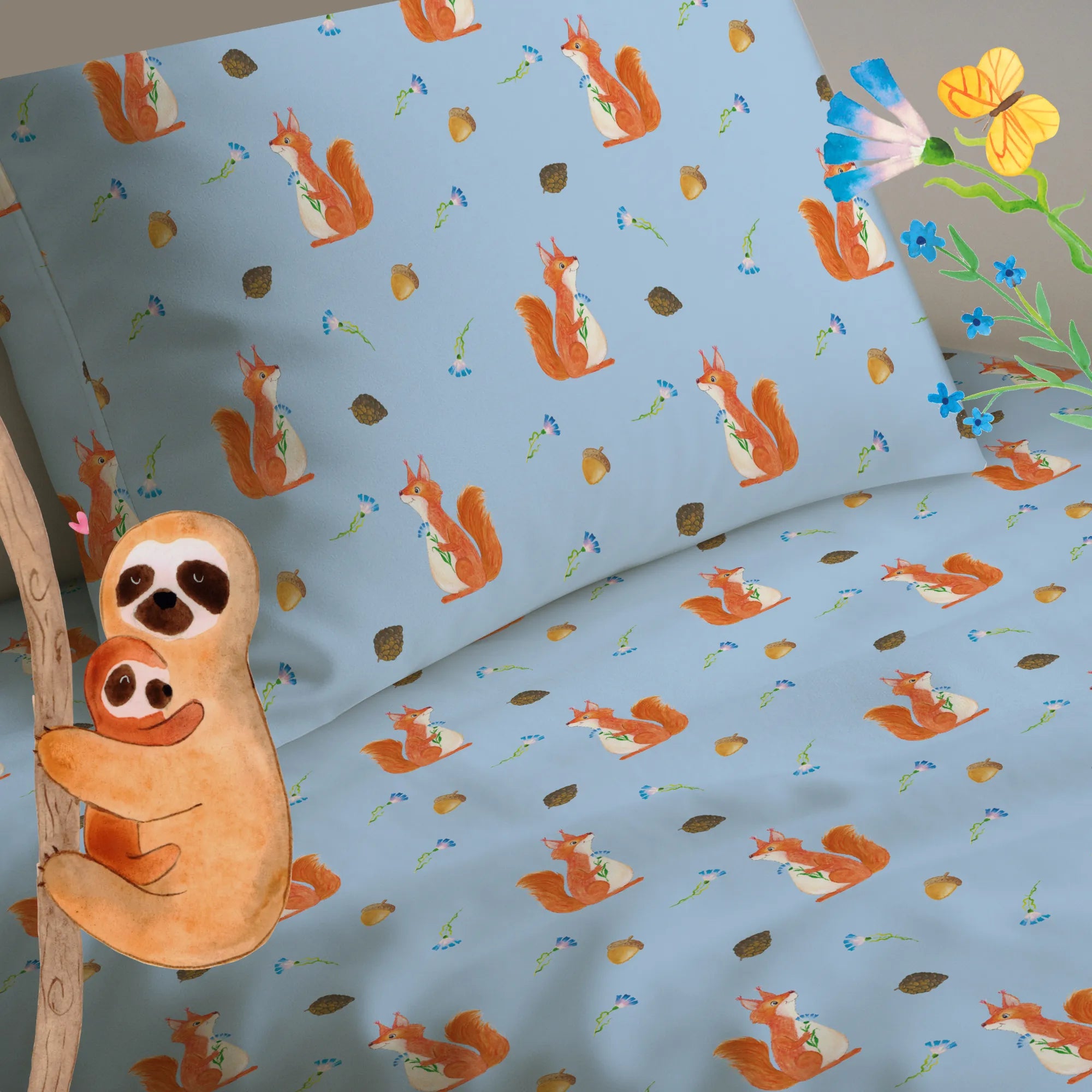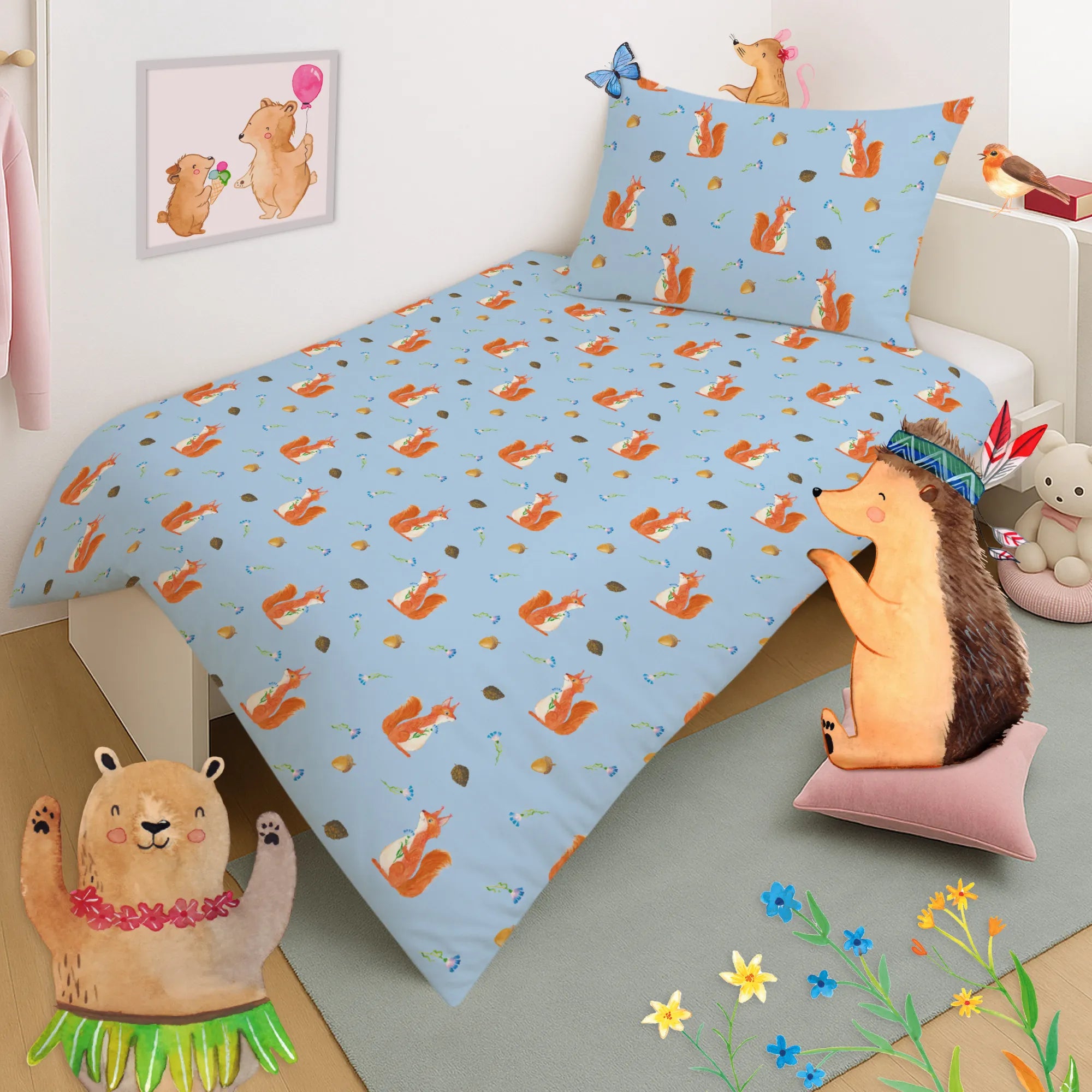 Kinderbettwäsche Eichhörnchen Blume Muster