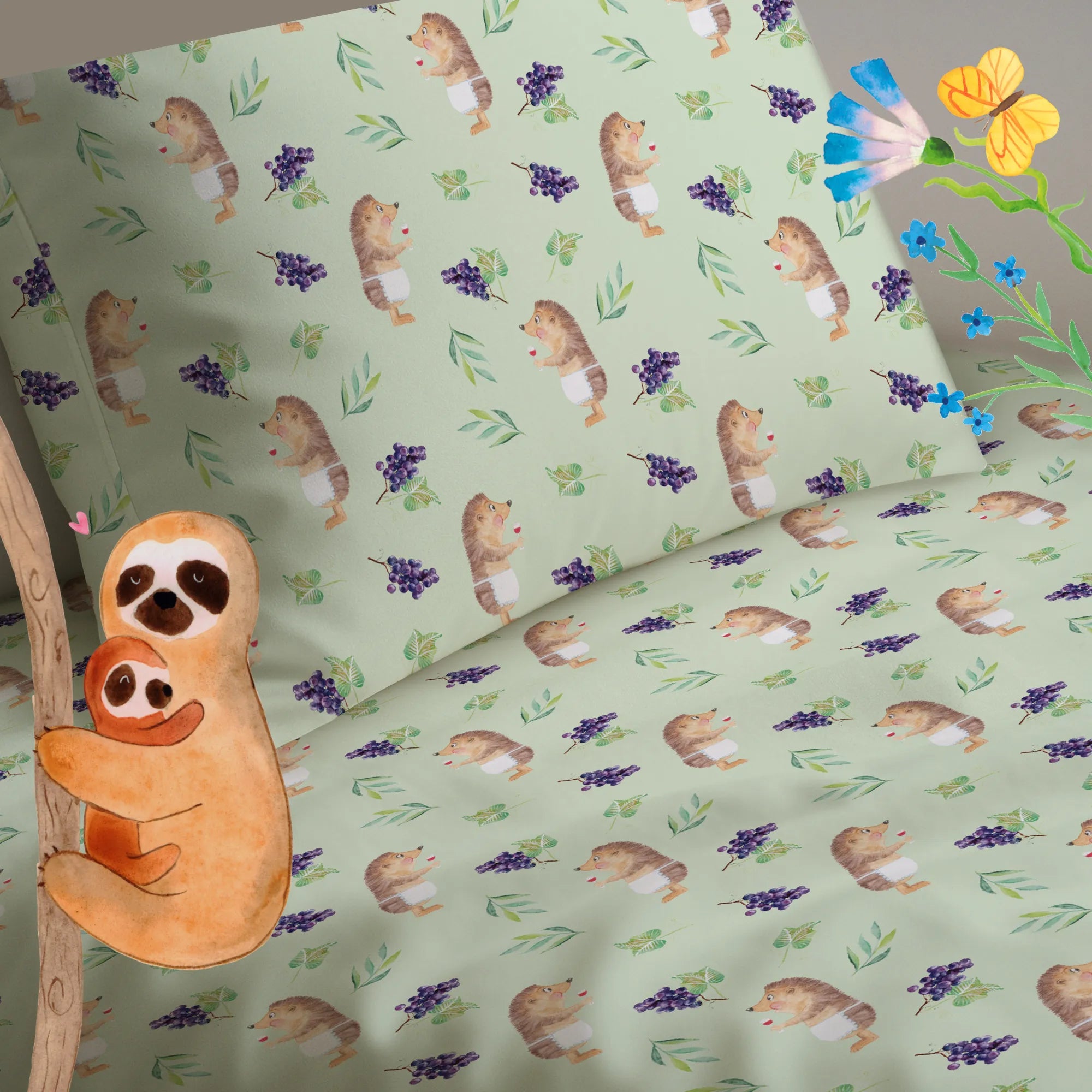 Entdecke unsere Kinderbettwäsche „Igel mit Wein“ aus der Small World Kollektion von Mr. & Mrs. Panda!