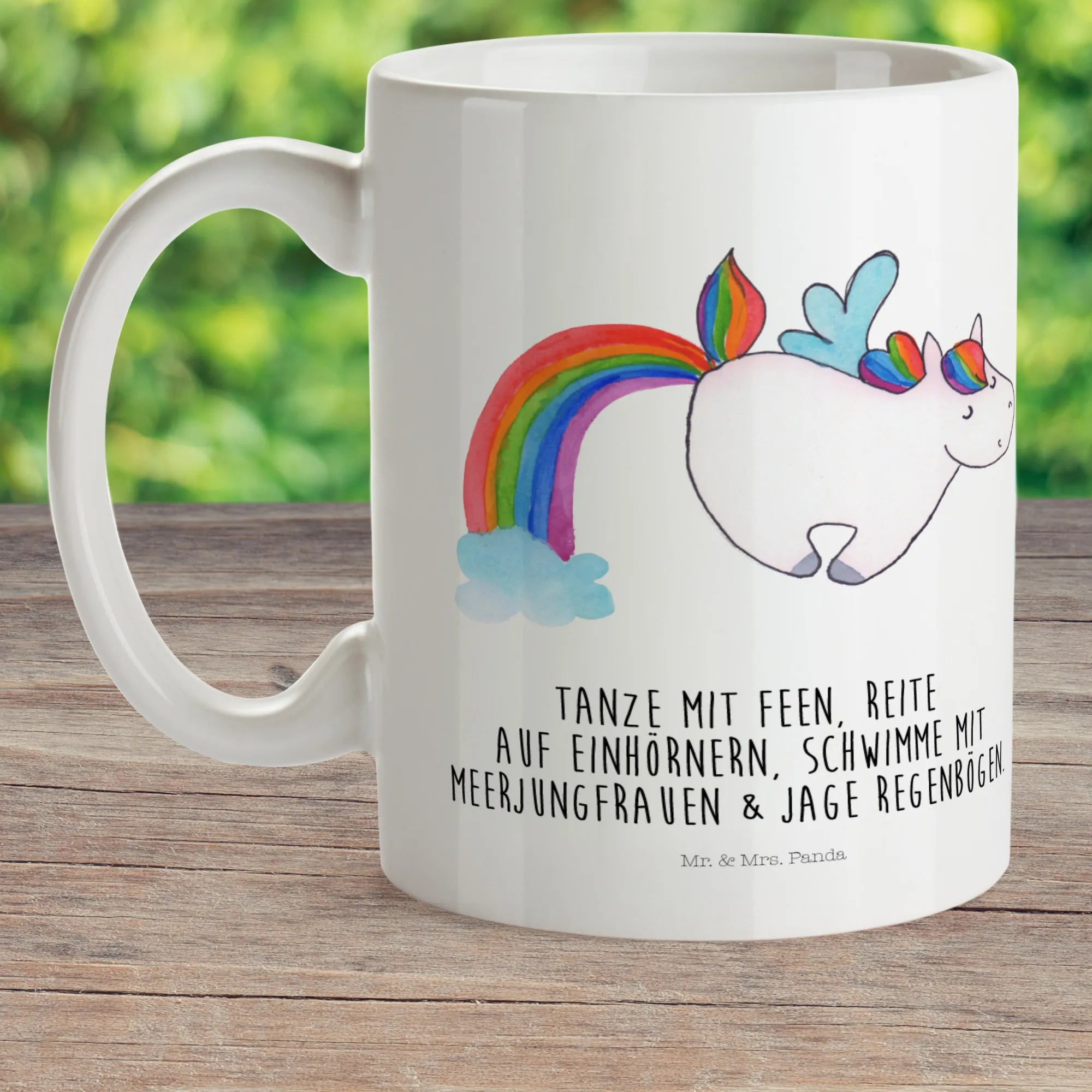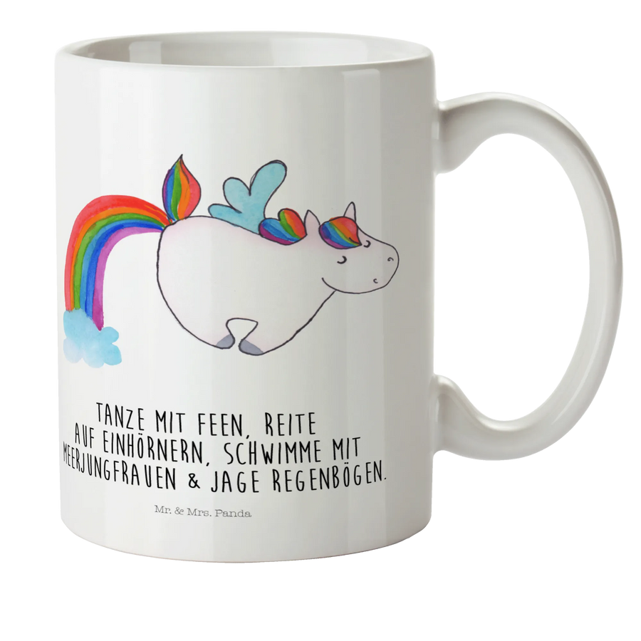 Du bist auf der Suche nach dem perfekten Geschenk für kleine Einhorn-Fans? Unsere farbenfrohe Kindertasse 'Einhorn Fliegendes Pferd' aus der beliebten Einhorn-Kollektion von Mr. & Mrs. Panda ist genau das richtige! Mit ihrem zauberhaften Design und dem inspirierenden Spruch 'Tanze mit Feen, reite auf Einhörnern, schwimme mit Meerjungfrauen & jage Regenbögen' wird diese Tasse zum treuen Begleiter für Kinder im Kindergarten und in der Schule. Die leuchtenden Farben und das fröhliche Einhornmotiv machen das Trinken zum Abenteuer!