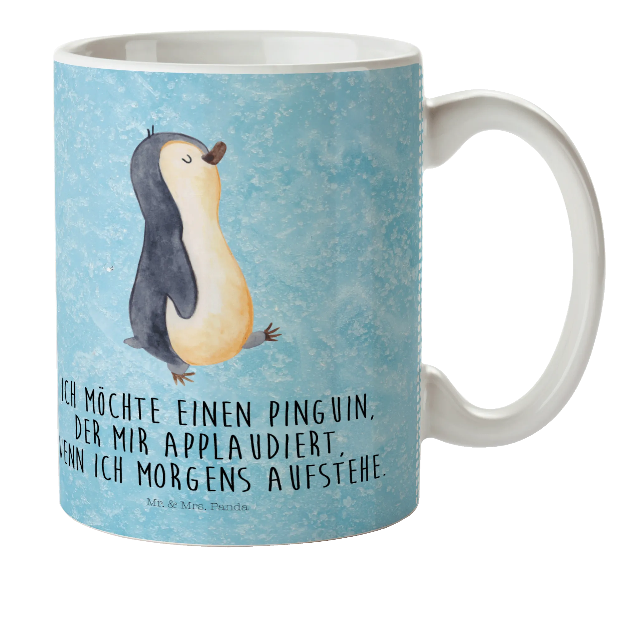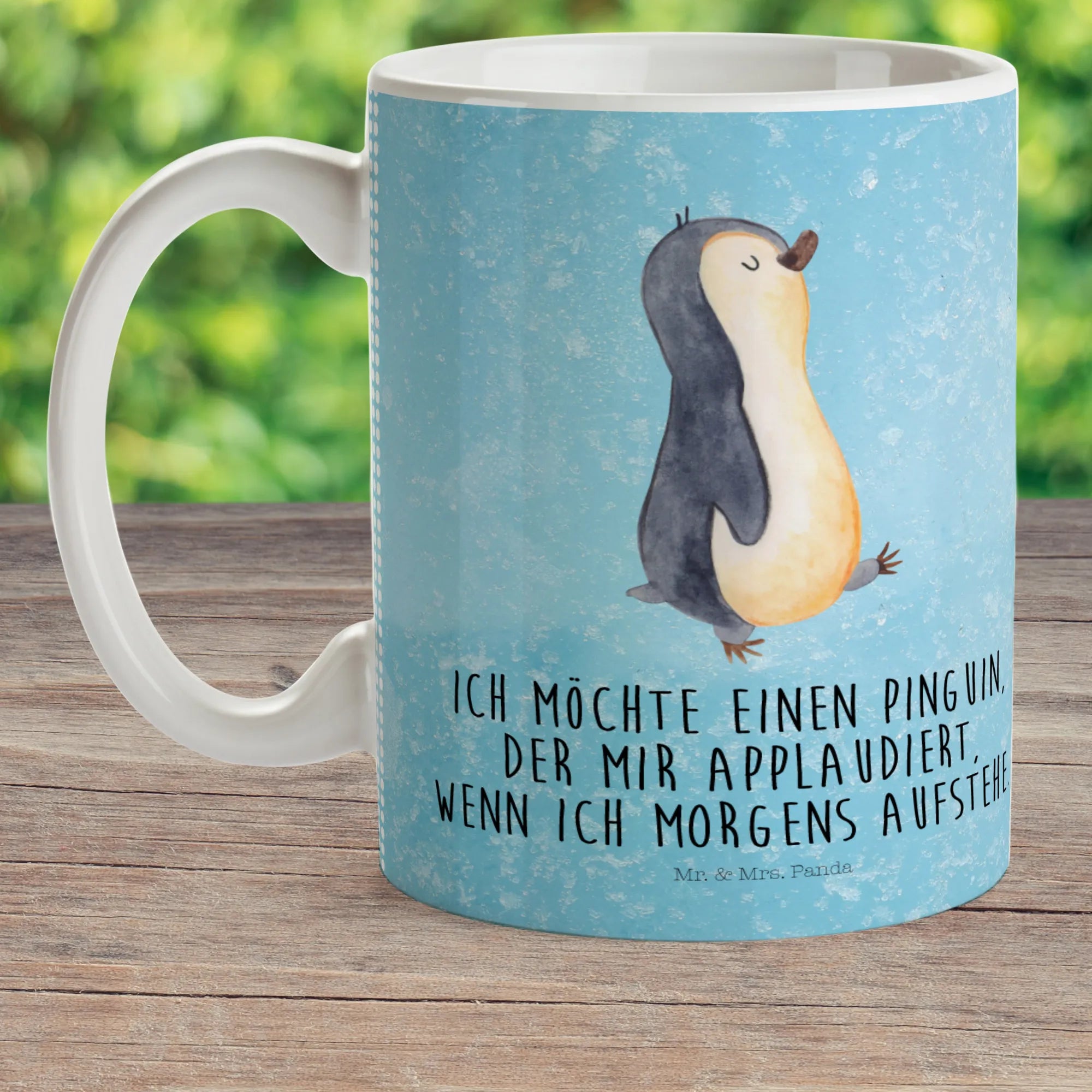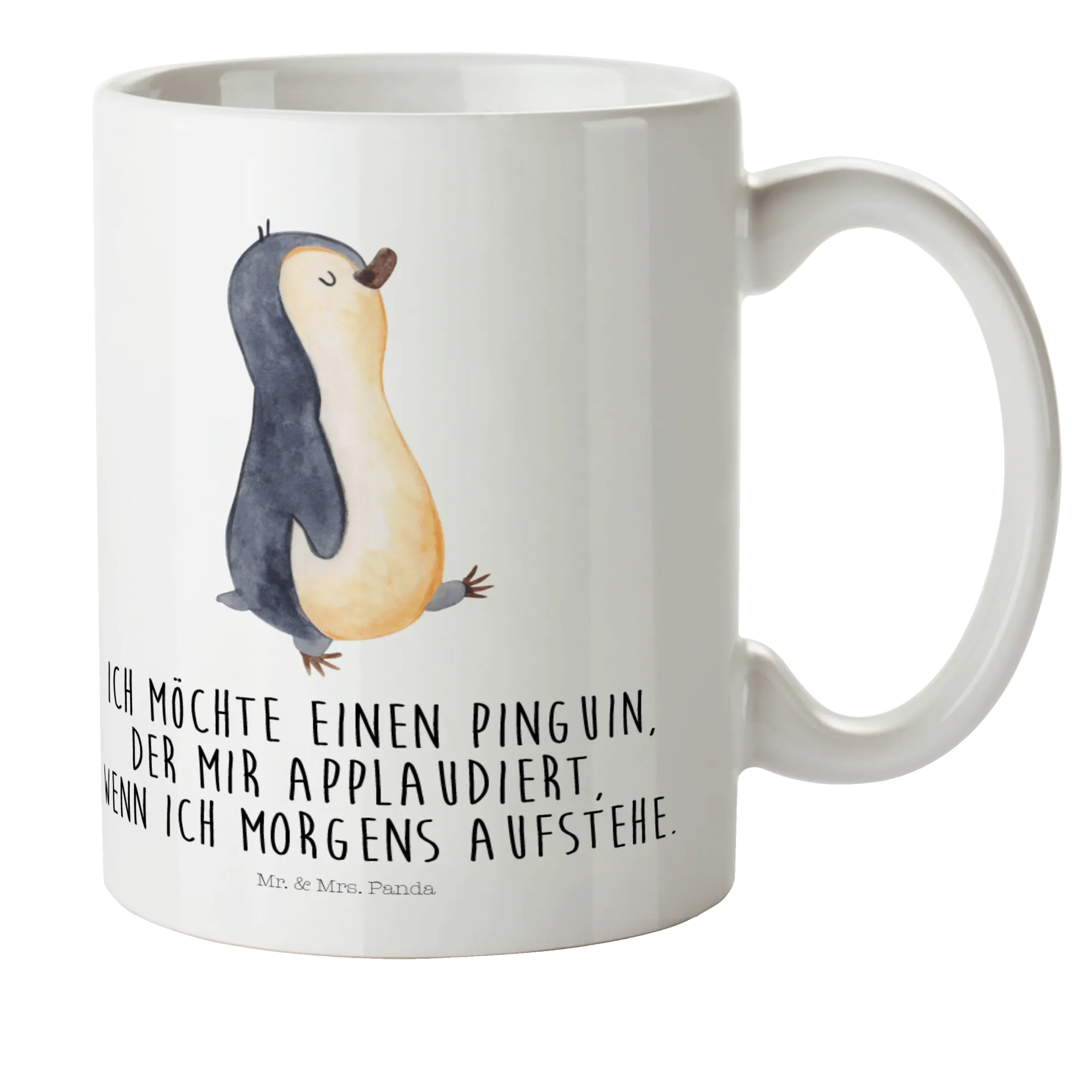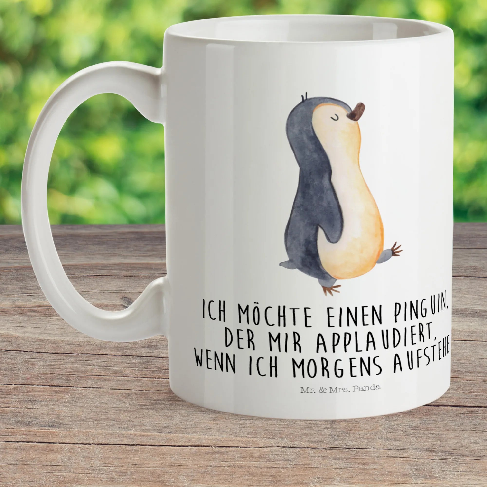 Der niedliche Pinguin, der fröhlich marschiert, inspiriert dazu, den neuen Tag mit Freude zu beginnen. Mit dem Spruch: "Ich möchte einen Pinguin, der mir applaudiert, wenn ich morgens aufstehe," wird jeder Schluck zum Erlebnis.