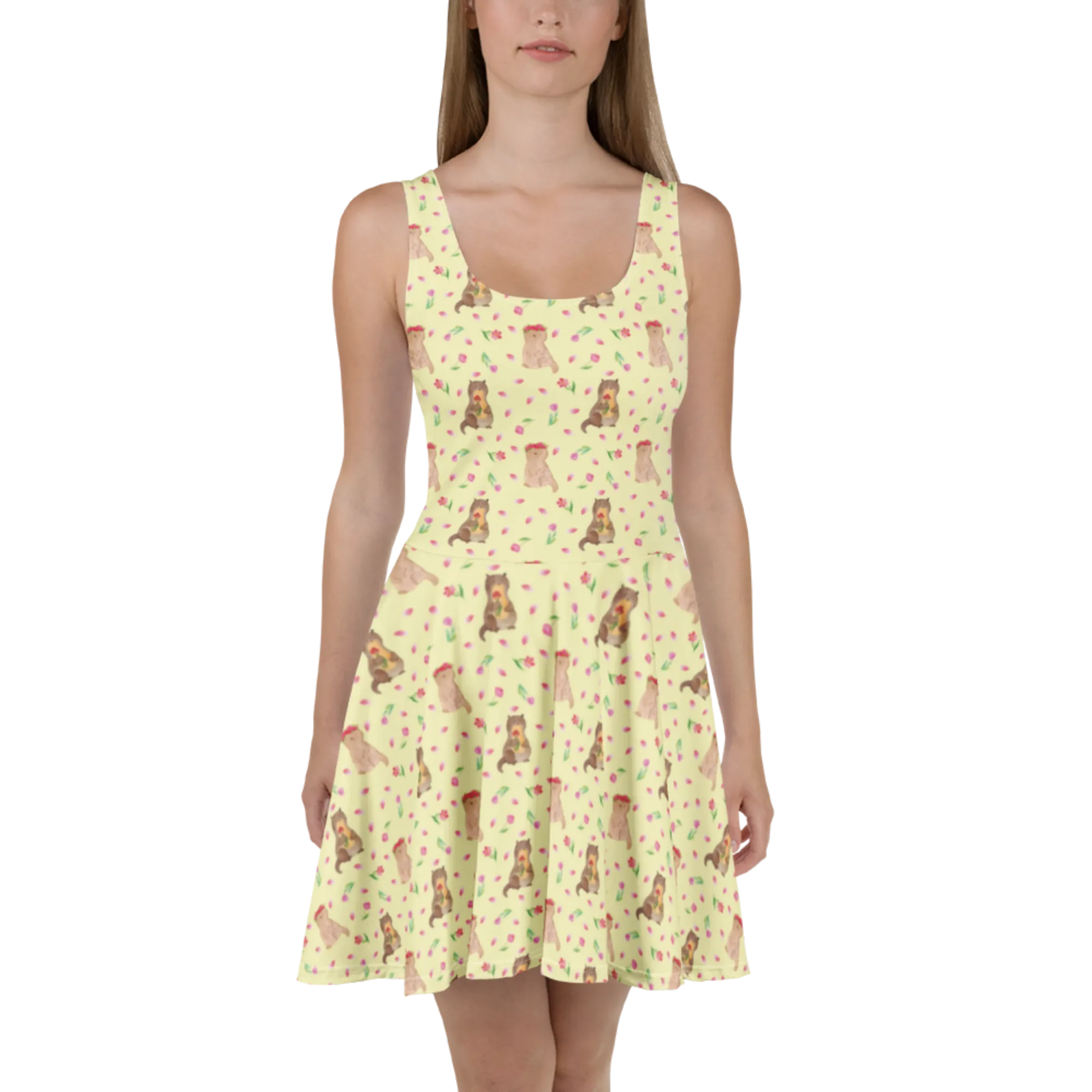 Mr. & Mrs. Panda Sommerkleid „Otter Blumenstrauß“ – Ein fröhliches Skaterkleid, das Sonnentage noch schöner macht. Das liebevoll handgezeichnete Otter-Motiv aus unserer Otter - Kollektion zeigt einen niedlichen Seeotter mit einem kunterbunten Blumenstrauß vor strahlend gelbem Hintergrund. Perfekt für alle, die Tiermotive und sommerliche Leichtigkeit lieben.