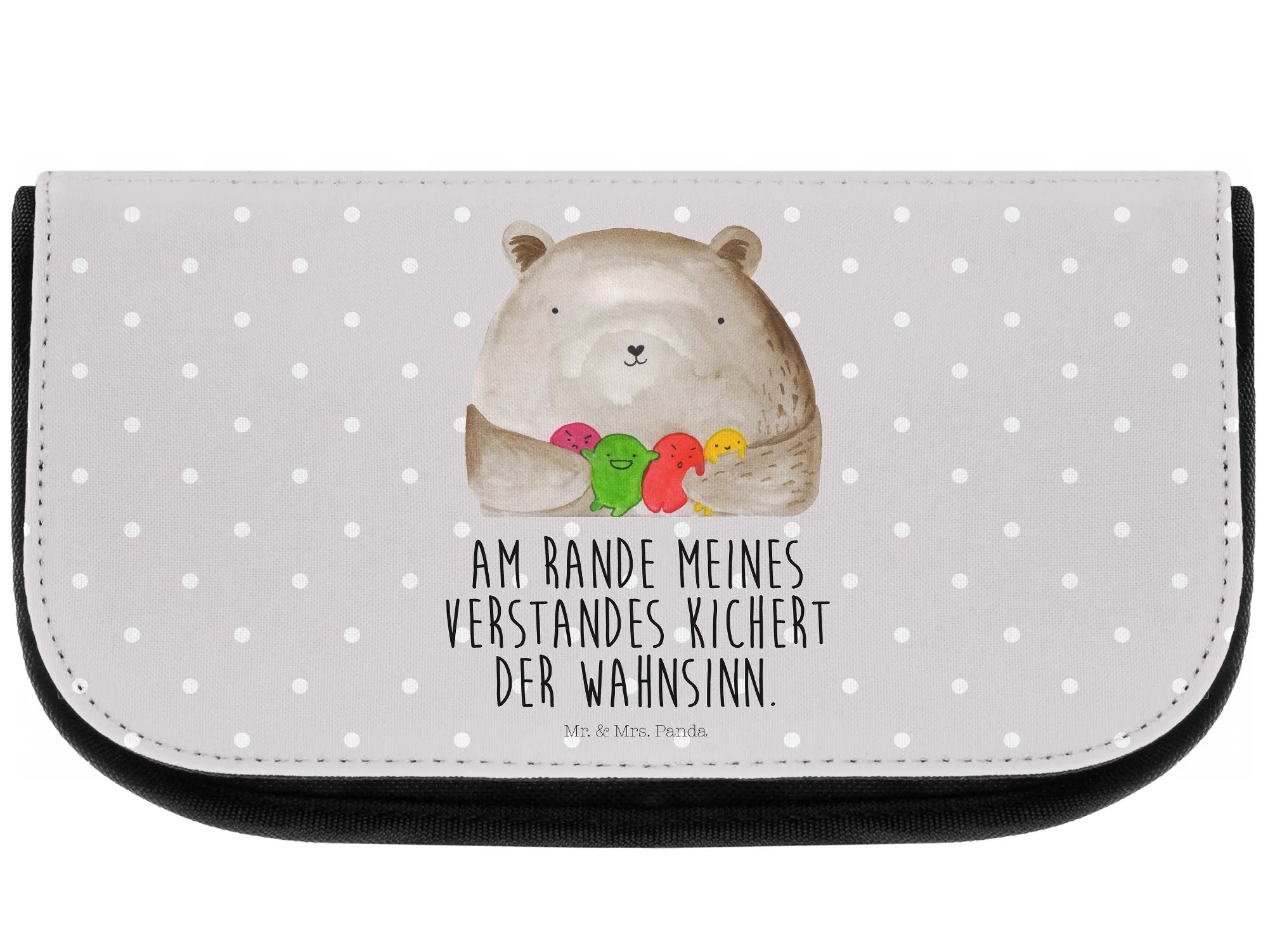 Mr. & Mrs. Panda Kosmetiktasche „Bär Gefühl“ – ein kleines Kunstwerk für Dein Makeup und Deine Gefühle. Der süße Bär hält viele bunte Kugeln, die verschiedene Emotionen erzählen. Über dem Motiv steht der charmante Spruch: „Am Rande meines Verstandes kichert der Wahnsinn.“ Genau die richtige Mischung aus Herzlichkeit und Humor für Deinen Alltag. 🐻🎨