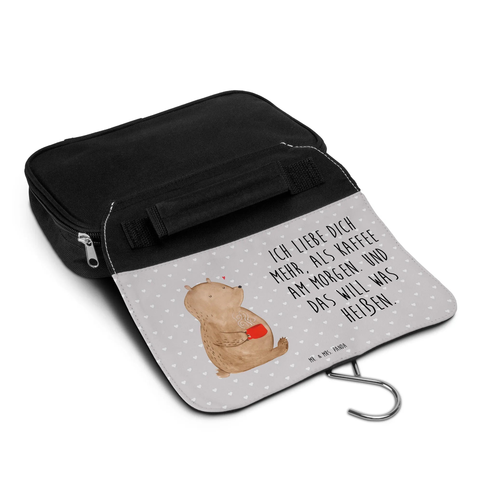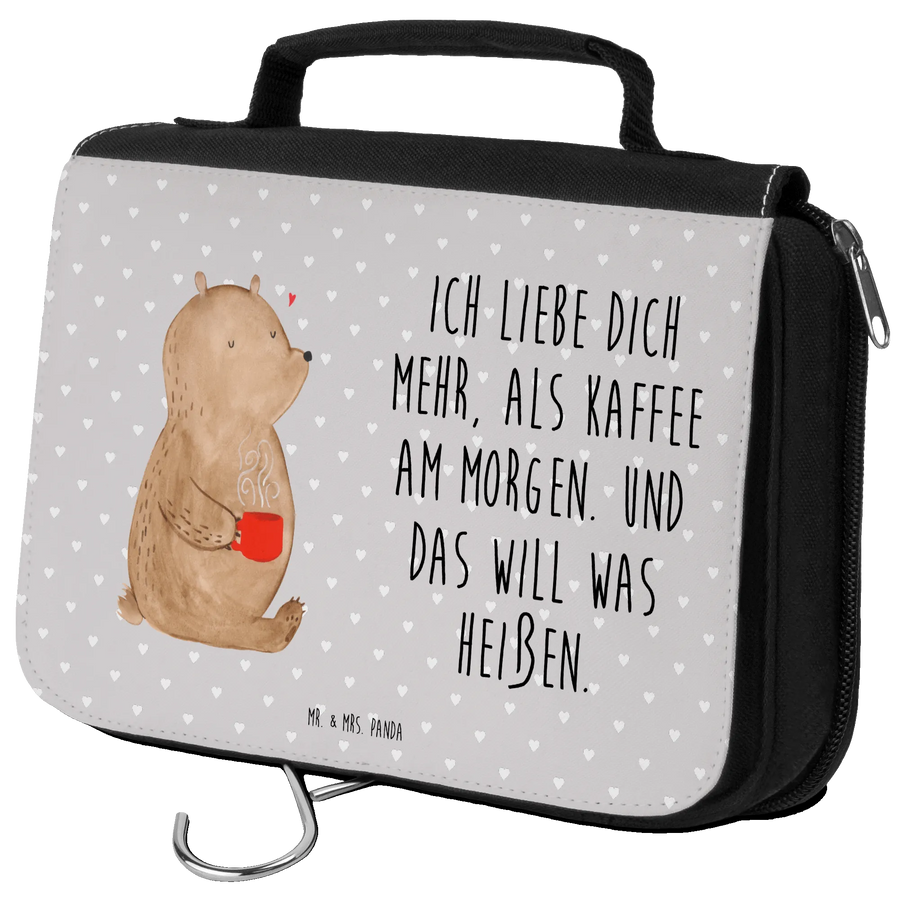Der Kulturbeutel "Bär Morgenkaffee" von Mr. & Mrs. Panda ist das perfekte Accessoire für alle, die auf Reisen oder zu Hause ihre Kosmetik- und Hygieneprodukte stilvoll aufbewahren möchten. Mit seinem zauberhaften Motiv eines zufrieden lächelnden Bären, der eine Tasse heißen Kaffee in den Pfoten hält, vermittelt dieser Kulturbeutel nicht nur praktischen Nutzen, sondern auch ein fühlbares Zeichen der Liebe. Der Spruch "Ich liebe dich mehr, als Kaffee am Morgen. Und das will was heißen." sorgt dafür, dass sich jeder Beschenkte besonders wertgeschätzt fühlt.