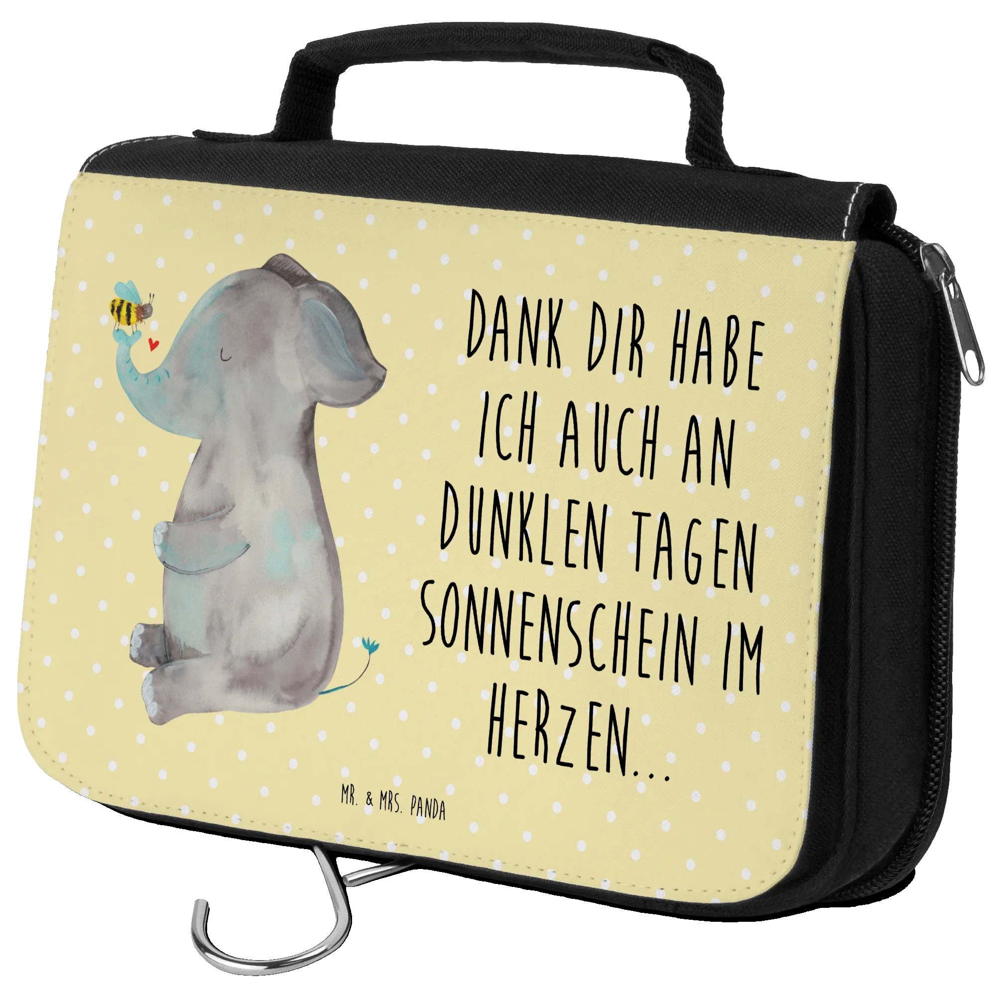Ein wunderschöner Kulturbeutel von Mr. & Mrs. Panda – mit dem zauberhaften Elefant & Biene Motiv aus der Small World Kollektion. Ein kleiner Elefant trägt behutsam eine Biene auf seinem Rüssel und erinnert dich daran, dass Stärke und Fürsorge zusammengehören. Das pastellgelbe Design schenkt gute Laune und passt perfekt in jeden Koffer oder Badezimmerschrank. 😊