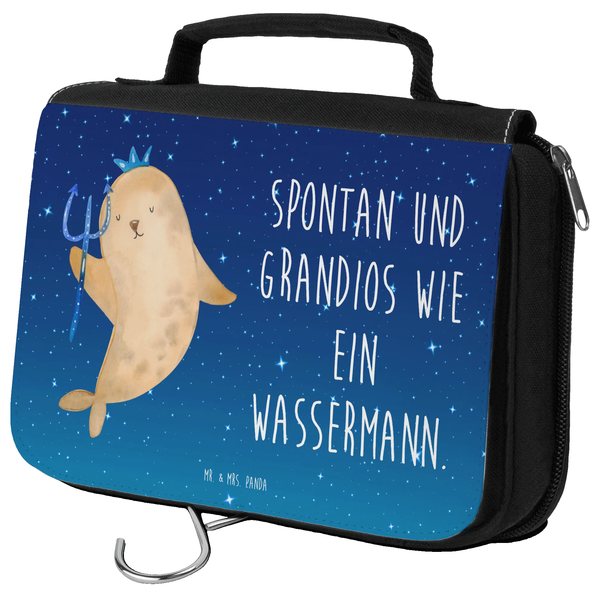 Entdecke den zauberhaften Kulturbeutel mit dem Motiv "Wassermann" von Mr. & Mrs. Panda – ein perfektes Geschenk für alle, die zwischen dem 20. Januar und 18. Februar geboren sind oder einfach die Eigenschaften des Wassermanns schätzen. Dieser Kulturbeutel ist nicht nur mit einem süßen, handgezeichneten Design, das einen tridenthaltenden Meer-Mann zeigt, sondern auch mit dem Spruch "Spontan und grandios wie ein Wassermann" versehen. Er passt hervorragend zu jedem Geburtstag im Januar oder Februar und ist ideal für alle, die gerne reisen oder einfach nur Ordnung in ihren Kosmetik- und Hygieneprodukten halten möchten.