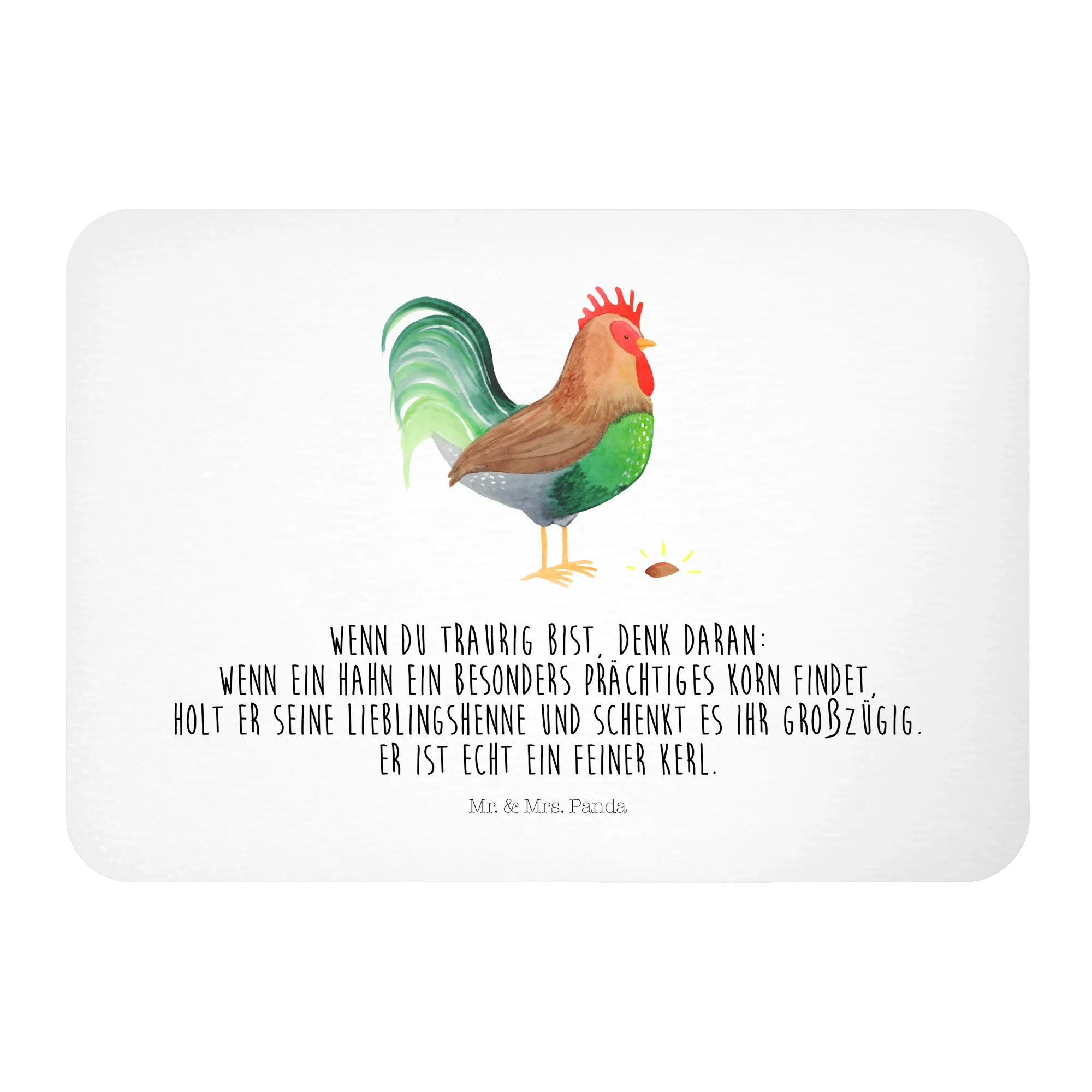Unser hübscher Hahn mit Korn ist stolz und großzügig zugleich. Er erinnert uns daran, wie wichtig es ist, Freude und Glück mit anderen zu teilen. Der zauberhafte Spruch "Wenn du traurig bist, denk daran: wenn ein Hahn ein besonders prächtiges Korn findet, holt er seine Lieblingshenne und schenkt es ihr großzügig. Er ist echt ein feiner Kerl." bringt ein Lächeln auf jedes Gesicht und ist einfach perfekt für jeden Anlass.