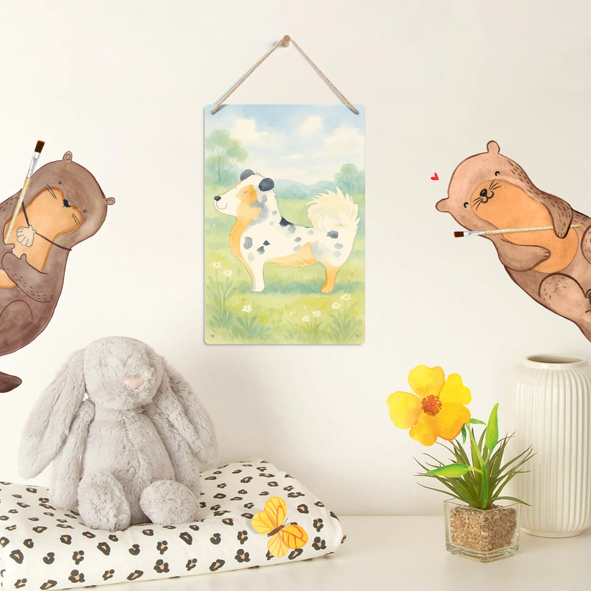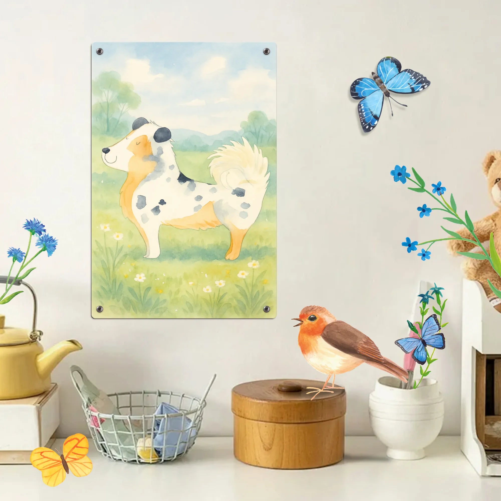 Der Australian Shepherd ist der ideale Begleiter für alle, die die Liebe eines Hundes in ihrem Leben begrüßen möchten. Er hat diesen besonderen Charme, der jeder Familie ein Lächeln ins Gesicht zaubert. Mit seiner drolligen Persönlichkeit und dem niedlichen Motiv mit der Blumenranke wird er schnell zum Mittelpunkt eures Alltags. Egal, ob bei gemeinsamen Spaziergängen, Spielen im Garten oder entspannten Kuschelstunden auf dem Sofa – dieser treue Freund ist immer da, um eure Herzen zu erhellen. Kinder lieben ihn, weil er so verspielt und geduldig ist, und auch Erwachsene genießen die unbedingte Zuneigung, die er gibt. Diese Hundeliebe kann man nicht in Worte fassen – sie muss erlebt werden! Hol dir deinen kleinen Freund und spüre die Freude, die er in dein Leben bringt.