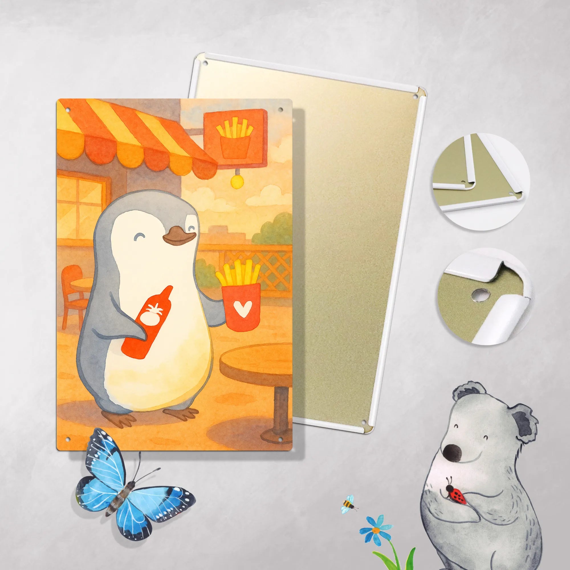 Dieser fröhliche Pinguin mit seiner roten Ketchup-Flasche in der rechten Flosse und einer Portion Pommes in einem roten Becher mit weißem Herz ist ein echtes Herzstück für alle, die gerne liebevoll und mit einem Augenzwinkern schenken. Sein freundlicher Gesichtsausdruck und die sanfte Farbgebung laden zum Schmunzeln ein und machen ihn zum perfekten Mitbringsel für spontane Besuche, kleine Aufmerksamkeiten oder einfach als Überraschung zwischendurch. Ob du ihn als charmantes Geschenk für deinen Freund auswählst oder als liebe Geste an jemanden, der Pommes und gute Laune liebt – dieser Pinguin transportiert Zuneigung ohne große Worte. Er wirkt gemütlich, warmherzig und lud zum Anfassen ein, obwohl er natürlich nur als Motiv dein Zuhause verschönert. Die Kombination aus Wärme, Humor und Zärtlichkeit macht ihn ideal für Anlässe, bei denen du sagen willst: Ich hab an dich gedacht. Und manchmal ist genau dieses kleine, liebevolle Detail der Moment, der den Tag eines Freundes heller macht. Dieses Motiv passt wunderbar auf Karten, Tassen, Kissen oder als dekoratives Accessoire und erzielt dort seine volle Wirkung: ein Lächeln, ein leiser Seufzer der Freude und das Wissen, dass jemand an einen denkt. Ein Mitbringsel mit Herz und Stil, das Freunde erfreut und Erinnerungen schafft.