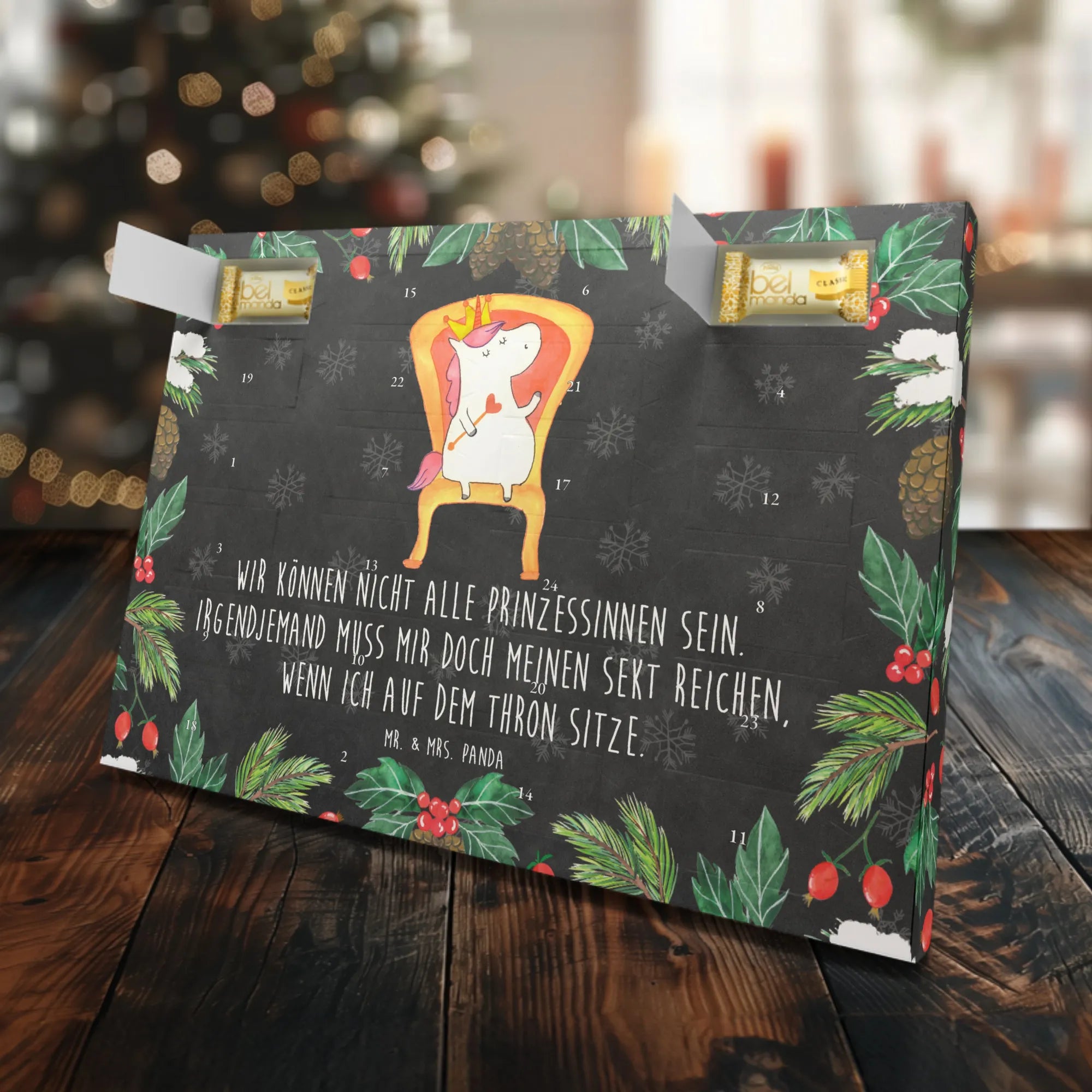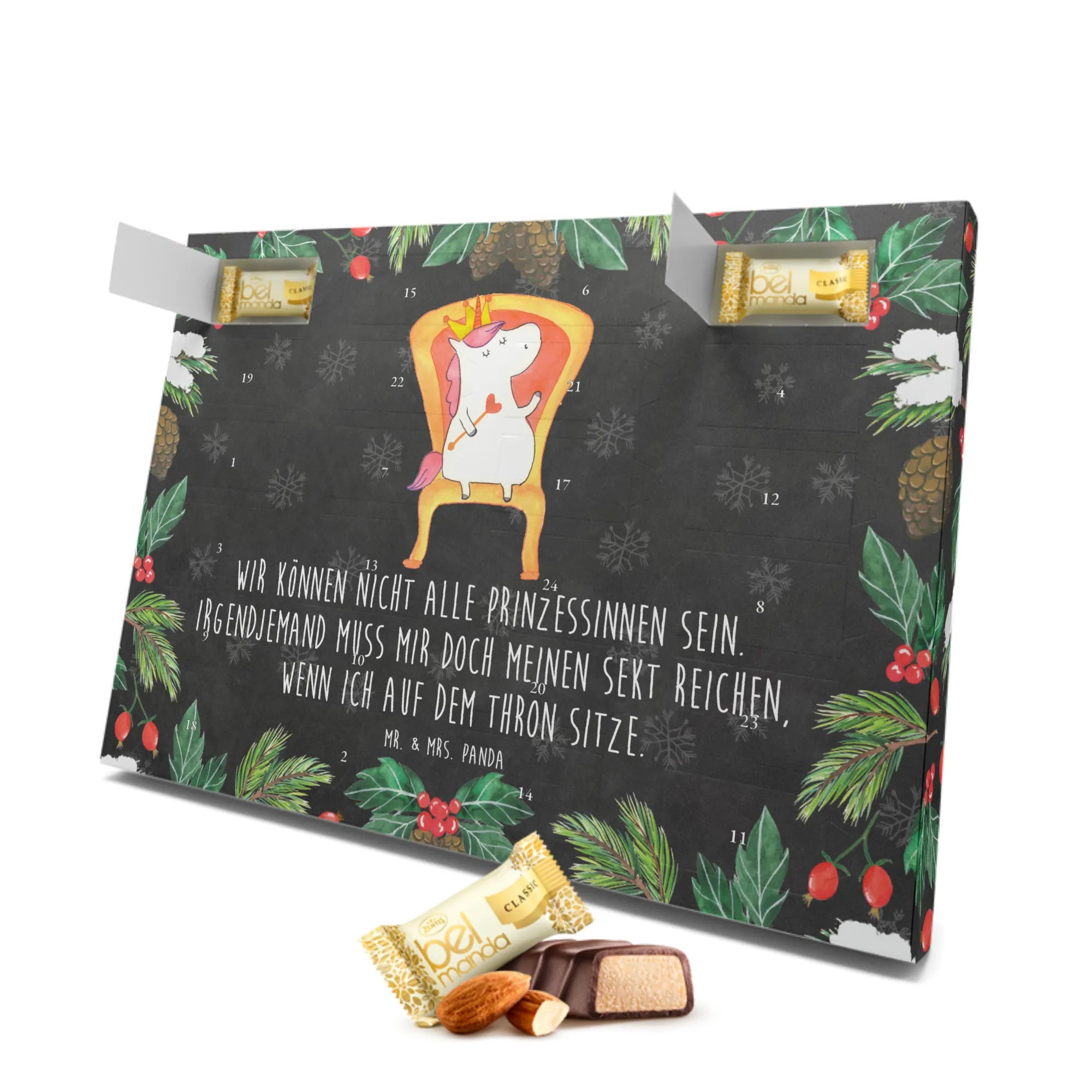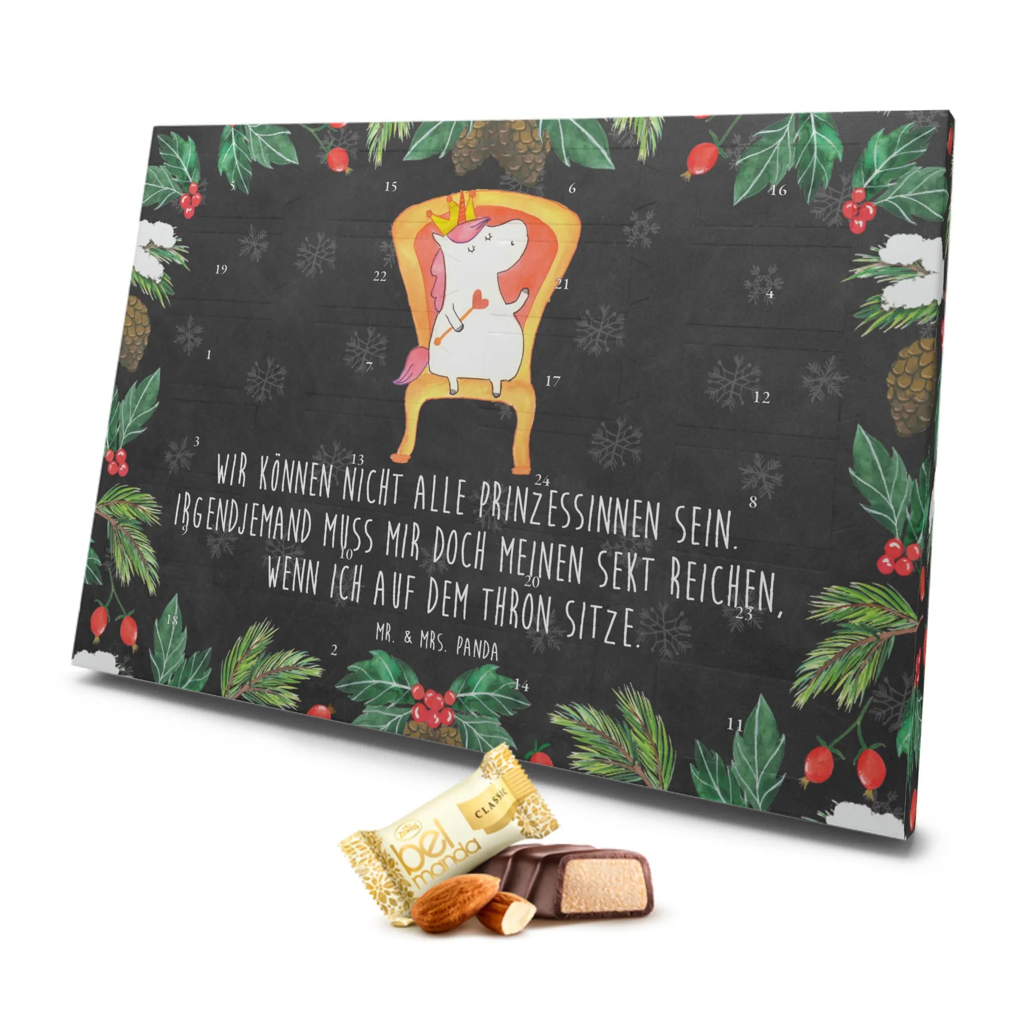 Gefüllt mit 24 köstlichen, einzeln verpackten Edelmarzipan-Pralinés, sorgt er für süße Überraschungen im Advent. Das liebevoll gestaltete Design zeigt ein strahlendes Einhorn auf einem Thron, das majestätisch mit einer Krone geschmückt ist. Es trägt den humorvollen Spruch: "Wir können nicht alle Prinzessinnen sein. Irgendjemand muss mir doch meinen Sekt reichen, wenn ich auf dem Thron sitze." Damit ist dieser Kalender nicht nur ein Genuss für den Gaumen, sondern auch ein richtiger Hingucker!