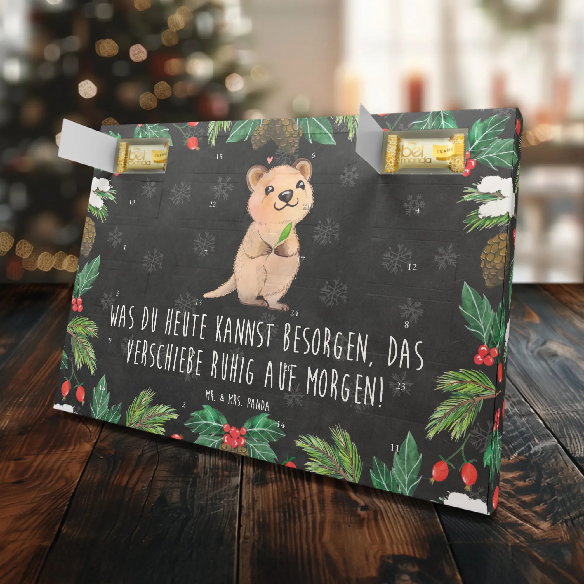 Der Marzipan Adventskalender Quokka Happy von Mr. & Mrs. Panda ist das perfekte Geschenk für alle, die die Vorweihnachtszeit mit einer großen Portion Freude und Genuss zelebrieren möchten! Er ist nicht nur ein Blickfang in jeder Wohnung, sondern bietet auch eine köstliche Reise durch die Welt des Edelmantees. Mit liebevoll gestalteten Tiermotiven und einem humorvollen Spruch, "Was du heute kannst besorgen, das verschiebe ruhig auf morgen!", bringt dieser Adventskalender gute Laune und zaubert ein Lächeln auf die Gesichter der Beschenkten. Ob du ihn für Freunde, Familie oder als kleinen Weihnachtsgruß für Kollegen auswählst, er kommt garantiert gut an!