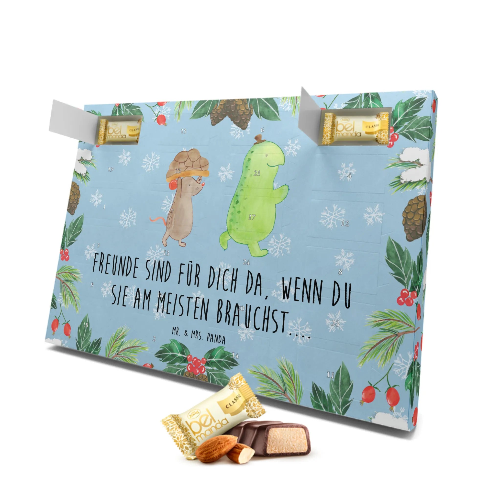 Mit dem Slogan 'Freunde sind für dich da, wenn du sie am meisten brauchst...' wird er sicherlich Herzen berühren und die Vorfreude auf das Weihnachtsfest steigern. Der Kalender ist gefüllt mit 24 einzeln verpackten Edelmarzipan Pralinés, die sich hervorragend eignen, um sie mit den besten Freunden oder besten Freundinnen zu teilen. Das niedliche Design zeigt eine fröhliche Schildkröte, die von einer kleinen Maus begleitet wird, und zaubert jedem Betrachter ein Lächeln ins Gesicht.
