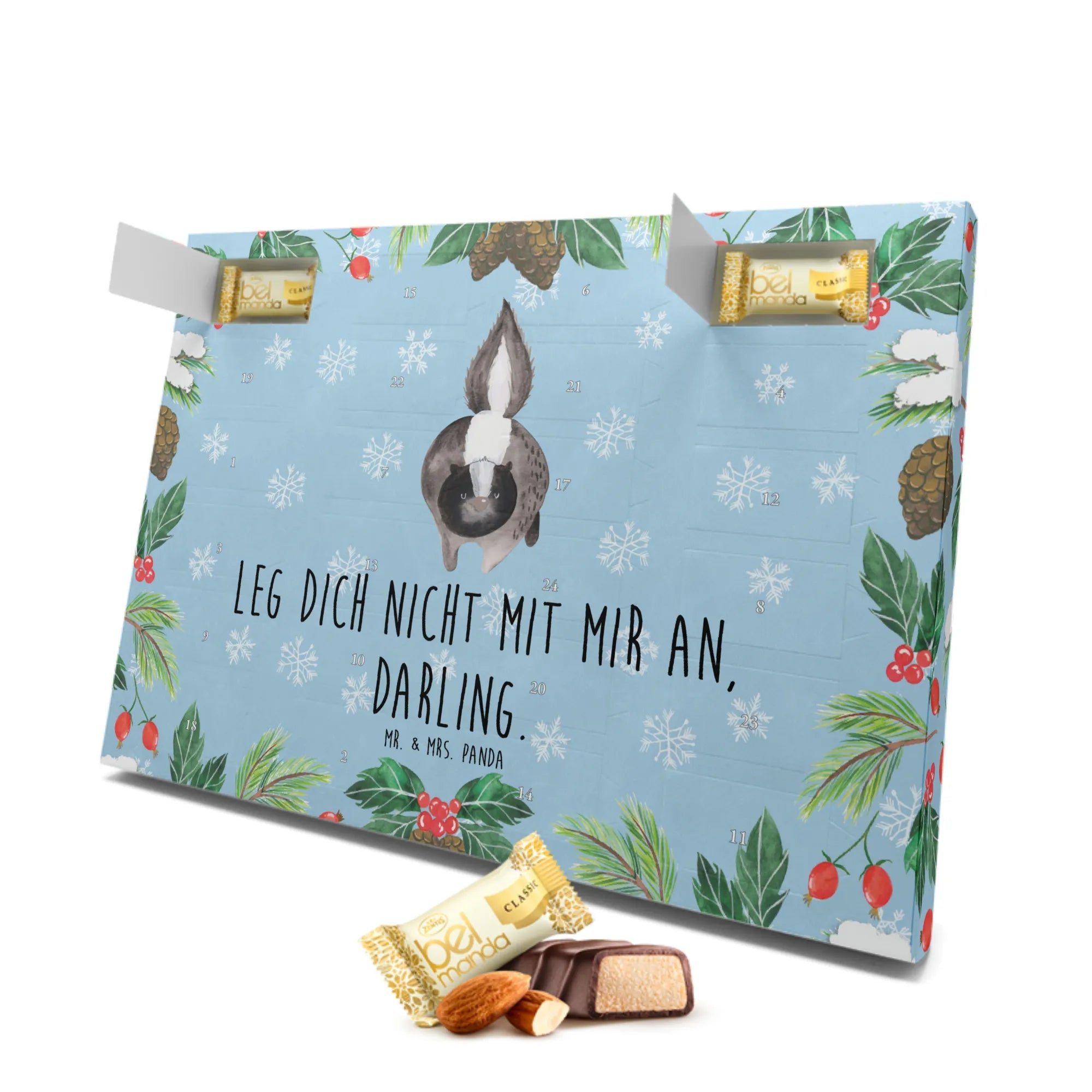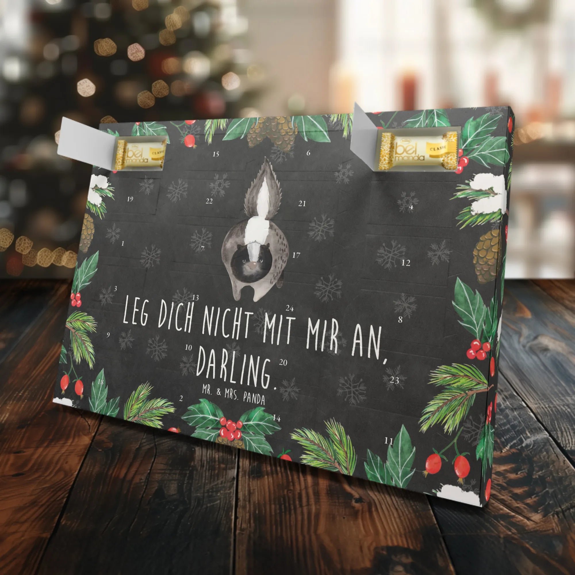 Der Marzipan Adventskalender "Stinktier Angriff" aus der liebevollen Stinktier-Kollektion von Mr. & Mrs. Panda ist das ideale Geschenk für alle, die die Vorweihnachtszeit mit einem besonderen Flair genießen möchten. Der Kalender ist bedruckt mit einem süßen und gleichzeitig ein bisschen frechen Stinktier, das sich drohend aufbaut und seinen buschigen Schwanz in die Luft hält. Das passende Motto "Leg dich nicht mit mir an, Darling." sorgt für ein Schmunzeln und ist perfekt geeignet für Freunde und Familie, die einen Hauch von Humor schätzen.