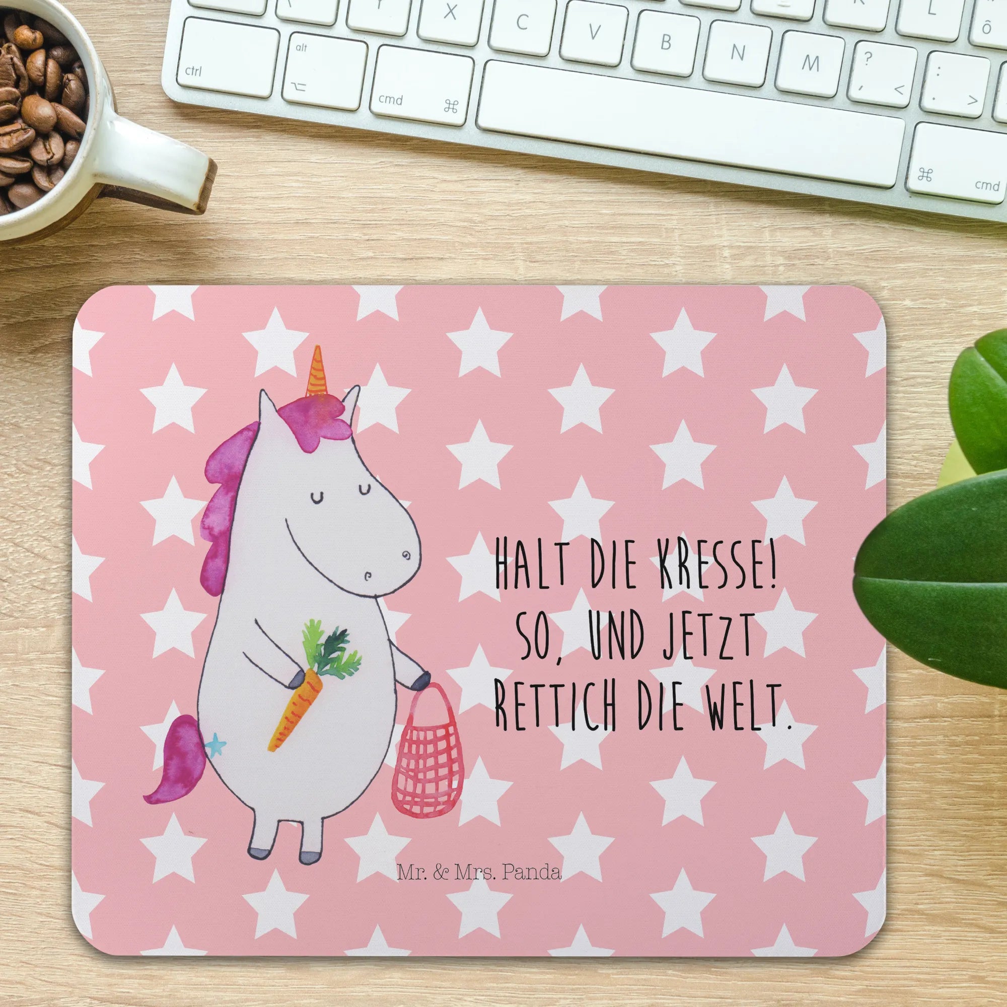 Suchst du nach dem perfekten Geschenk für Einhorn-Liebhaber oder möchtest du dir selbst eine Freude machen? Dann ist unser Mauspad Einhorn Gemüse aus der zauberhaften Einhorn-Kollektion von Mr. & Mrs. Panda genau das Richtige für dich! Dieses bezaubernde Mauspad kombiniert die Schönheit eines handgezeichneten Einhorns mit einem fröhlichen Gemüse-Motiv, das unser Motto "Halt die Kresse! So, und jetzt Rettich die Welt" verkörpert.