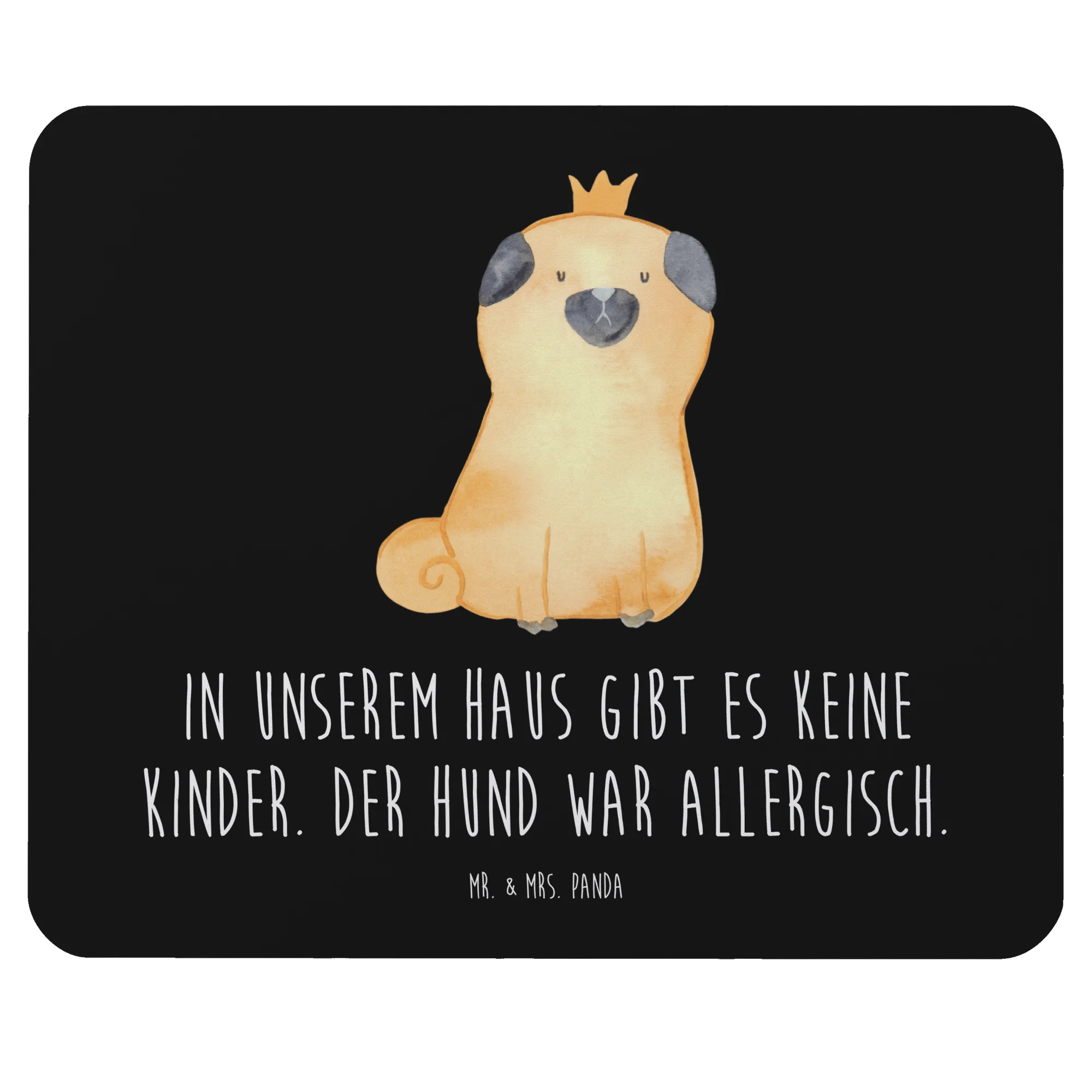 Durch den gelungenen Mix aus Humor und Design wird das Mauspad zum echten Hingucker und ist eine wunderbare Ergänzung für jedes Arbeitszimmer. Stell Dir vor, was für eine Freude es macht, am Schreibtisch zu sitzen und diesen tollen Hund mit Krone anzuschauen, während Du Deiner Arbeit nachgehst. Besonders für kinderlose Hundebesitzer ist der Spruch "In unserem Haus gibt es keine Kinder. Der Hund war allergisch" eine witzige und charmante Ergänzung, die jede stressige Minute im Arbeitsalltag aufhellt.