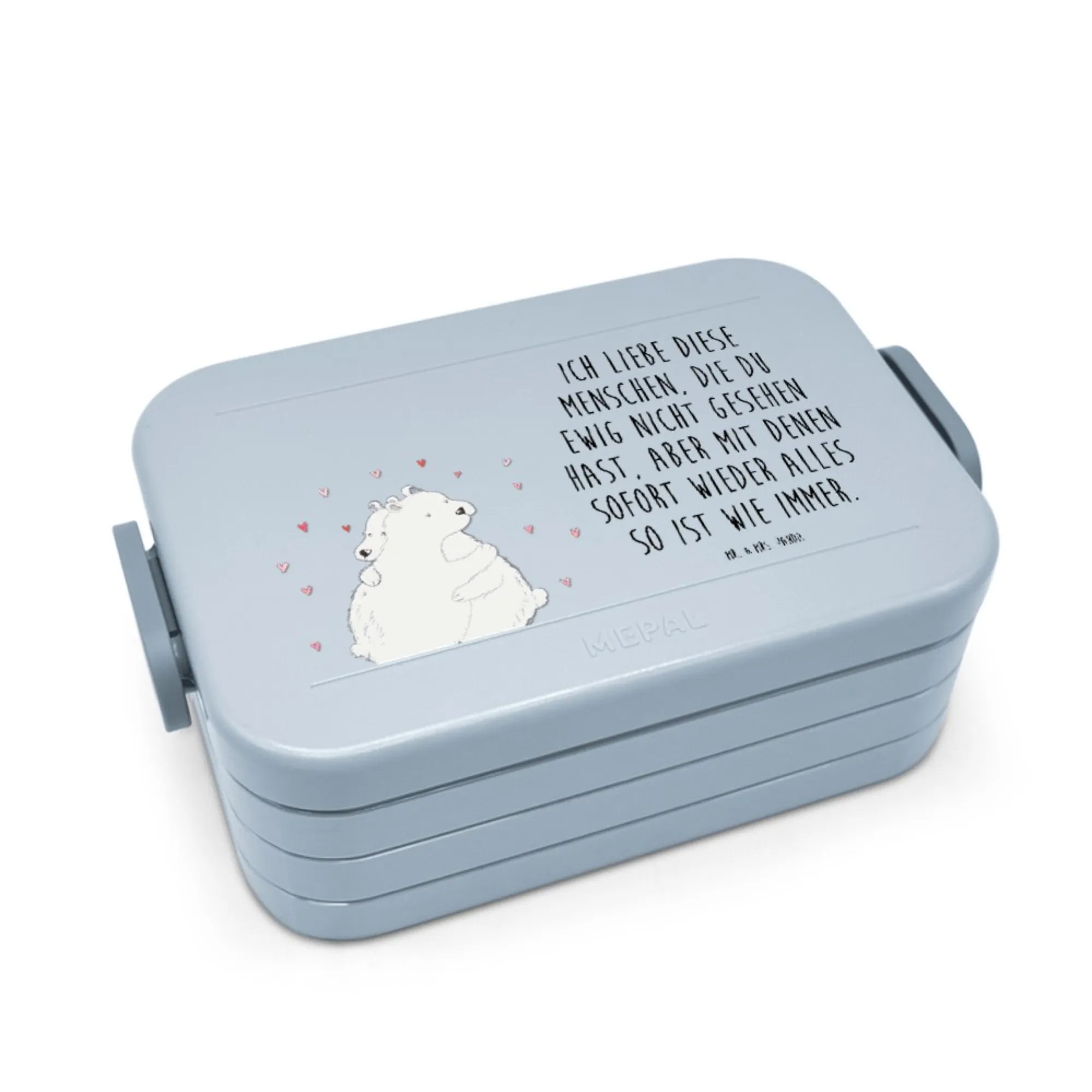 Die liebevoll illustrierte Bento-Brotdose aus der Small World Kollektion von Mr. & Mrs. Panda bringt dir jeden Tag ein Lächeln. Das Motiv zeigt zwei verliebte Eisbären, die sich innig umarmen. Der zarte Spruch „Ich liebe diese Menschen, die du ewig nicht gesehen hast, Aber mit denen sofort wieder alles so ist wie immer.“ macht die Dose zur perfekten Botschaft für Freunde, Familie oder den Lieblingsmenschen.