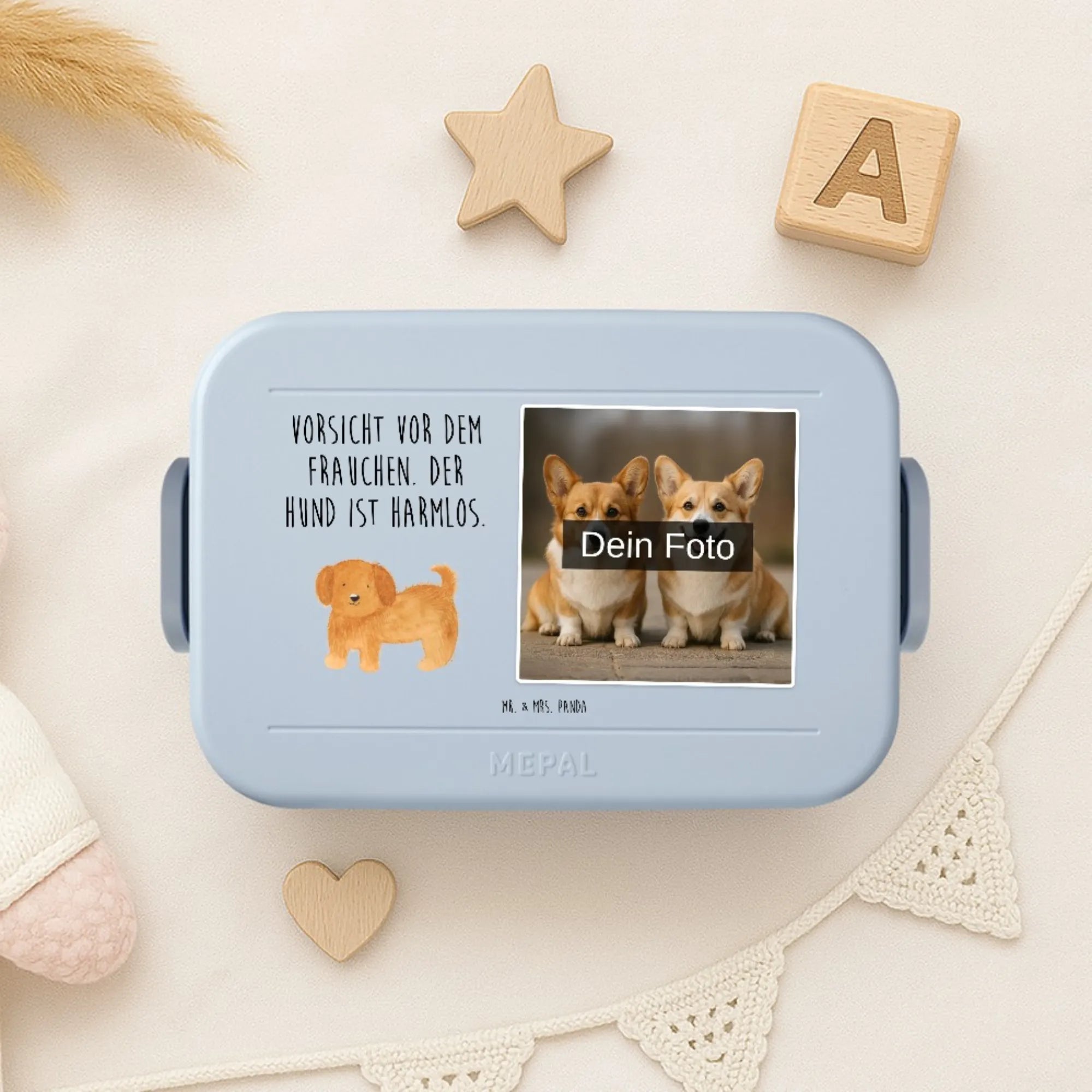 Mepal Foto Bentobox – die personalisierte Bento-Brotdose von Mr. & Mrs. Panda, die dich jeden Tag begleitet. Wähle dein Wunschfoto und wir gestalten daraus eine Brotdose, die sonst keiner hat. Die Bento-Einsätze sind rausnehmbar, so bleibst du flexibel bei Snacks und Hauptmahlzeiten. Eine praktische Snackgabel ist dabei, damit nichts kleckert. Schüssel und Einsätze kannst du in der Mikrowelle erwärmen (ohne Deckel). Die Box ist BPA-frei, lebensmittelecht und spülmaschinenfest – perfekt für stressfreie Pausen. Erhältlich in den Farben Salbeigrün, Hellblau und Pastellrot. Technische Angaben: Größe 188 mm x 61 mm x 61 mm, Inhalt 900 ml, Gewicht 325 g. Gefertigt aus PP, TPE und ABS, mit einer Druckfläche von 130 mm x 79 mm für dein Motiv. Ob Schule, Uni, Büro oder Freizeit – mit der Mepal Foto Bentobox hast du eine zuverlässige, hübsche und persönliche Lösung für dein Essen.