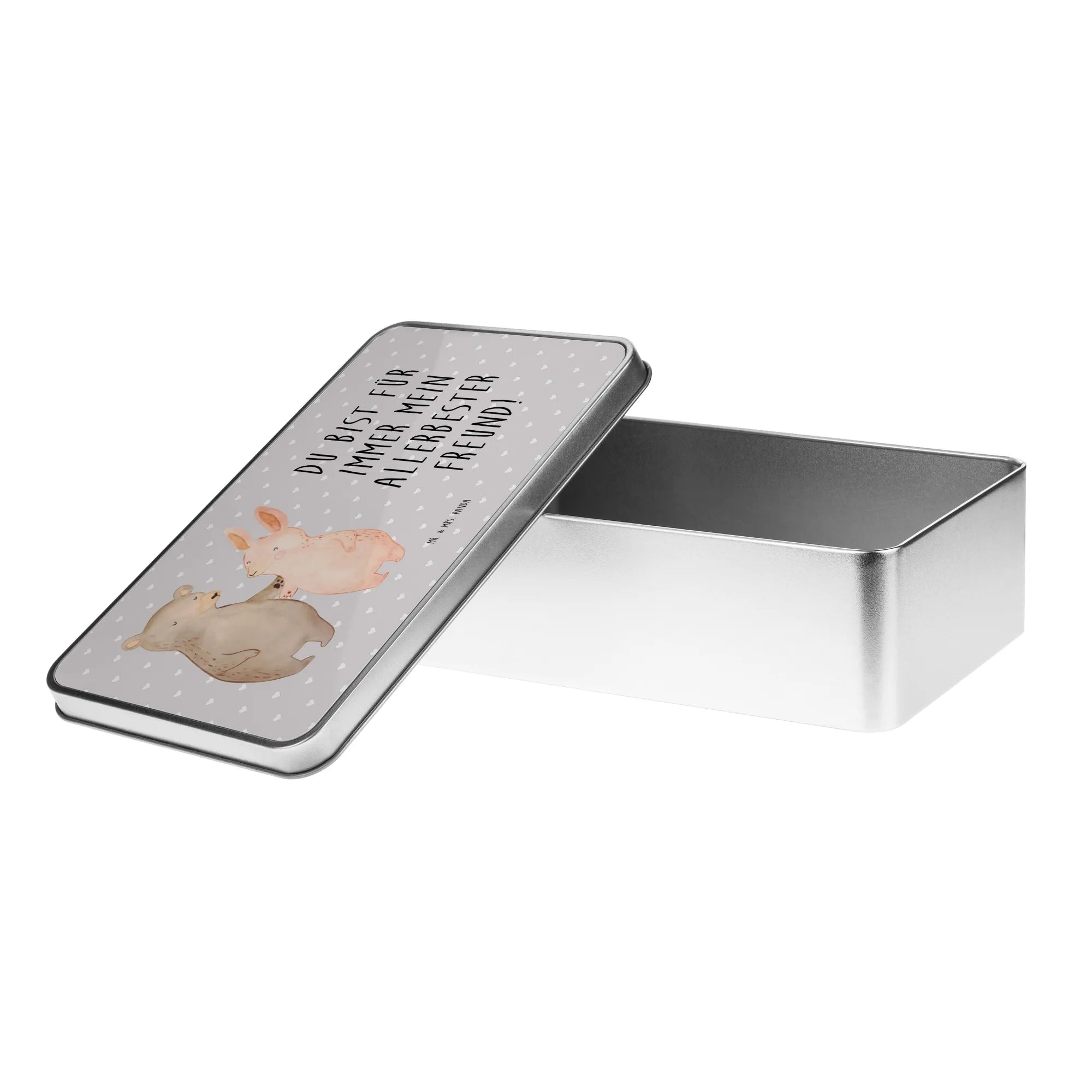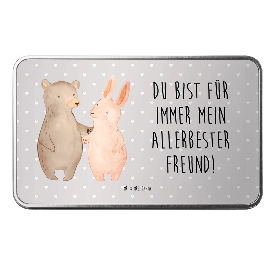 Die rechteckige Metalldose von Mr. & Mrs. Panda ist das perfekte Geschenk für jeden Anlass, besonders für Liebespaare. Mit dem charmanten Motiv des Bären und des Hasen, die sich innig umarmen, strahlt diese Dose Wärme und Zuneigung aus. Der Spruch "Du bist für immer mein allerbester Freund!" macht sie zu einem idealen Ausdruck der Liebe, sei es zum Jahrestag, Hochzeitstag oder als Liebesgeschenk zum Valentinstag.