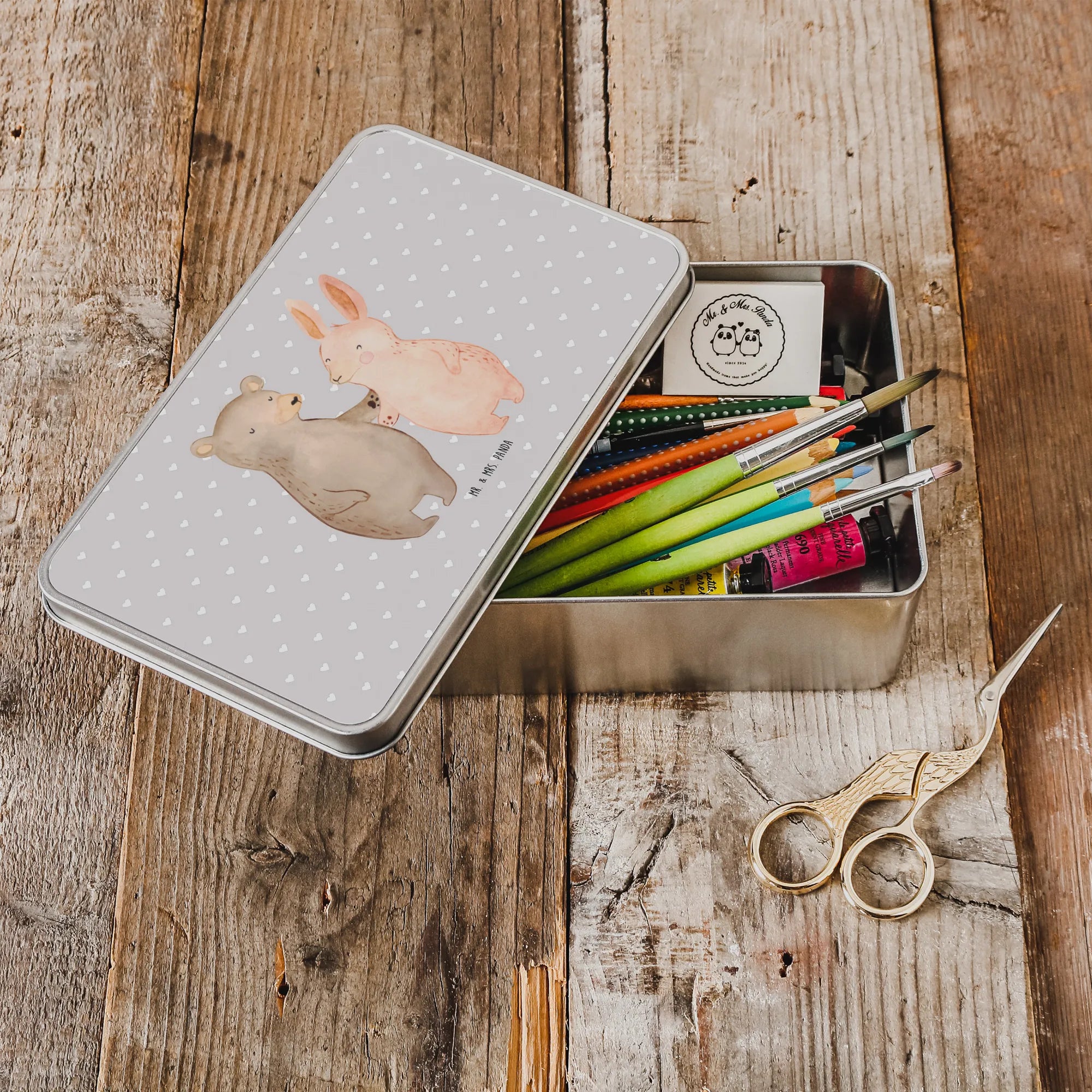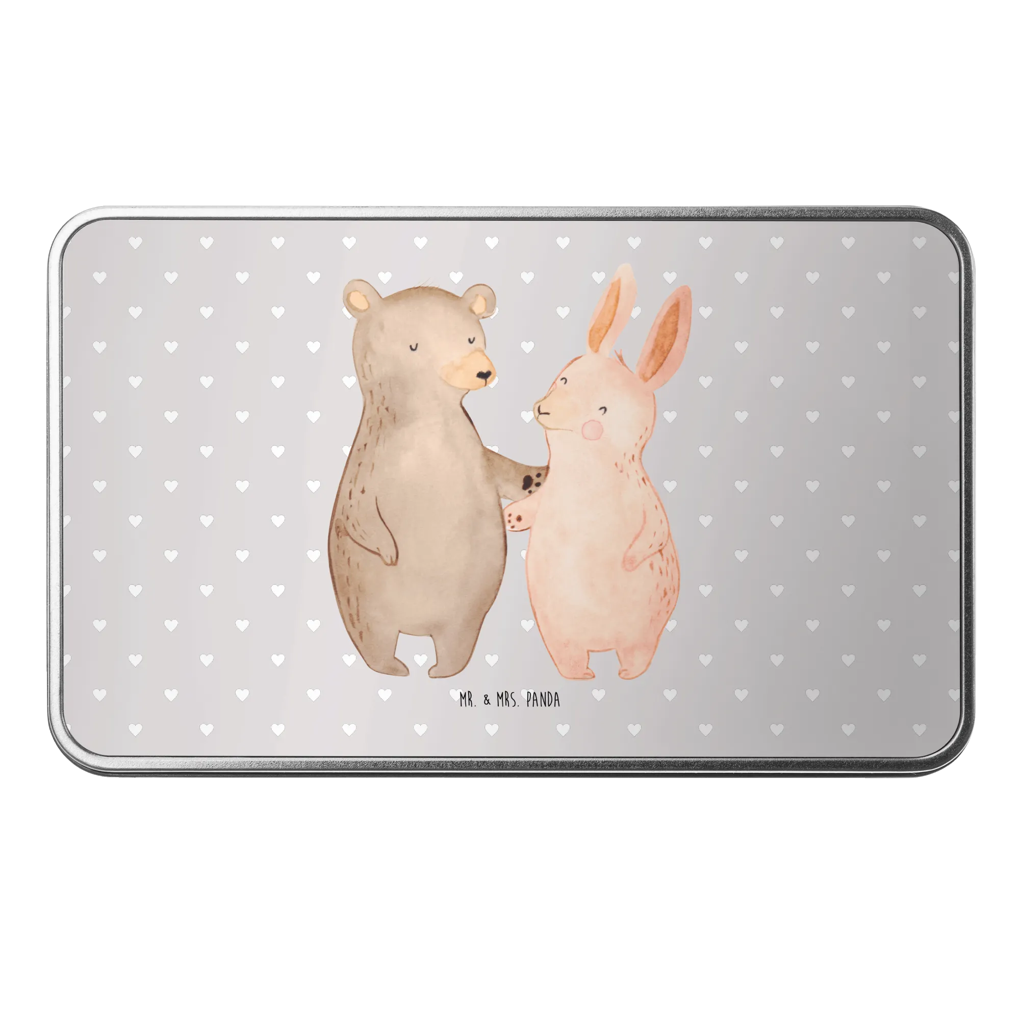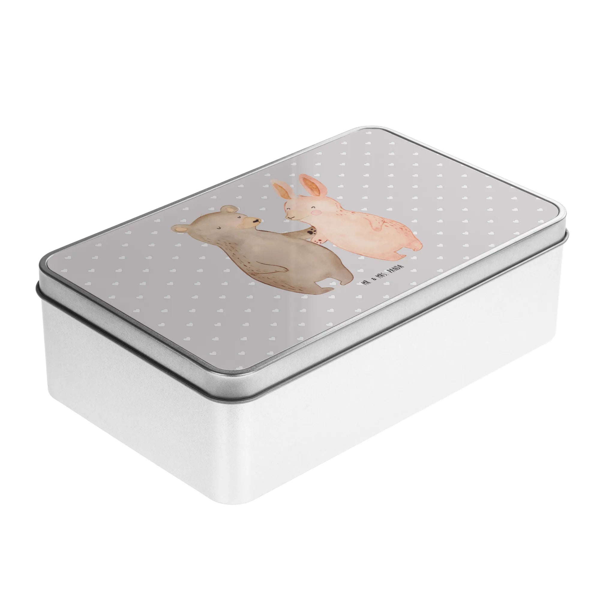 Die rechteckige Metalldose mit dem liebevollen Motiv Bär Hase Umarmen von Mr. & Mrs. Panda ist das perfekte Geschenk für alle, die ihren Freunden, Partnern oder Verwandten eine besondere Freude machen möchten! Diese zauberhafte Dose ist nicht nur ein praktischer Aufbewahrungsort für Kekse oder andere Kleinigkeiten, sondern auch ein liebevolles Statement der Verbundenheit und Freundschaft.