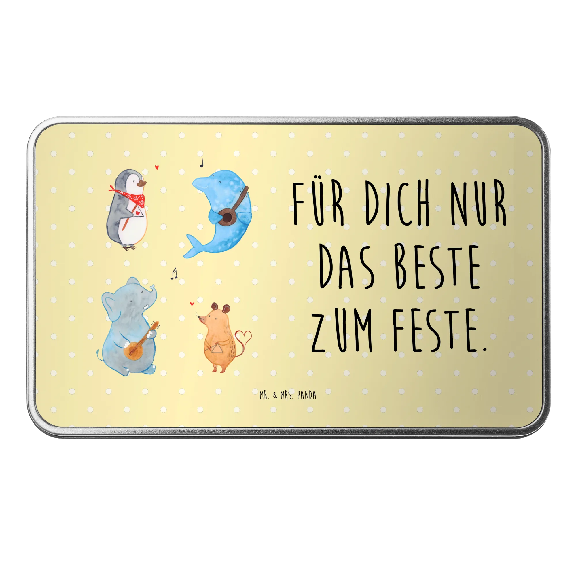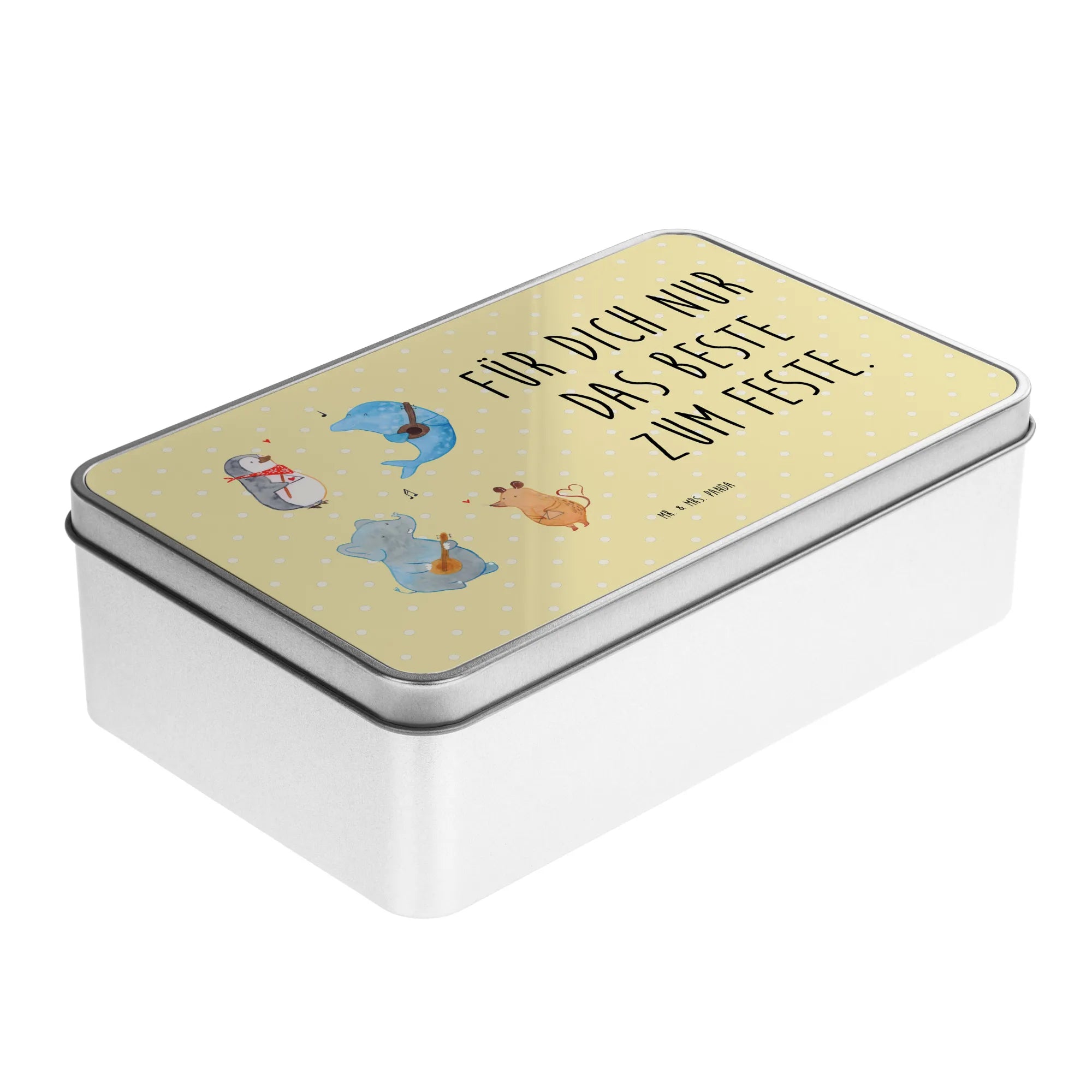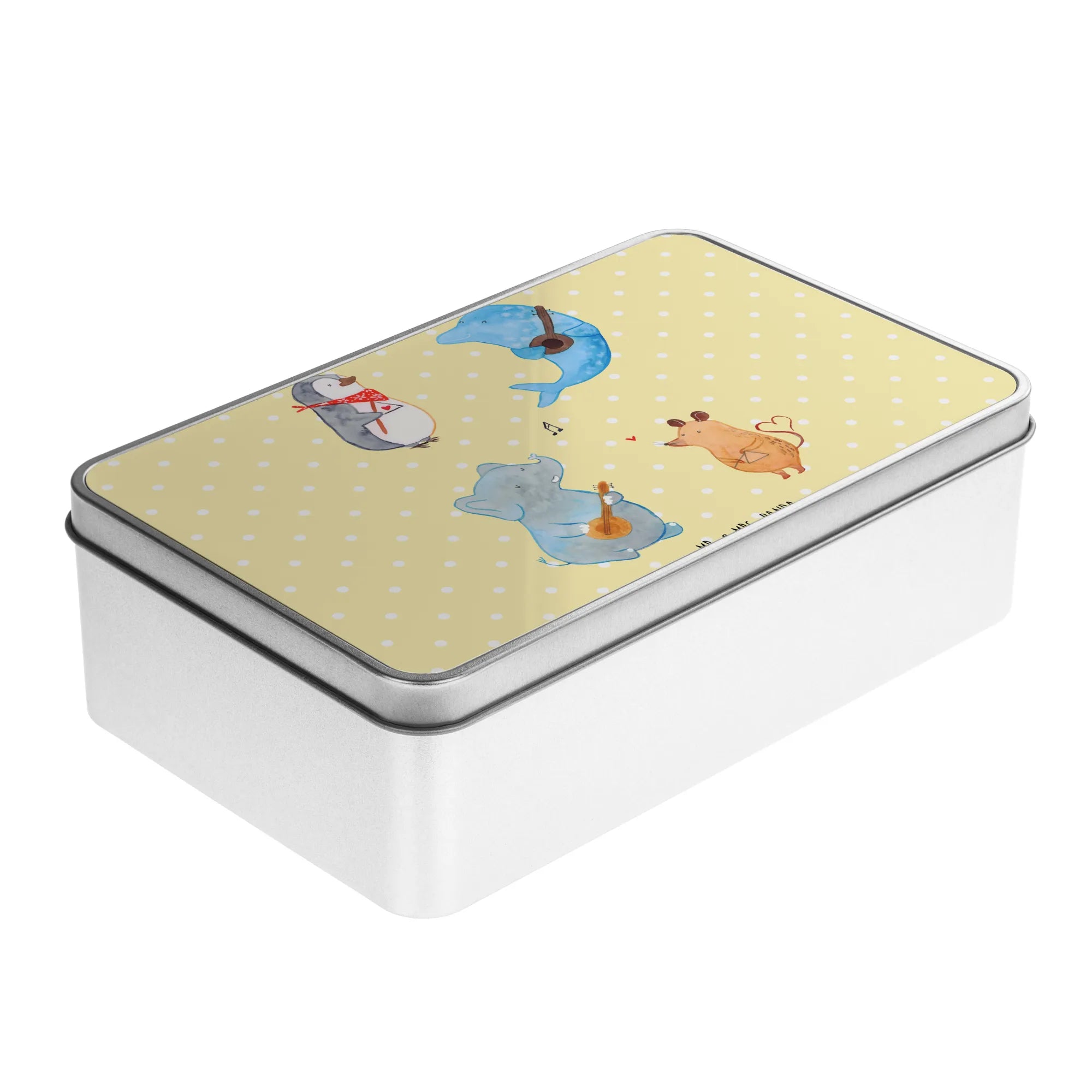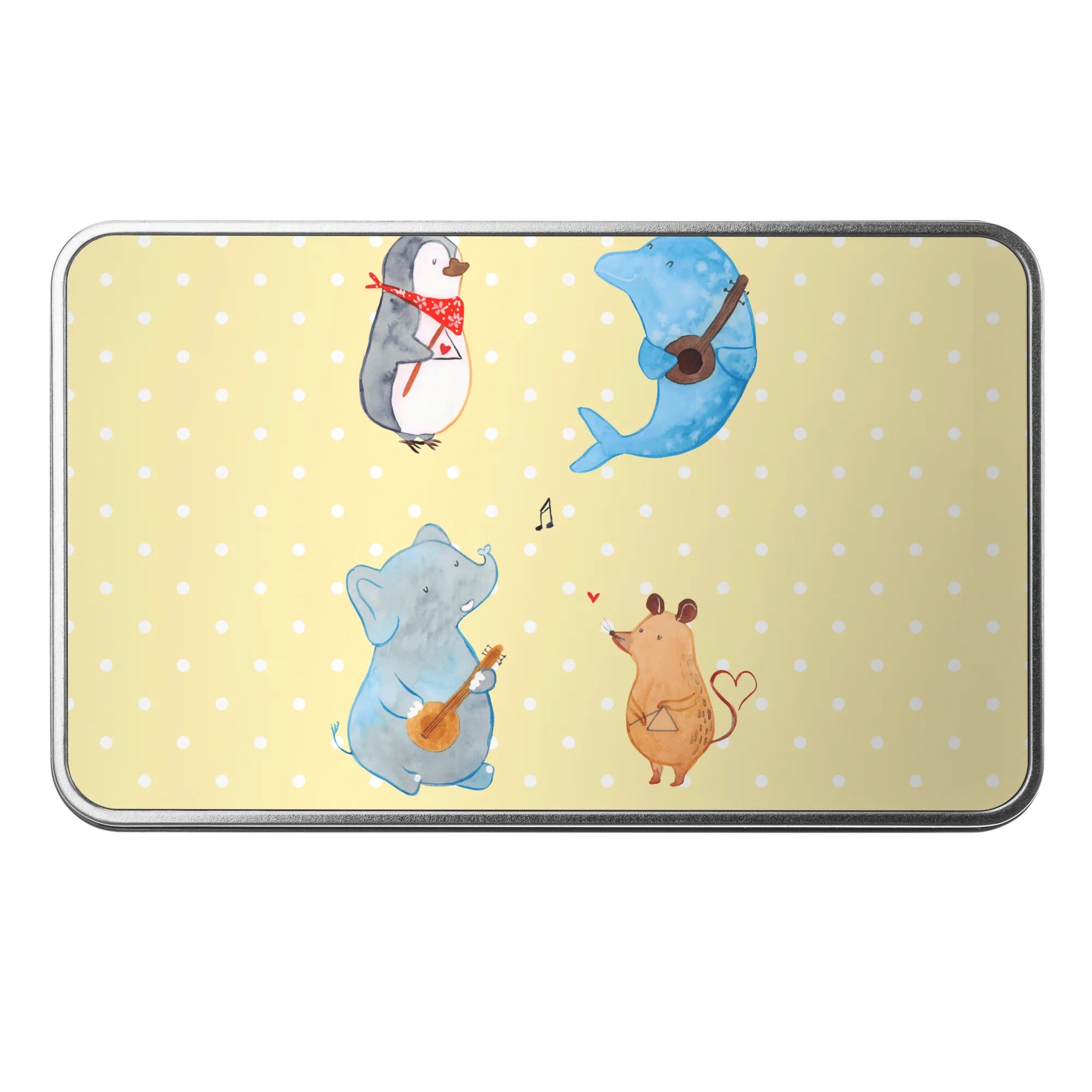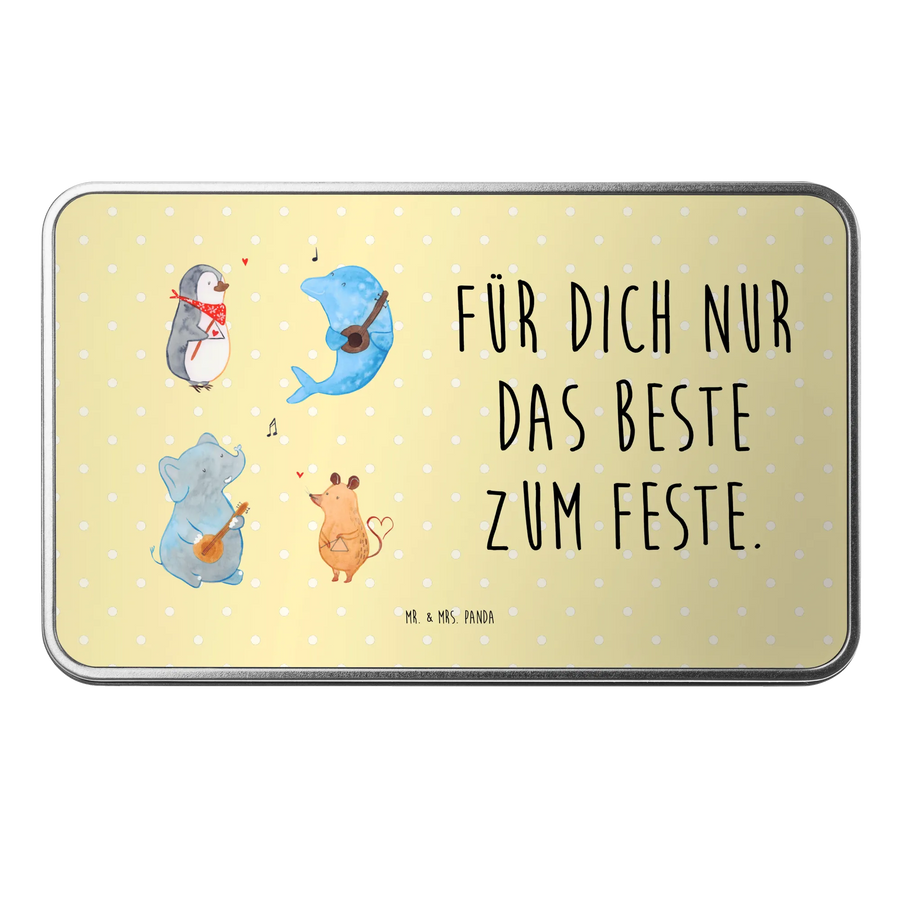 Lass dich von den fröhlichen Charakteren, einem Pinguin, einer Maus, einem Delfin und einem Elefanten, die begeistert zusammen musizieren, mitreißen! Die Metalldose ist stabil, hochwertig und besonders glänzend – perfekt für die nachhaltige Aufbewahrung.