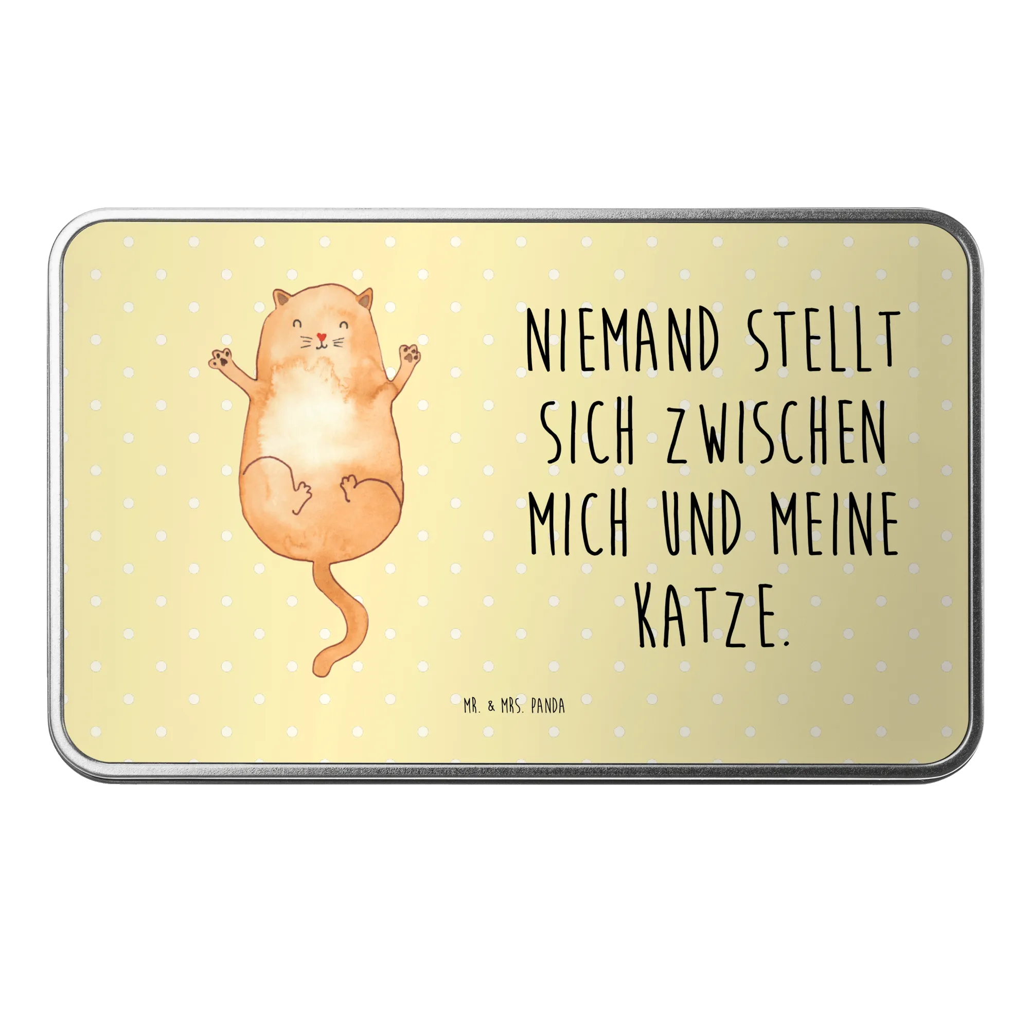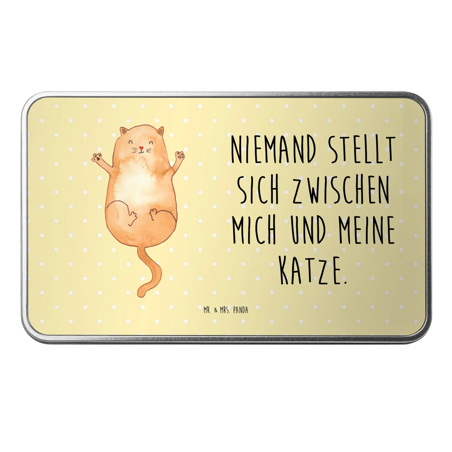 Mr. & Mrs. Panda Metalldose "Katzen Umarmen" – ein kleines Schmuckstück aus unserer Katzen - Kollektion. Die pastellige gelbe Oberfläche und das handgezeichnete Aquarellmotiv einer Katze, die sich von Herzen ausbreitet, bringen Liebe und Wärme in jede Küche und jedes Wohnzimmer. 😺