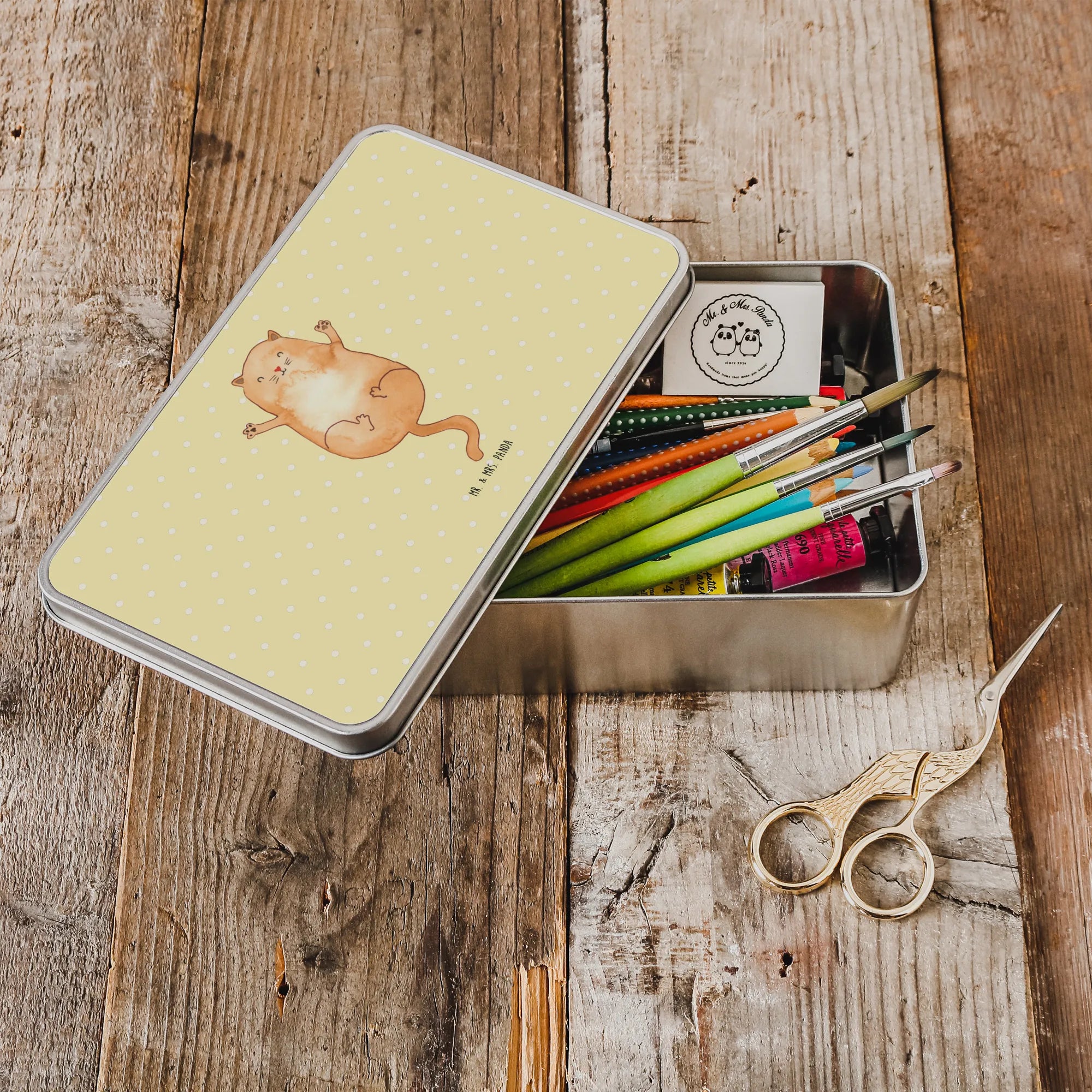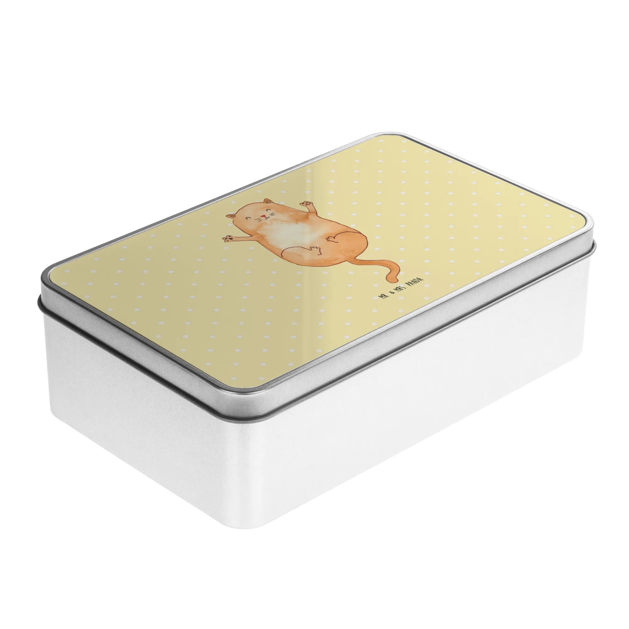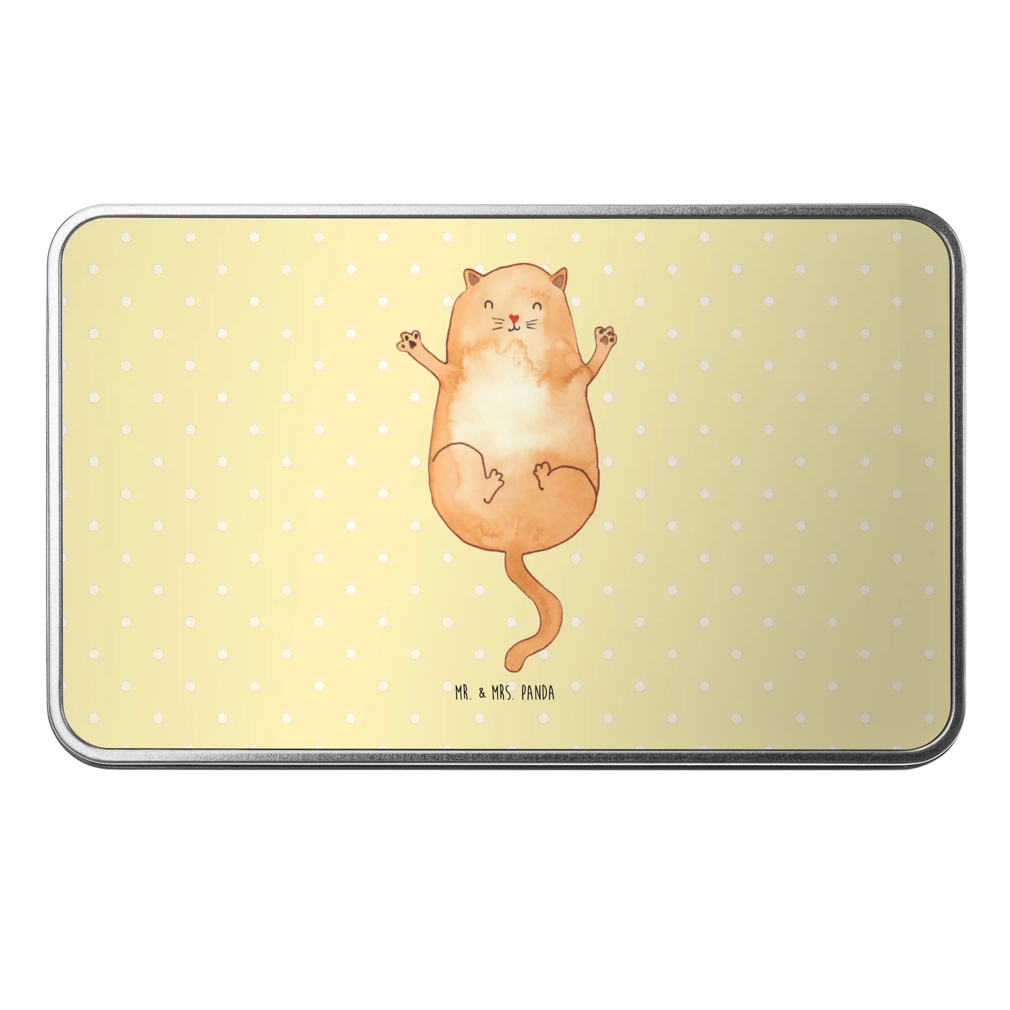 Hergestellt aus hochwertigem Metall, überzeugt die Dose nicht nur durch ihre besondere Stabilität, sondern auch durch ihre lebendige Farbauswahl in Pastellgelb. Mit den Maßen von 187 mm x 125 mm x 36 mm bietet sie genügend Platz für Kekse, Snacks oder die schönsten Erinnerungen, die Du sammeln möchtest. Die aufwendige Handzeichnung von Mrs. Panda zeigt eine süße Katze, die ihre Arme freudig ausbreitet – perfekt, um jedem Raum eine Portion Katzenliebe zu verleihen.
