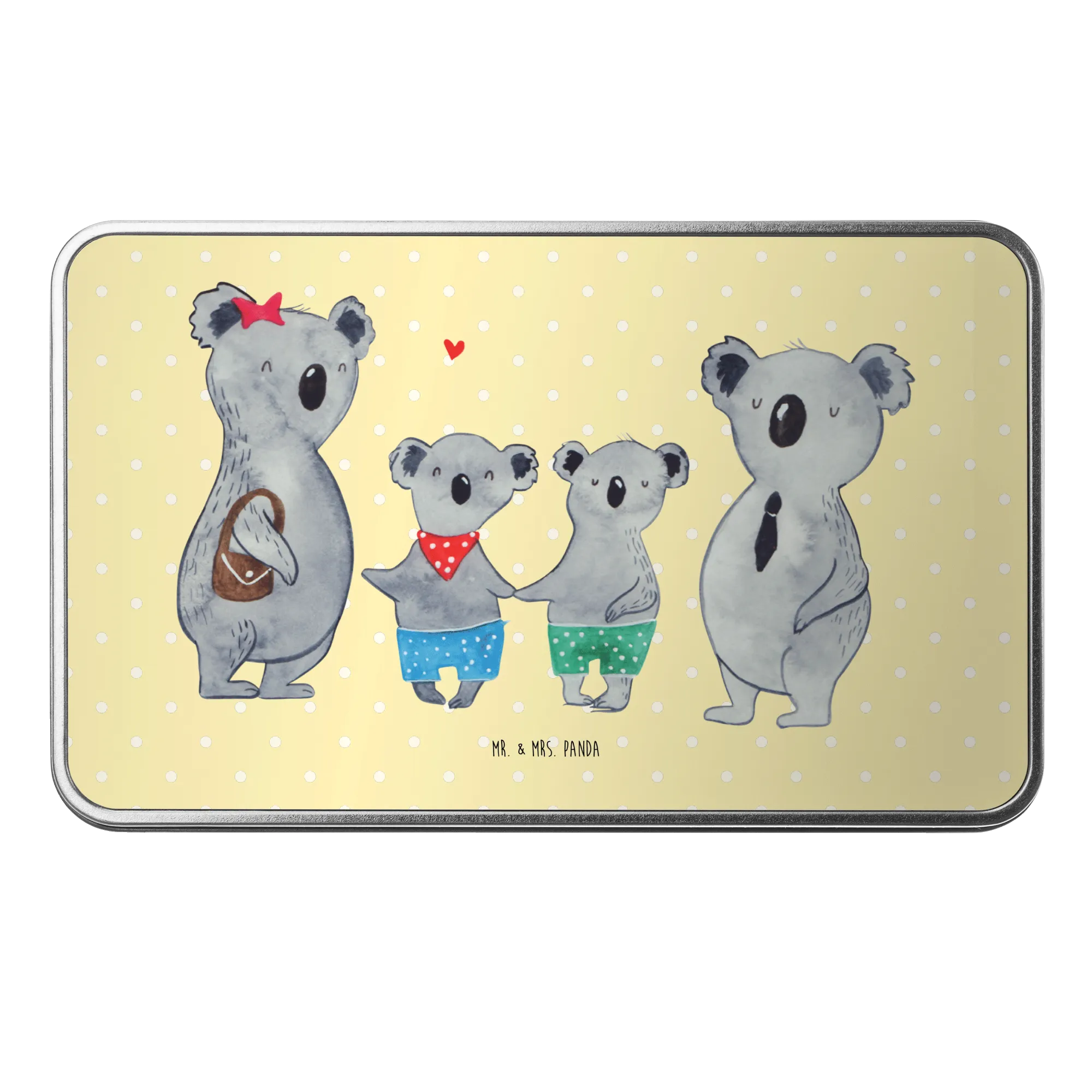 Die wunderschöne rechteckige Metalldose mit dem Motiv 'Koala Familie zwei' von Mr. & Mrs. Panda ist das perfekte Geschenk für deine Familie! Egal ob zum Vatertag, Muttertag oder einfach so, mit dieser Dose bringst du garantiert ein Lächeln auf die Gesichter deiner Liebsten. Die Dose ist aus hochwertigem Metall gefertigt und strahlt in einem glänzenden Design.
