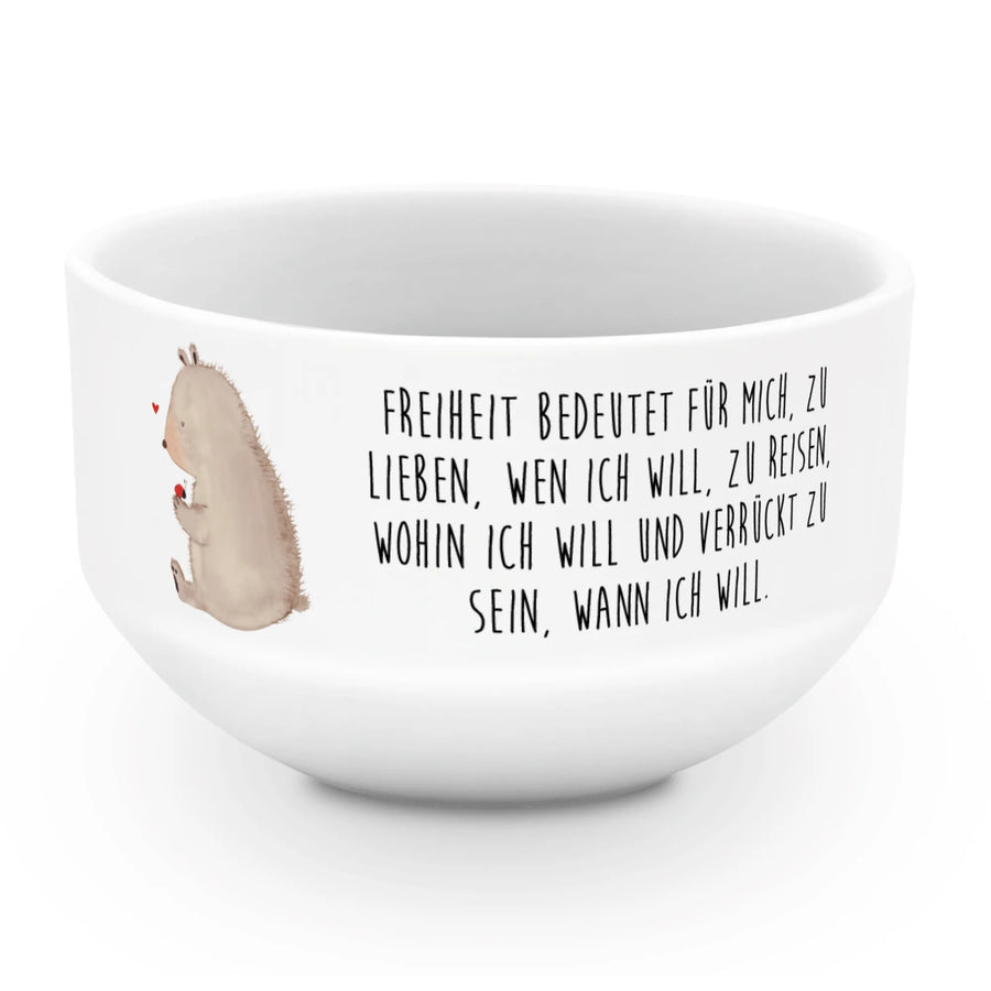 Vor allem an besonderen Anlässen wie Geburtstagen, Valentinstag oder einfach als Überraschung zwischendurch wird die Müslischale "Bär mit Marienkäfer" sicher für leuchtende Augen sorgen. Der liebevolle Spruch "Freiheit bedeutet für mich, zu lieben, wen ich will, zu reisen, wohin ich will und verrückt zu sein, wann ich will." bringt eine wunderschöne Botschaft mit sich, die dich und deine Lieben inspirieren kann. Die Schale ist handgefertigt, sodass jedes Stück einzigartig ist.