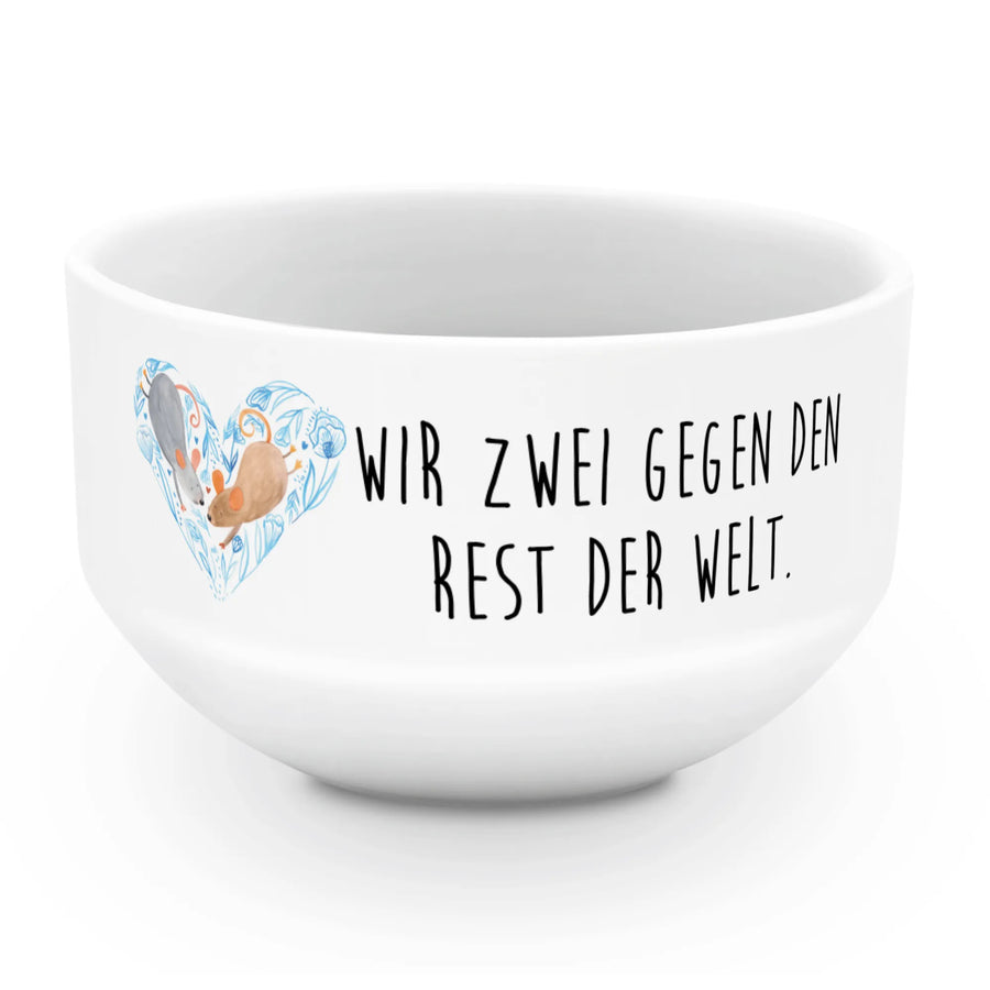 Jede Müslischale ist mit dem liebevollen Spruch "Wir zwei gegen den Rest der Welt" versehen, der eure innige Beziehung unterstreicht. Egal, ob du ein leckeres Müsli am Morgen, Snacks am Nachmittag oder einen süßen Nachtisch genießen möchtest, diese Schüssel ist vielseitig einsetzbar. Die ideale Größe von 135 mm Durchmesser und 135 mm Höhe bietet genügend Platz für all deine Lieblingsspeisen.