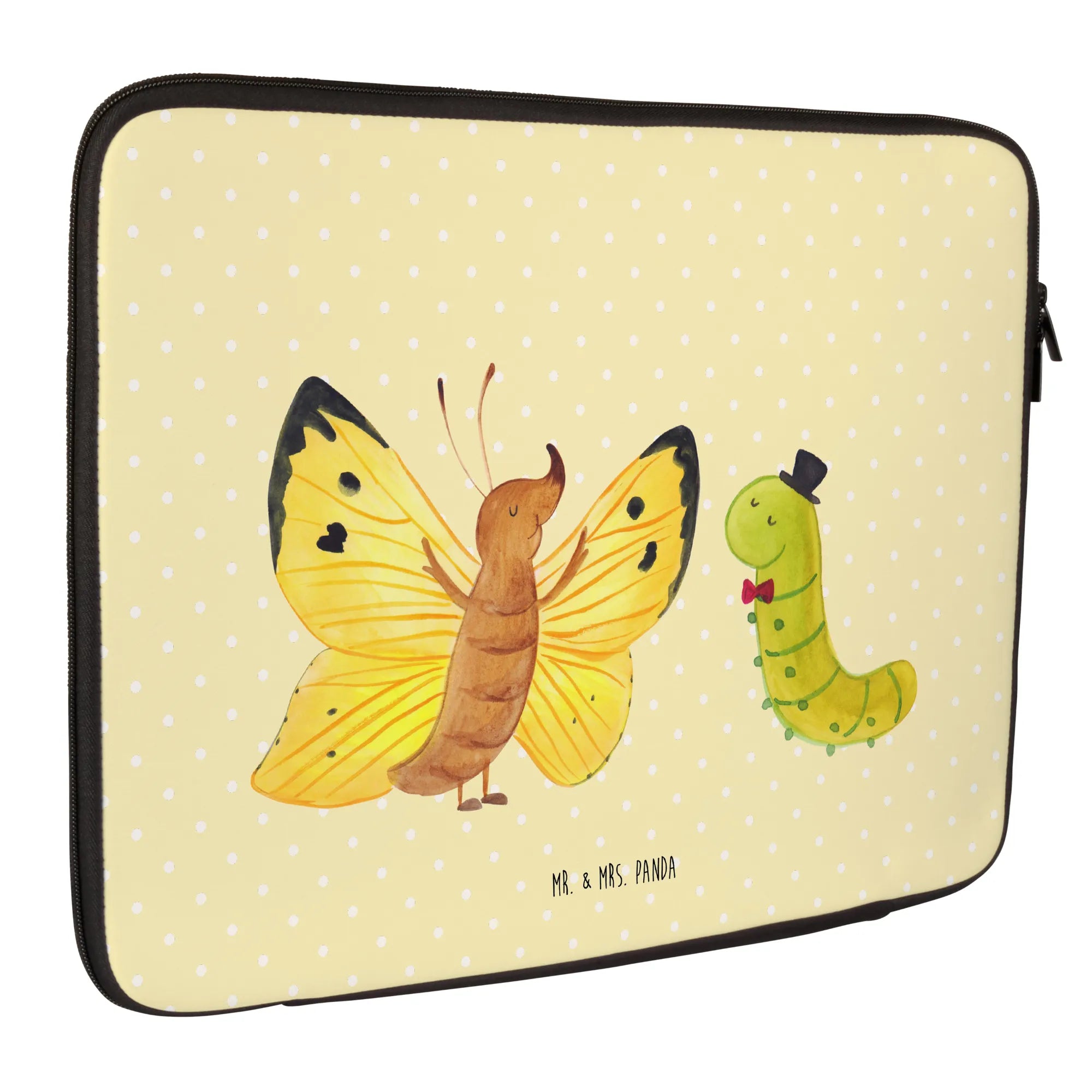 Die Notebook Tasche mit dem süßen Motiv von Raupe & Schmetterling ist die perfekte Wahl für alle, die ihr Laptop oder Notebook sicher und stilvoll transportieren möchten.