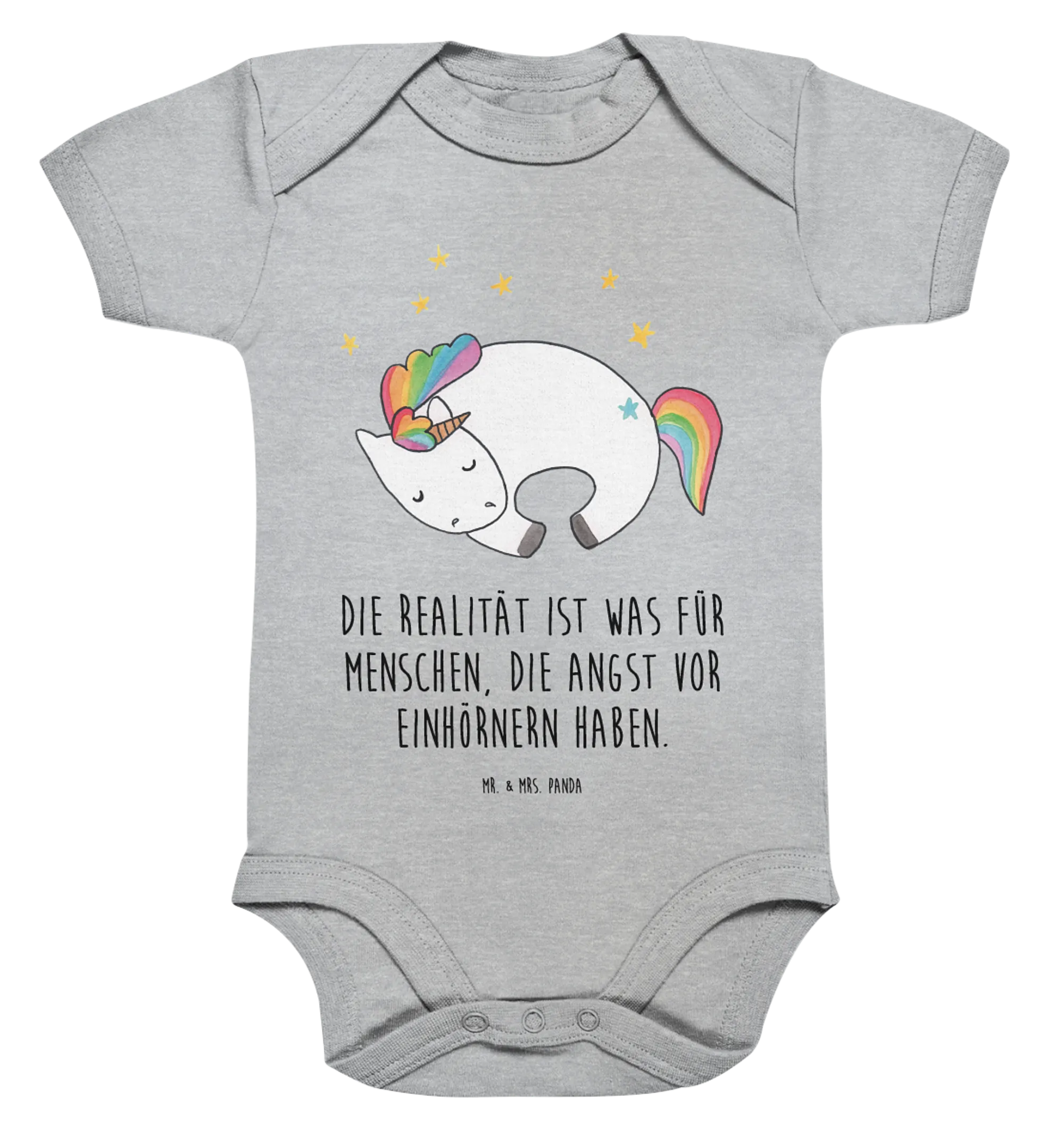Der Organic Baby Body "Einhorn Nacht" aus der zauberhaften Einhorn-Kollektion von Mr. & Mrs. Panda ist das perfekte Geschenk für alle kleinen Träumer und deren Eltern! Hergestellt aus 100% hochwertiger Öko Baumwolle, sorgt er nicht nur für einen wunderschönen Look, sondern auch für höchsten Komfort und ein angenehmes Gefühl auf der zarten Babhaut. Das süße Design mit dem schlafenden Einhorn und dem Spruch "Die Realität ist was für Menschen, die Angst vor Einhörnern haben" macht diesen Strampler zu einem absoluten Hingucker!