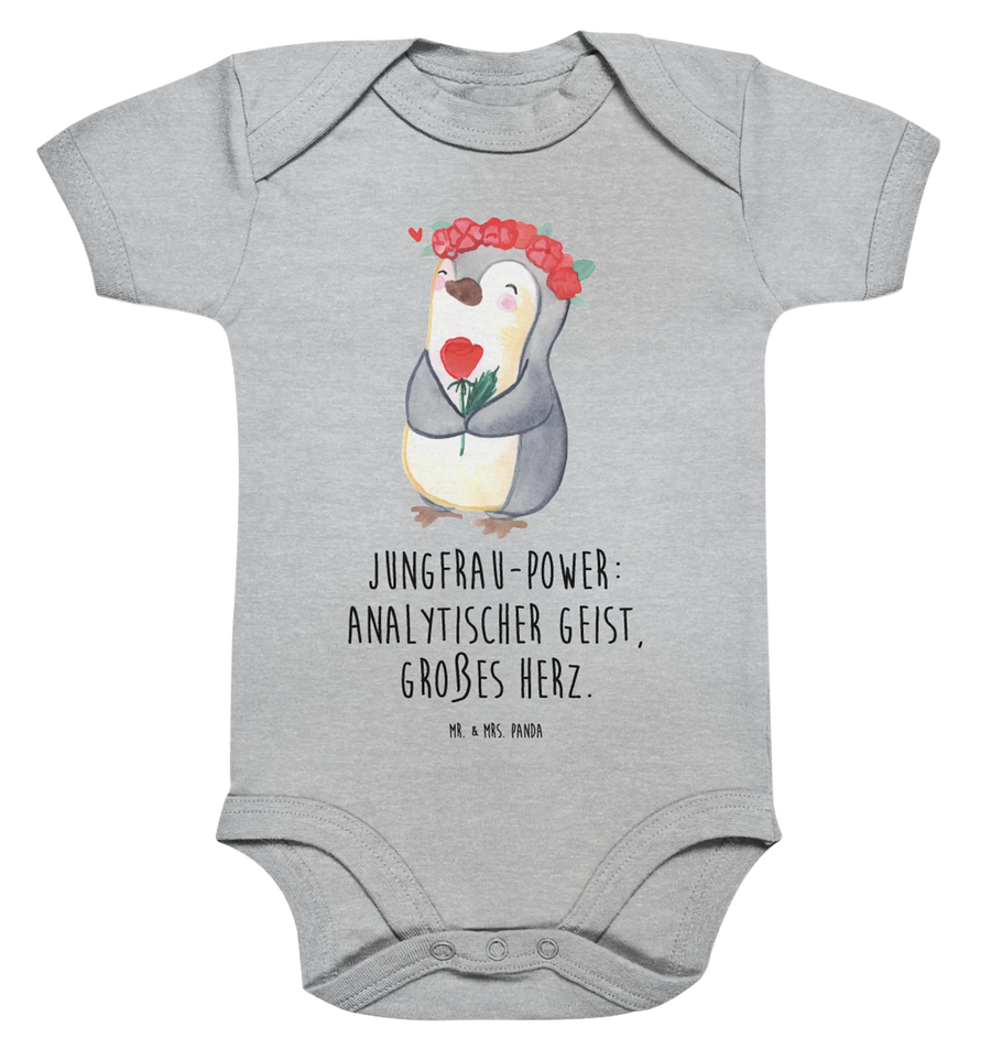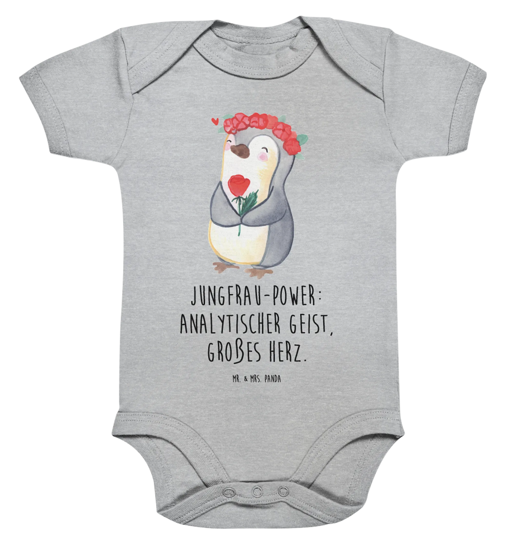 Der Body zeigt einen entzückenden Pinguin mit einem Blumenkranz, der eine wunderschöne Blume in seinen Flossen hält. Das süße Design und der Slogan 'Jungfrau-Power: Analytischer Geist, großes Herz.' bringen das Element Erde und das astrologische Merkmal der Jungfrau perfekt zur Geltung.