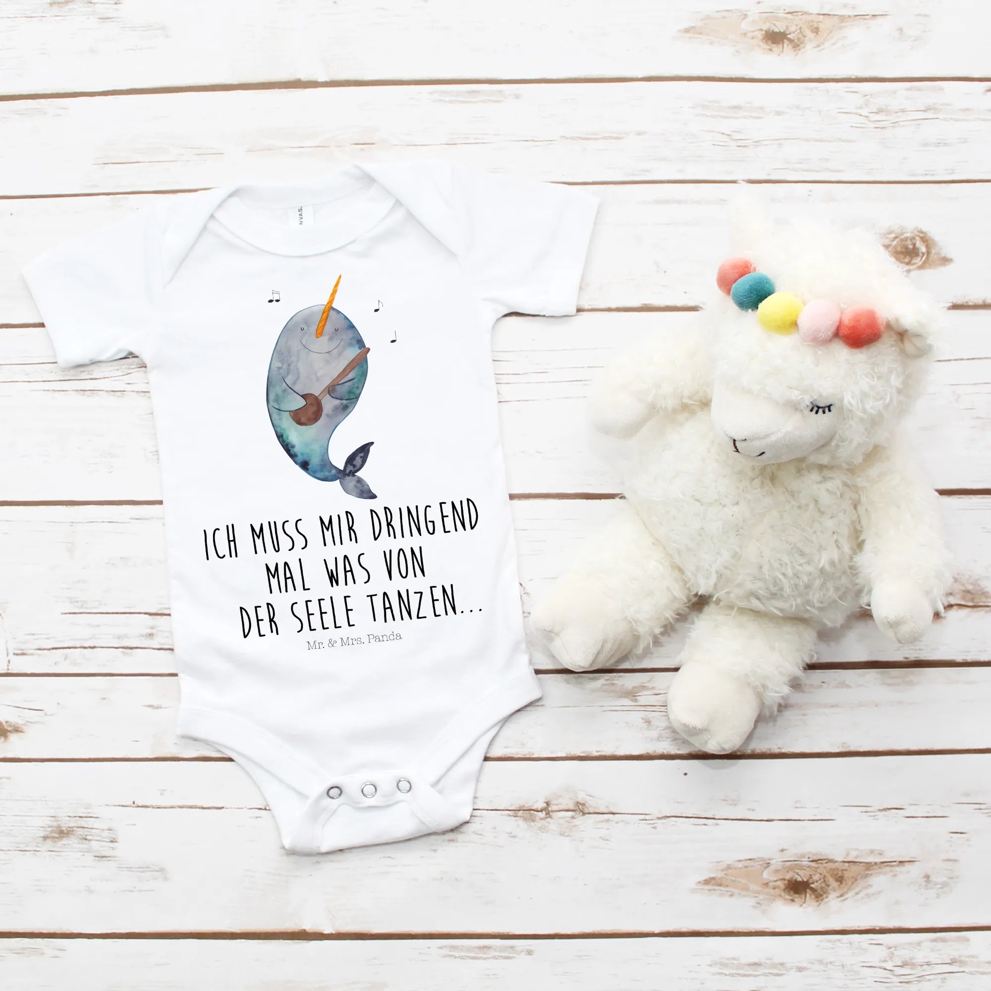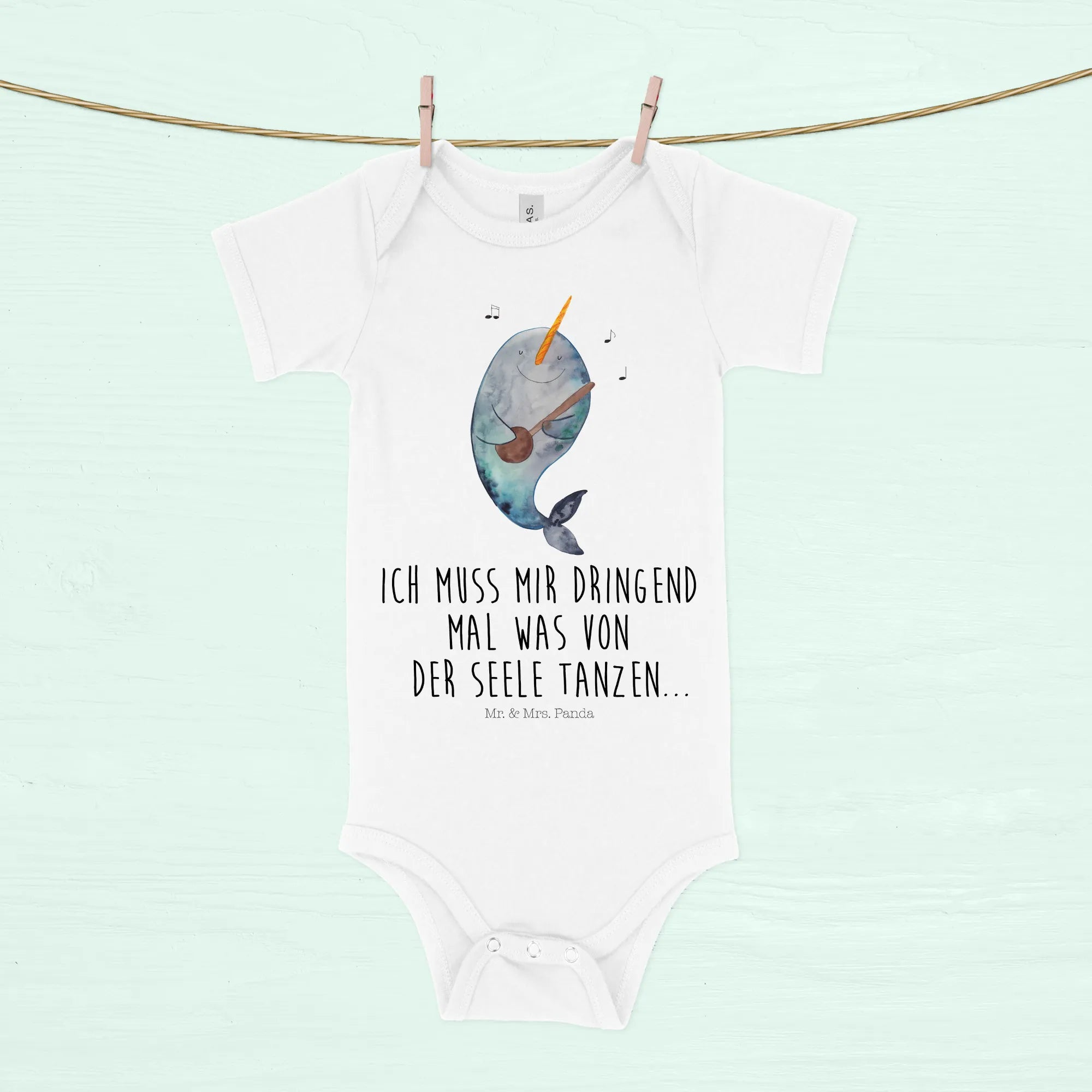 Mit einem originellen Slogan wie „Ich muss mir dringend mal was von der Seele tanzen“ spricht dieser Babystrampler auch die Bedürfnisse der Neugeborenen an, die ihre frischen Eindrücke verarbeiten. Der Narwal, ein Symbol für das Meer und die Freude am Leben, ist der perfekte Begleiter für Dein Baby.