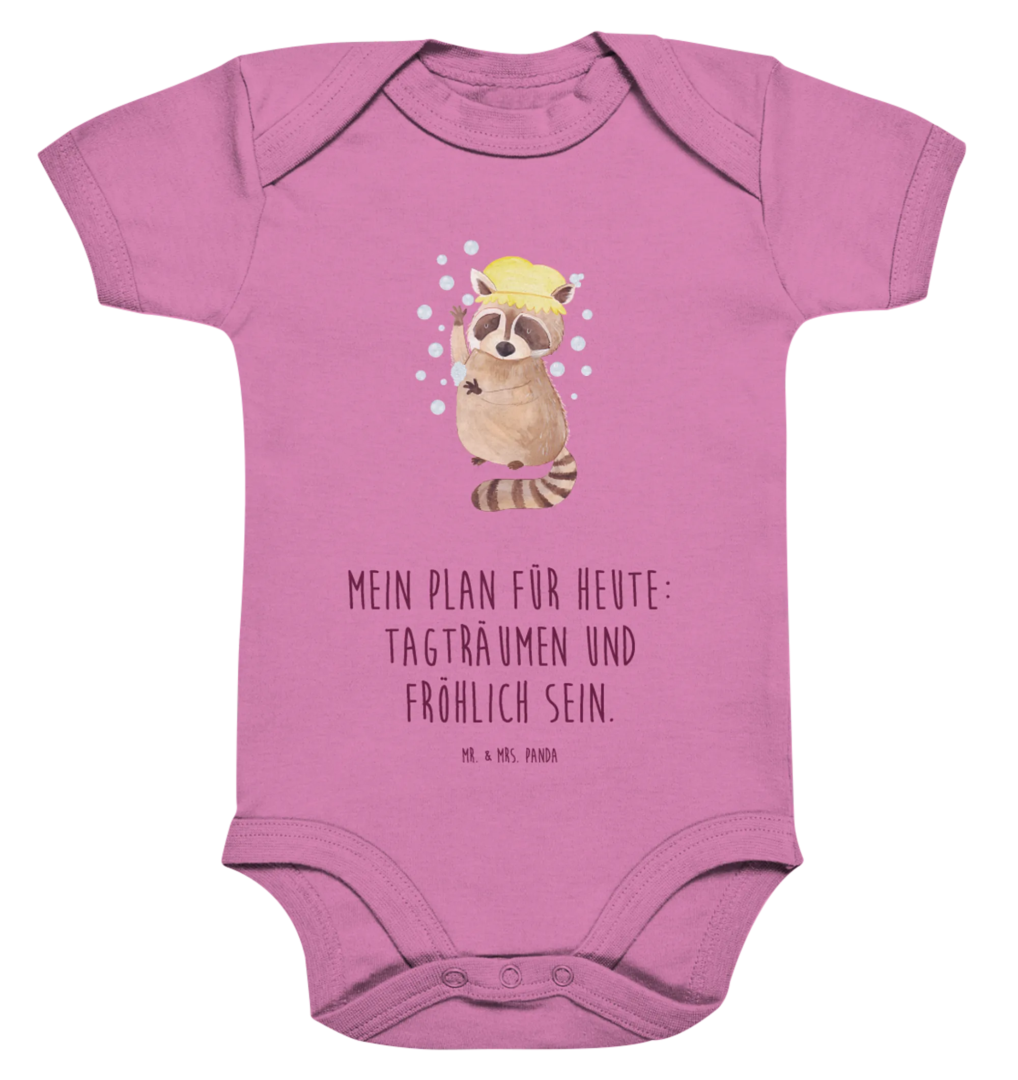 Der niedliche Waschbär, der auf dem Body prangt, ist nicht nur ein echter Hingucker, sondern auch ein treuer Begleiter für kleine Träumer und Abenteurer. Mit dem Slogan „Mein Plan für heute: Tagträumen und fröhlich sein.“ bringt der Body die positive Einstellung des kindlichen Spielens und Entdeckens perfekt zum Ausdruck.