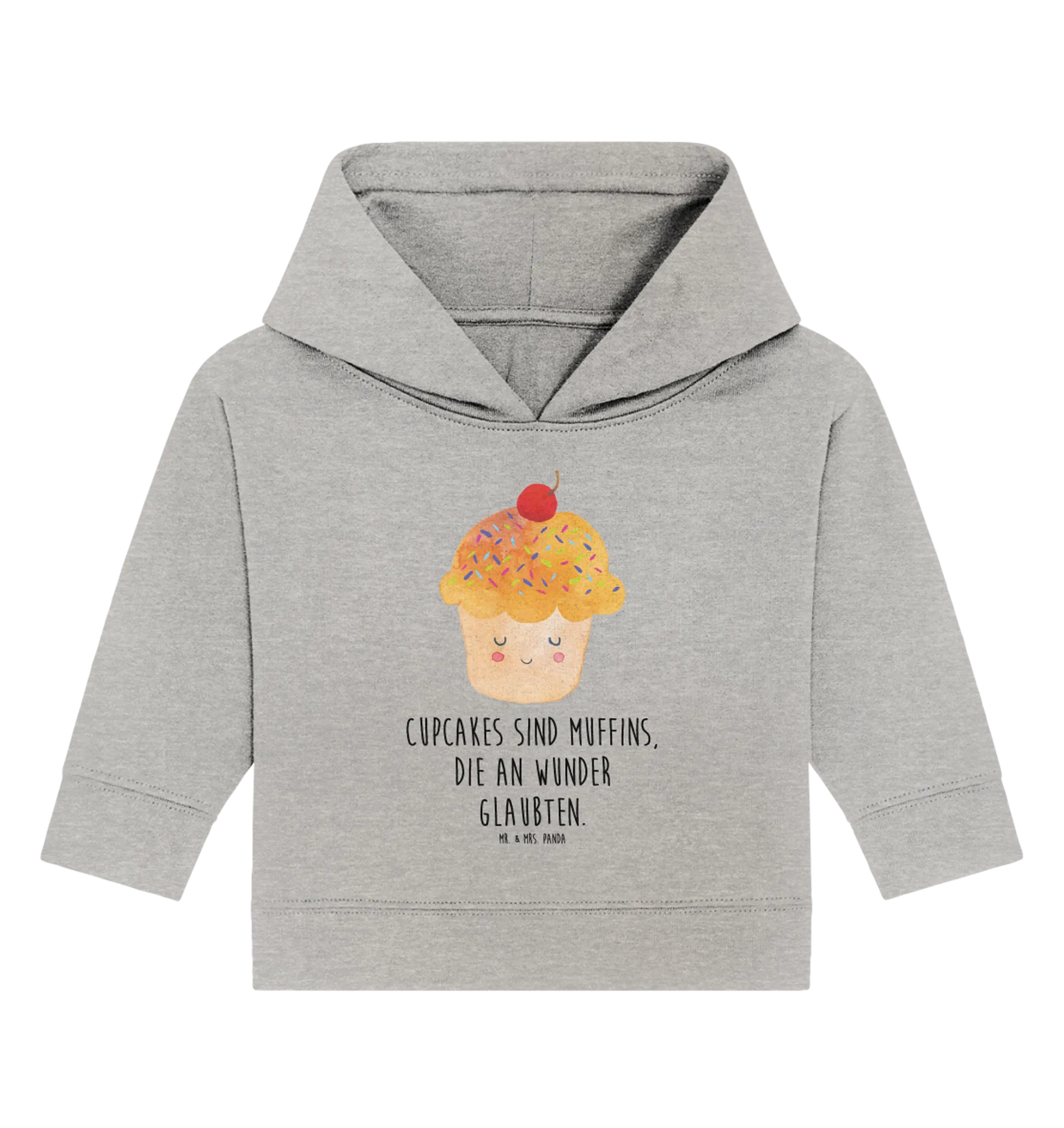 Hergestellt aus hochwertiger, ökologischer Baumwolle, bietet dieses Hoodie ein besonders sanftes Gefühl auf der zarten Babyhaut. Das fröhliche Cupcake-Motiv, welches von Mrs. Panda mit viel Liebe gestaltet wurde, zeigt einen stolzen Cupcake mit bunten Streuseln und einem herzlichen Lächeln. Es ist inspirierend und strahlt Lebensfreude aus, so wie die Botschaft: 'Cupcakes sind Muffins, die an Wunder glaubten.'