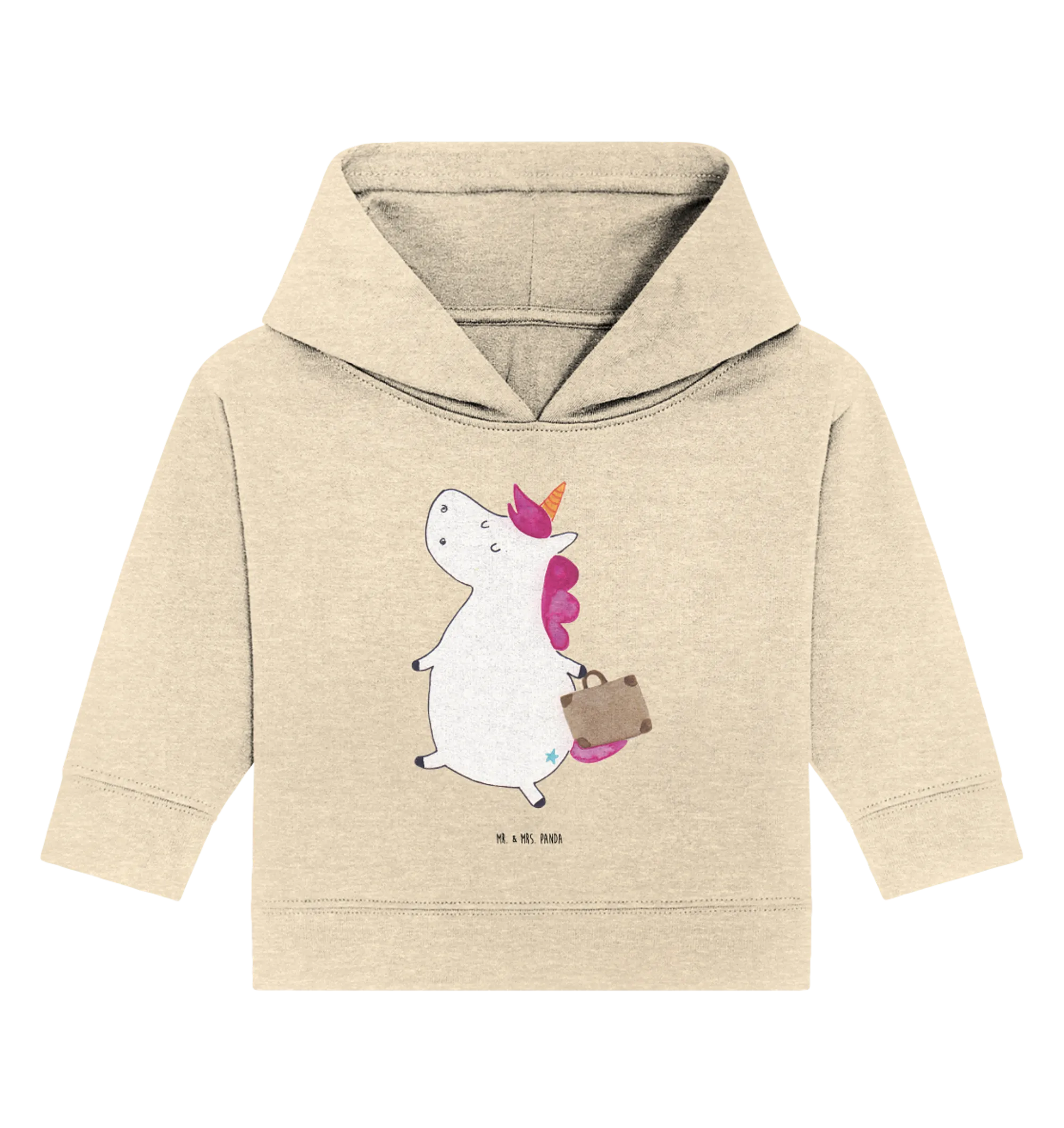 Willkommen in der zauberhaften Welt von Mr. & Mrs. Panda! Unser Organic Baby Hoodie mit dem süßen Einhorn Koffer Motiv ist das perfekte Geschenk für Kinder, die das Reisen und Abenteuerlust lieben!