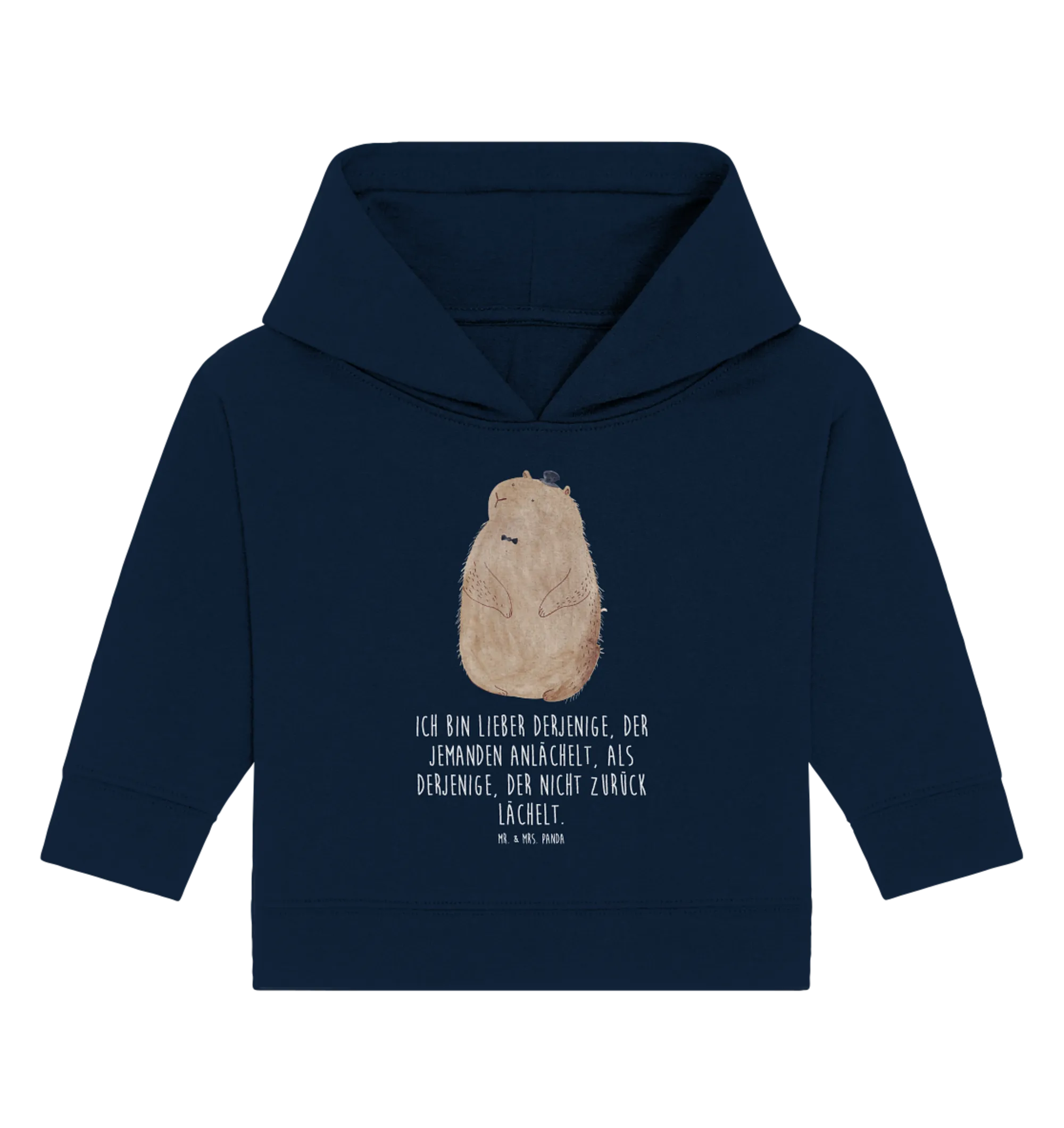 Entdecke das bezaubernde Organic Baby Hoodie mit dem süßen Murmeltier aus der Small World Kollektion von Mr. & Mrs. Panda! Dieses Kapuzenshirt ist nicht nur unglaublich weich und bequem, sondern auch ein echter Hingucker. Das fröhliche Murmeltier mit dem kleinen Zylinder zaubert jedem ein Lächeln ins Gesicht. Die Botschaft "Ich bin lieber derjenige, der jemanden anlächelt, als derjenige, der nicht zurück lächelt" vermittelt eine positive Lebenshaltung, die von klein auf gefördert werden sollte.
