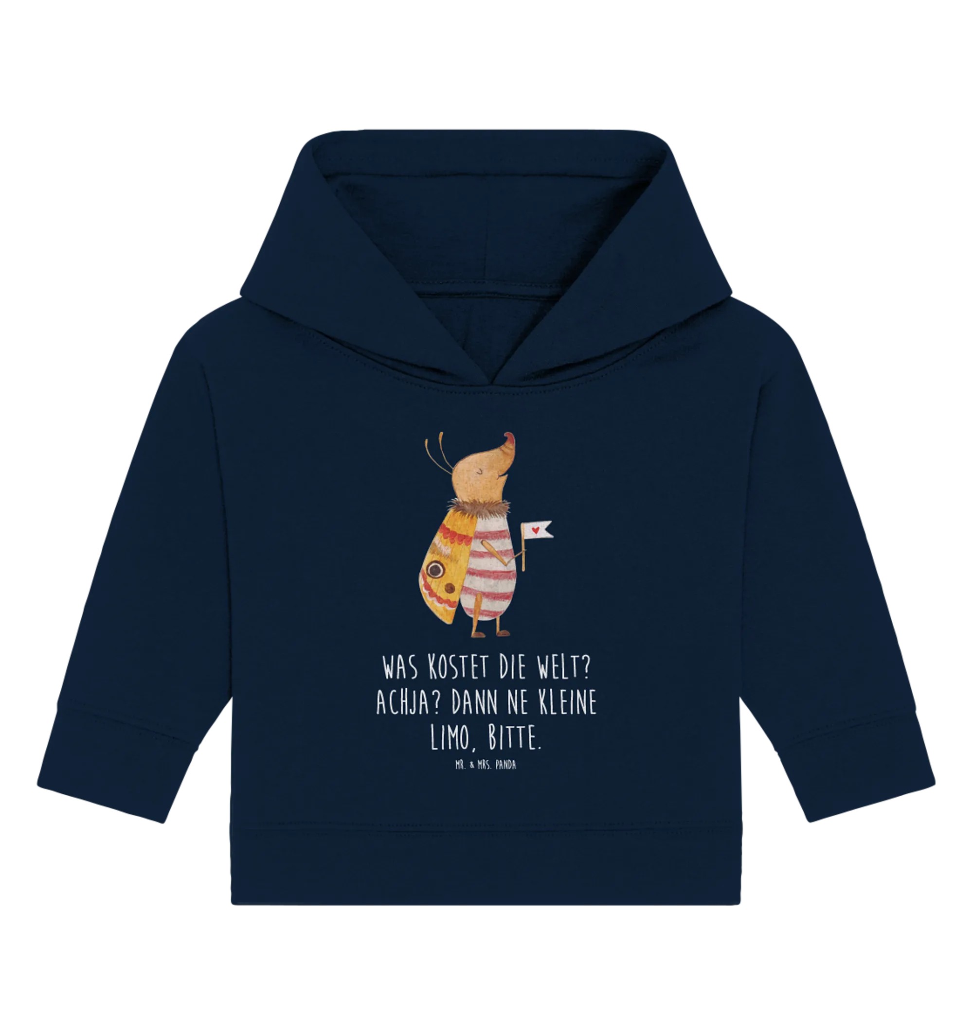 Dieser Kapuzenpulli eignet sich hervorragend als Geschenk zur Geburt, zur Taufe oder auch zum ersten Geburtstag. Alle werden neidisch auf den kleinen Nachtfalter mit den witzigen Sprüchen voller guter Laune sein: „Was kostet die Welt? Achja? Dann ne kleine Limo, bitte.“