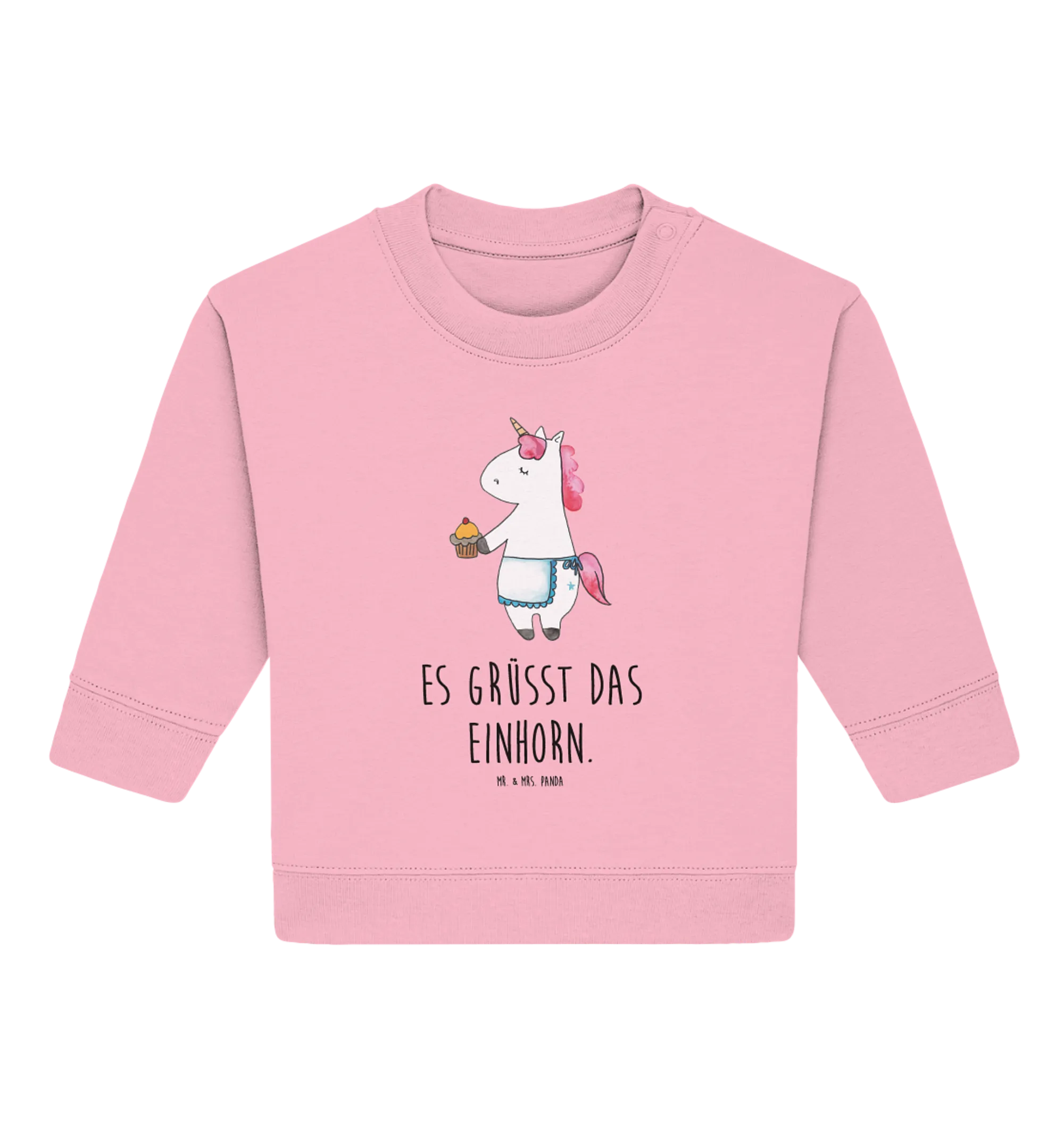 Gestaltet mit einem niedlichen Einhorn, das stolz einen selbst gebackenen Muffin präsentiert, macht er jeden Tag zum Besonderen. Wer liebt nicht die süßen Grüße von einem Einhorn? Dieser Baby Pullover stammt aus unserer beliebten Einhorn-Kollektion, die mit viel Hingabe von Mrs. Panda handgezeichnet wurde.