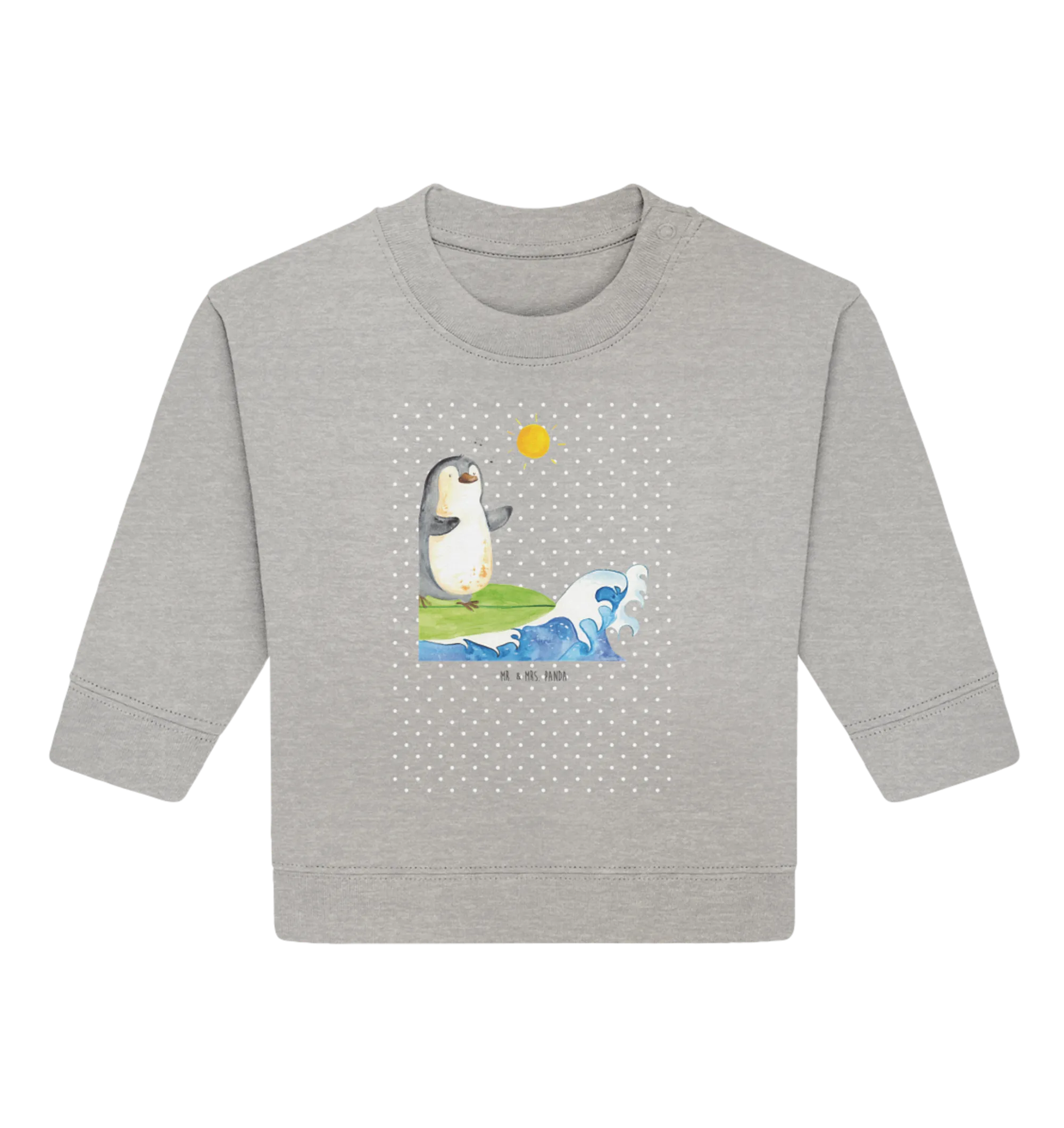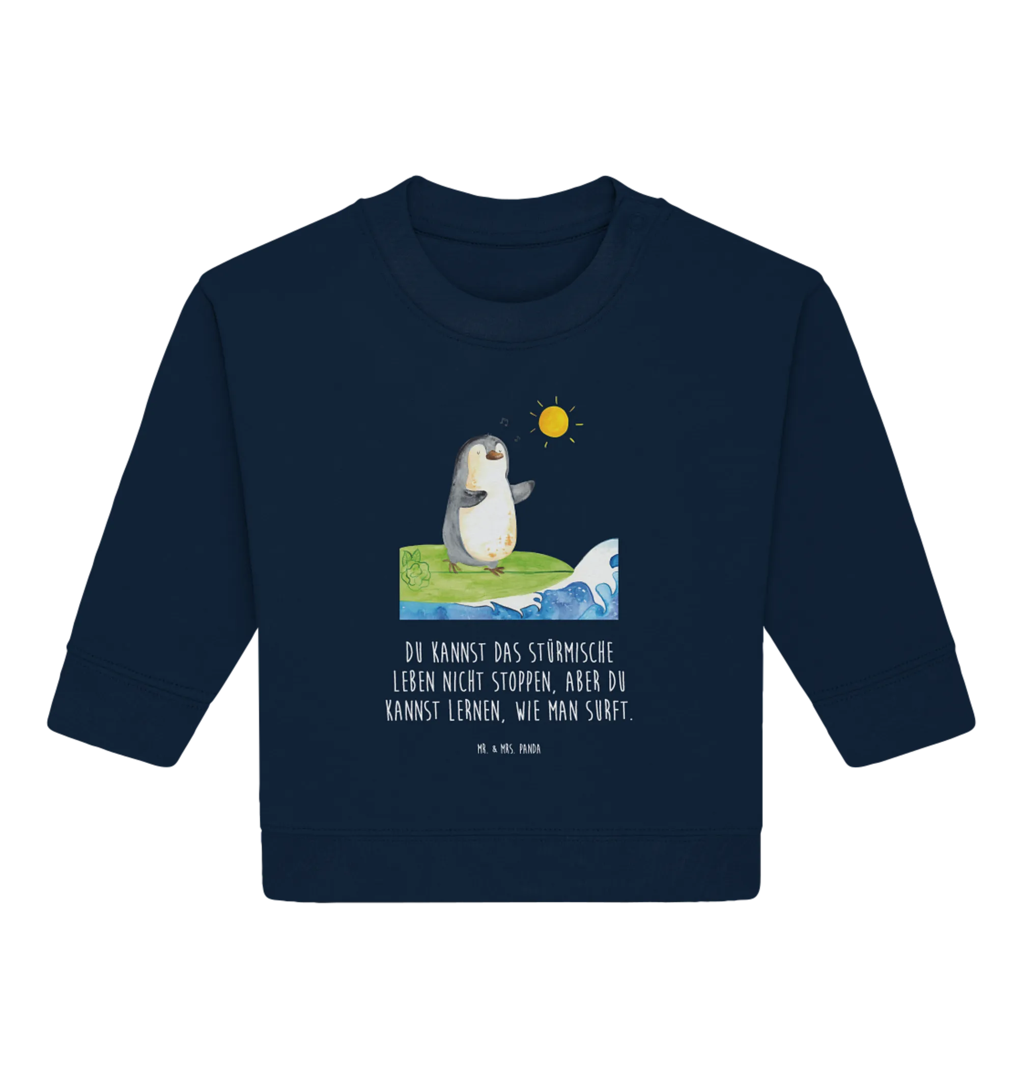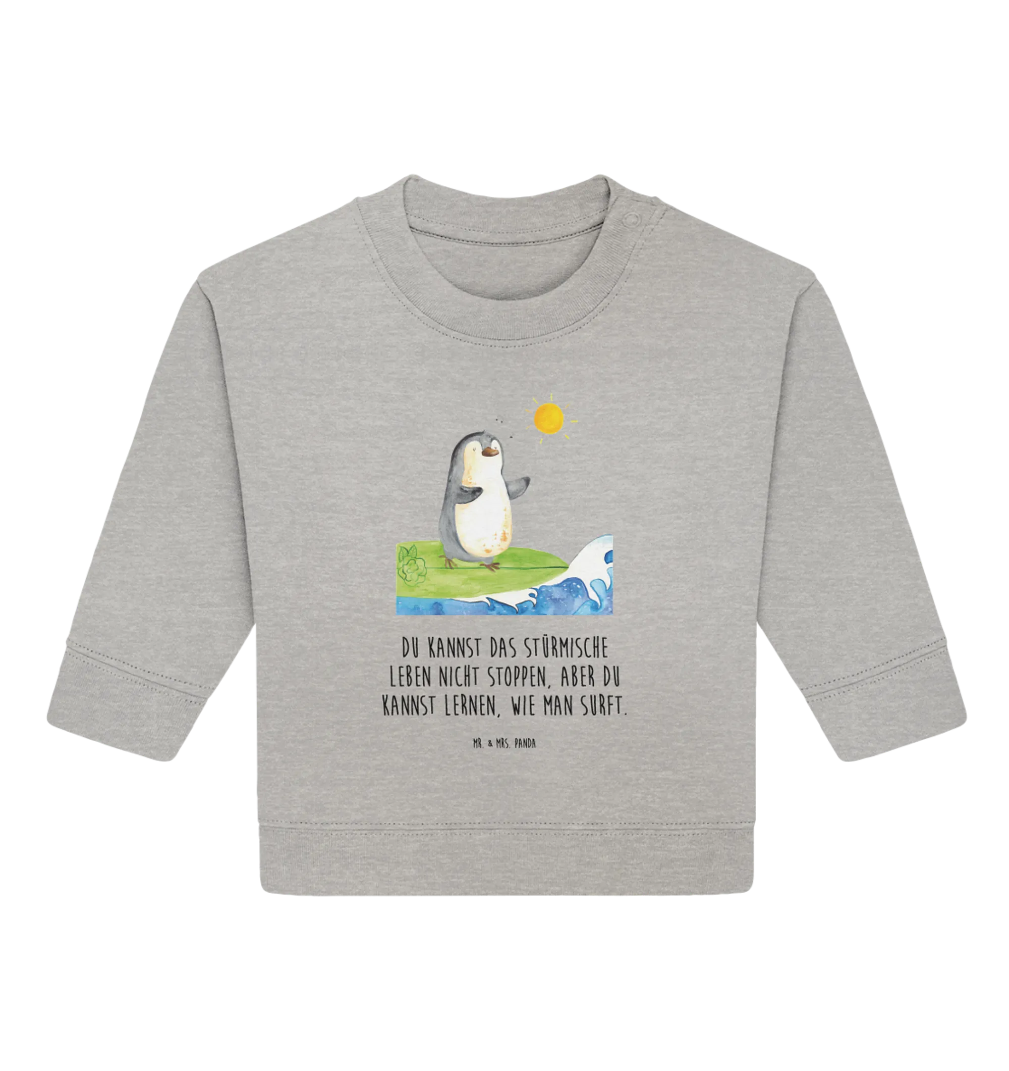 Der Organic Baby Pullover mit dem süßen Pinguin Surfer Motiv aus der Pinguin - Kollektion von Mr. & Mrs. Panda ist das ideale Geschenk für kleine Abenteurer und Surfer in spe!